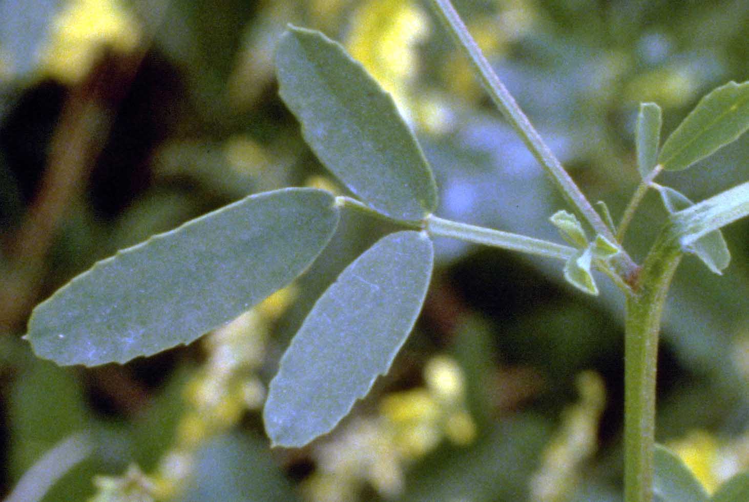 Foglie: le foglie, brevemente picciolate, trifogliate, hanno segmenti obovato ellittici con la base cuneata ma ottusa e l’apice arrotondato, lunghi 1-1,5 cm, dentellati irregolarmente ai margini con esclusione della base che è intera. Le foglie superiori hanno foglioline simili ma di forma lanceolata con base acuta. Alla base delle foglie, all’inserzione del fusto, sono presenti due stipole fogliacee, intere, lesiniformi.