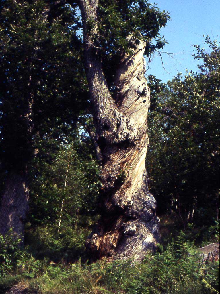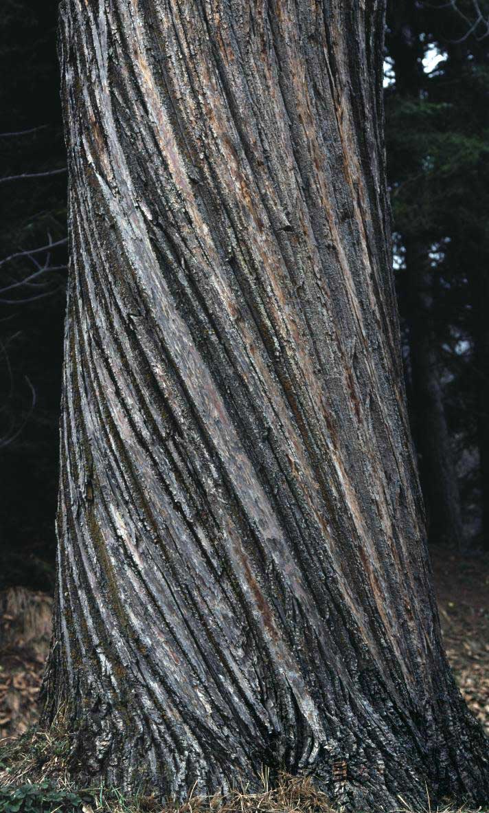 Habitus: albero alto fino a 25 m, molto longevo, con chioma espansa, rotondeggiante o globosa. Il tronco nei vecchi esemplari diventa possente raggiungendo 10 e più metri di circonferenza (vedi oltre, Monumenti viventi). La corteccia è grigio olivastra, liscia e quasi lucente nei giovani tronchi, poi, negli esemplari adulti, diviene di colore grigio bruno scura, spessa, rugosa fessurandosi profondamente in lunghi cordoni che si sviluppano verticalmente lungo il tronco con andamento a spirale sinistrorsa.