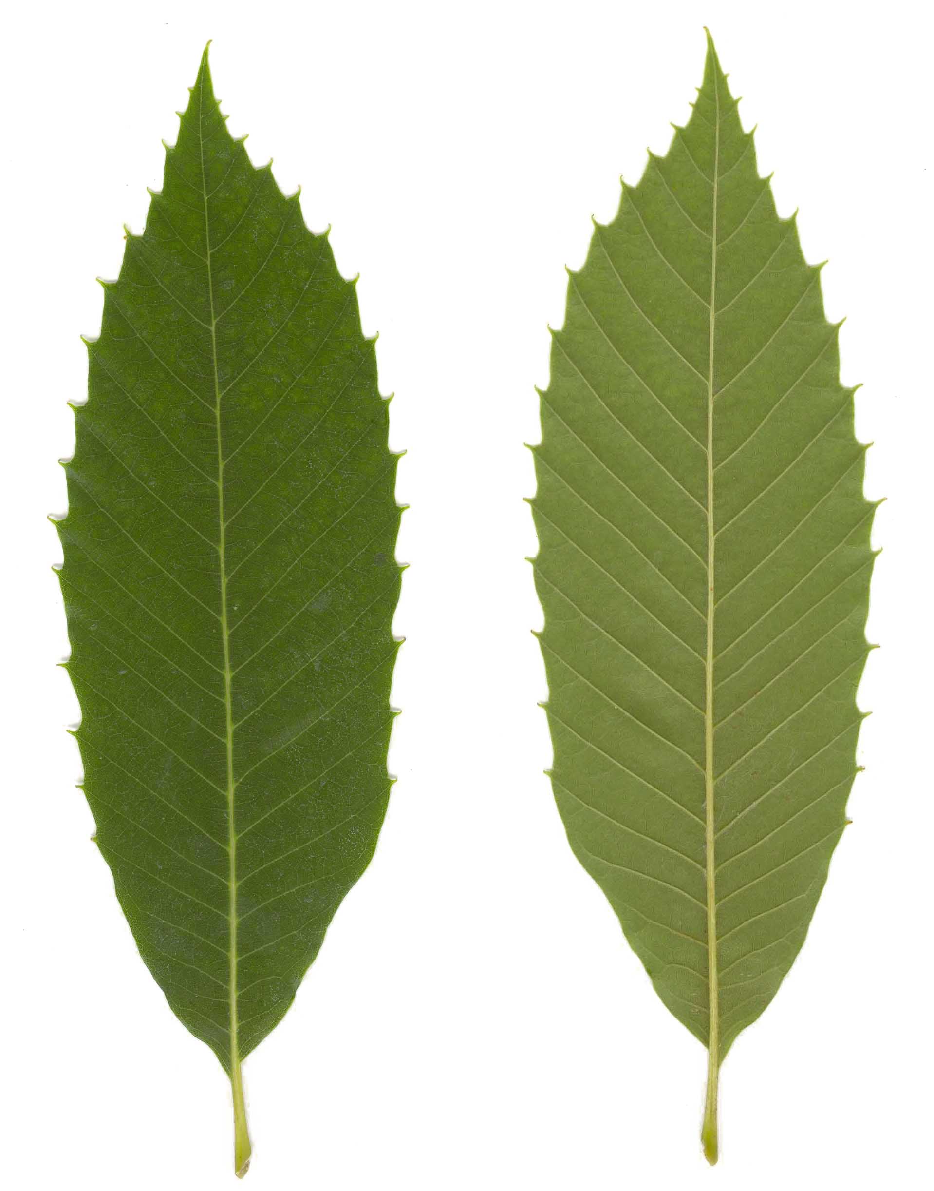 Foglie: lunghe 10-20 cm, sono decidue, alterne, con picciolo corto, lembo lanceolato allungato, verde scuro e un po’ lucide sulla pagina superiore, verde chiaro e opache sulla pagina inferiore, acuminato-subcaudate all’apice, presentano nervature laterali diritte e parallele che terminano in denti forti e appuntiti.