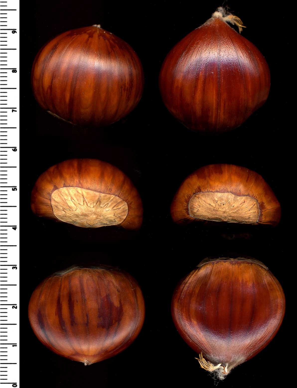Semi: il seme è un achenio (la castagna), con pericarpo di consistenza cuoiosa e colore marrone, glabro e lucido all'esterno, tomentoso all'interno. La forma è più o meno globosa, con un lato appiattito, detto pancia, e uno convesso, detto dorso. Il polo apicale termina in un piccolo prolungamento frangiato, detto torcia, mentre il polo prossimale, detto ilo, si presenta leggermente appiattito e di colore grigiastro. Sul dorso sono presenti delle striature più o meno marcate, in particolare nelle varietà del gruppo dei marroni.