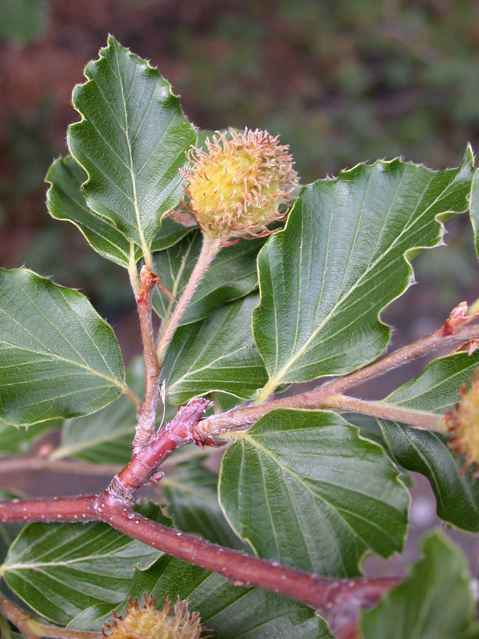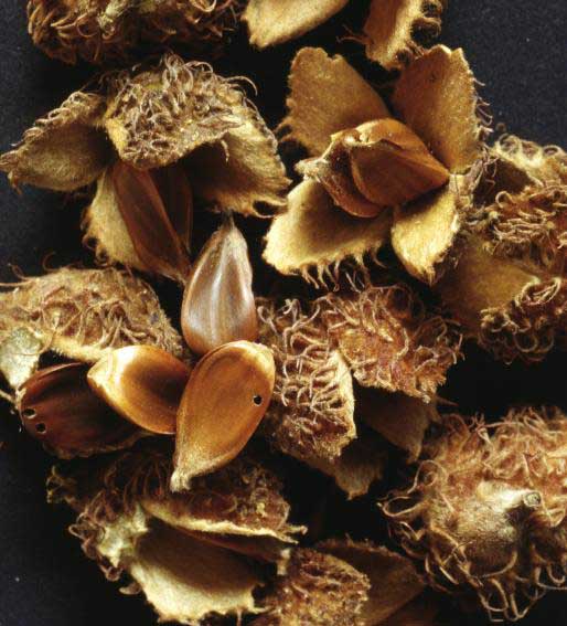 Fiore: infiorescenze in amenti fiorali unisessuali, penduli, con asse pubescente, i maschili in glomeruli allungati con fiori non stipati. Fiori maschili all’ascella di piccole brattee lanceolate, con perigonio di 5-9 tepali lanceolati, giallastri, ciliati, ed androceo di almeno 8 stami, con filamento sottile e libero, antere pressoché basifisse, biloculari e deiscenti per il lungo. Amenti femminili all’ascella delle foglie dei rami giovani, con asse filiforme e pochi fiori (1-2) bratteolati, pressoché globosi, circondati da squame bratteali connate con il ricettacolo in modo da assumere l’aspetto di una gemma; perigonio piccolo, ad elementi squamiformi, denticolati, ovario infero, triloculare almeno incompletamente, per setti che ne occupano la parte inferiore e con due ovuli per loggia. Stili in numero di 3-4, con stimmi purpurei e faccia interna scanalata. Squame embriciate, che circondano il fiore, accrescenti e lignificate durante la maturazione e formanti la piccola coppa verdastra (cupola) che circonda alla base il frutto.