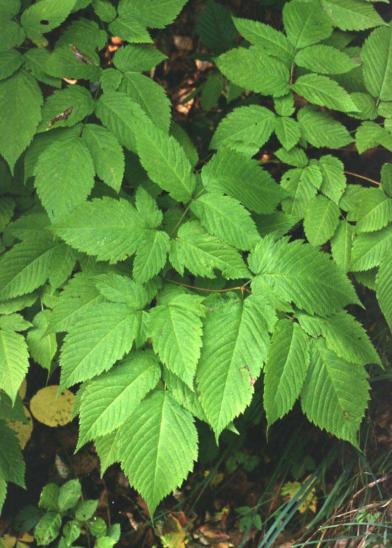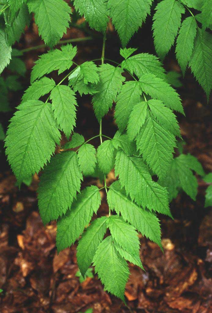 Foglie: le foglie, imparipennate, molto lunghe (fino a 1 m), picciolate, a contorno triangolare, hanno la lamina divisa in 3 segmenti ovato lanceolati, lunghi 5-8 cm, doppiamente seghettati al margine e acuminati all’apice. Alla base del picciolo possono trovarsi delle stipole. Sulla pagina inferiore è presente una pelosità sparsa, concentrata soprattutto all’inserzione delle nervature.