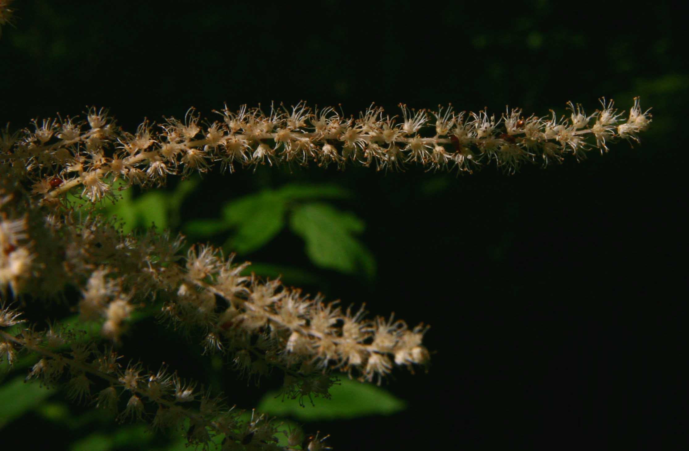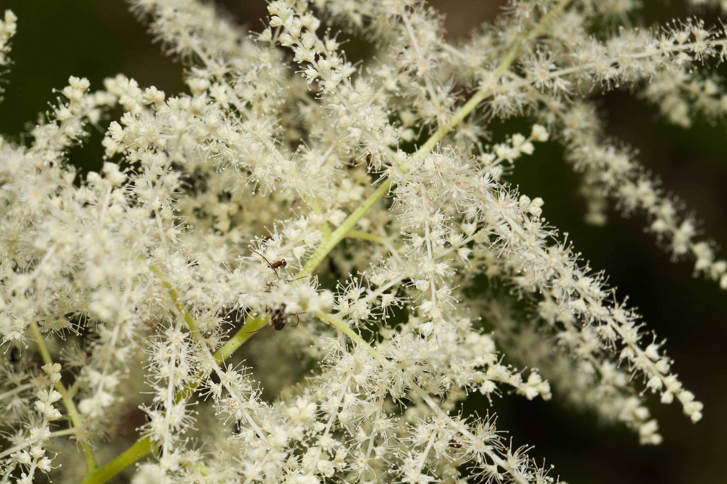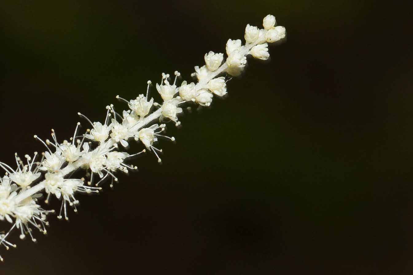 Fiore: i fiori, dioici, sono raccolti in una infiorescenza a pannocchia terminale eretta, di tipo complesso, lunga 20-30(-50) cm, con molti fiori regolari a grappoli penduli (racemo terminale compatto). I rami fiorali terminali sono patenti. I fiori sono piccoli e bianchi, dialipetali, attinomorfi. Il calice è composto da 5 sepali lunghi 0,5 mm, acuti e persistenti alla maturazione dei frutti; la corolla, larga 2-4 mm, è formata da 5 petali lineari lunghi 1-2 mm. I fiori maschili, bianco giallastri, hanno un androceo composto da più di 20 stami molto sporgenti (più lunghi della corolla), lunghi 3 mm, con antere scure. I fiori femminili hanno la corolla bianco candida, con l’ovario semiinfero e 3 carpelli, ma presentano anche brevi stami rudimentali. I fiori ermafroditi portano generalmente 4 carpelli che sovrastano, in altezza, gli stami, che risultano essere molto più brevi anche dei petali.
