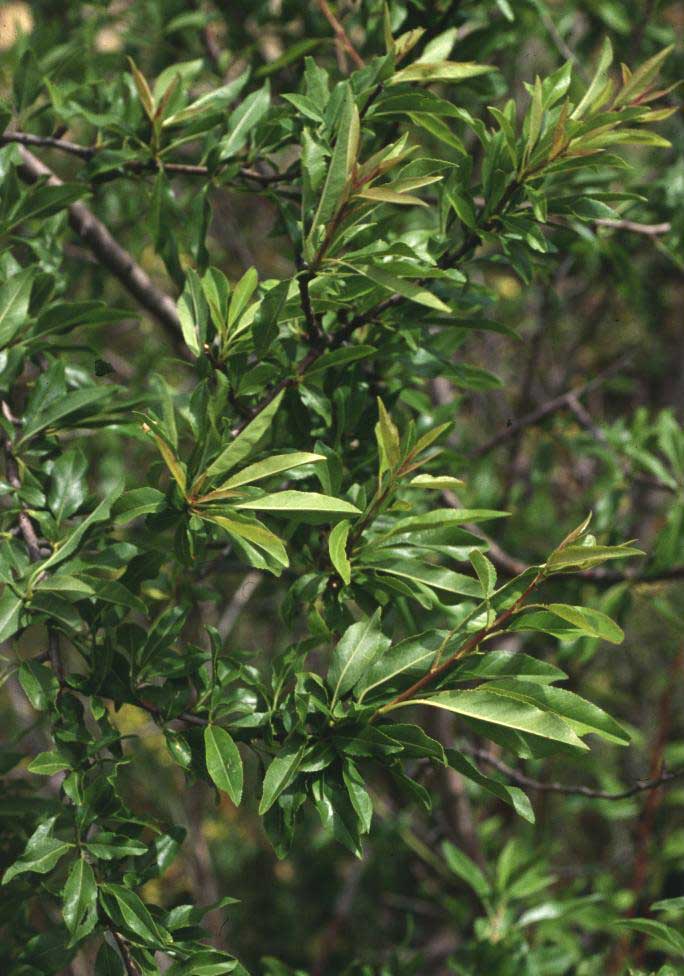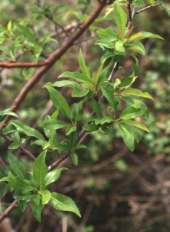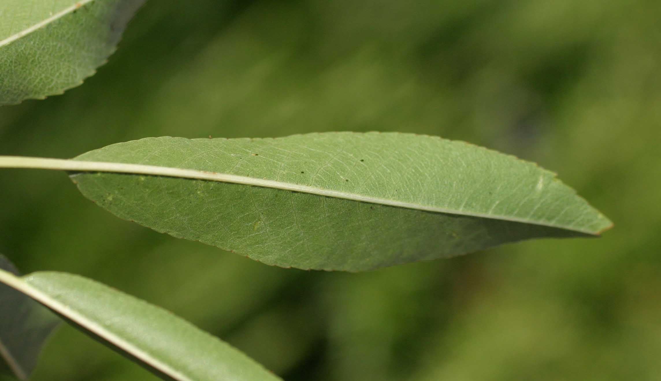 Foglie: le foglie, di tipo semplice, decidue, a inserzione alterna, sono lunghe fino a 6 cm, con lamina strettamente lanceolata e seghettata al margine e apice appuntito, portate da un picciolo lungo 1,5-2 cm; hanno colore verde lucido con sfumature glauco grigiastre nella pagina inferiore che è anche glabra.