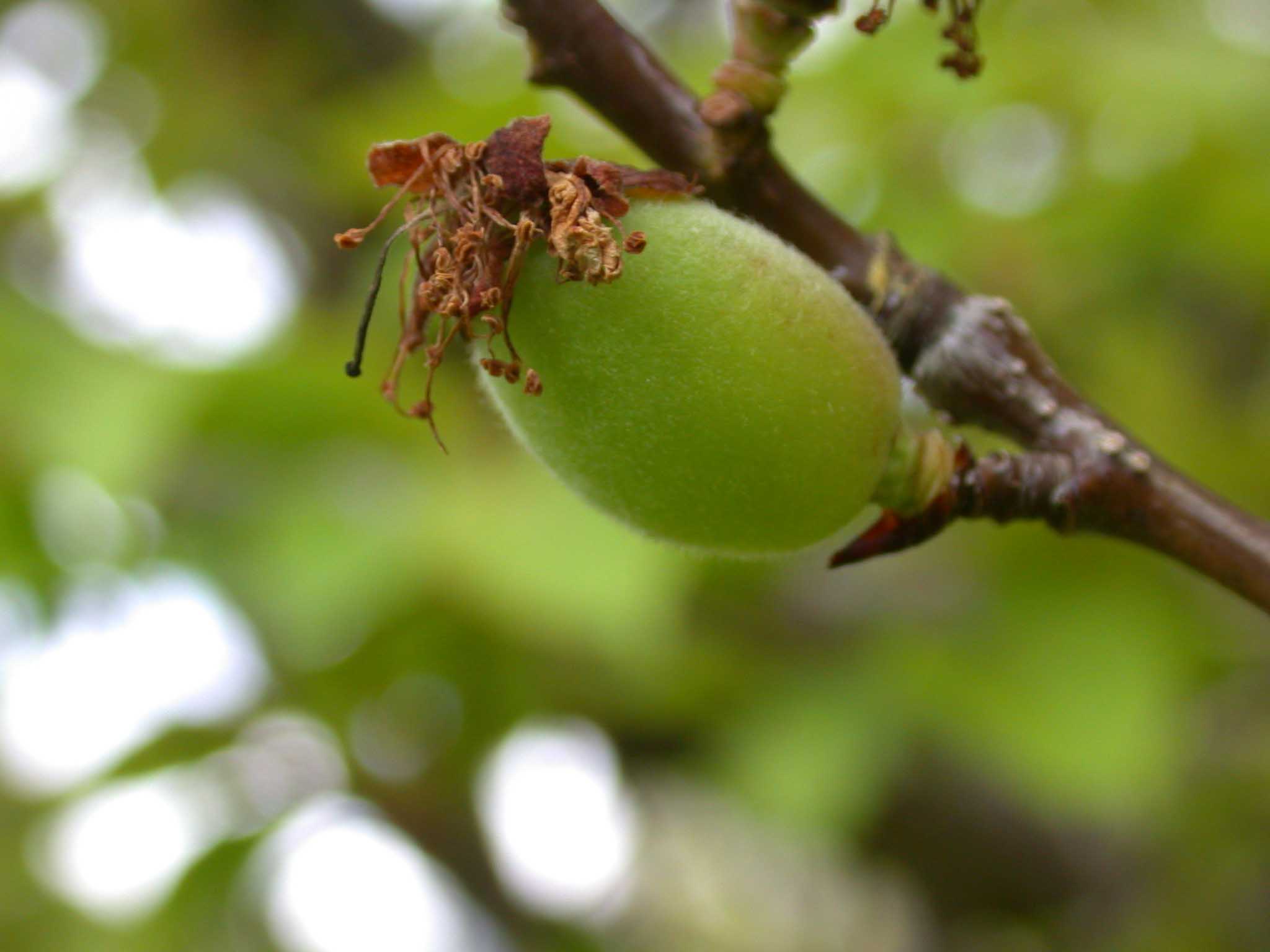 Frutto: il frutto è una drupa oblungo compressa, carenata, coriacea, tomentosa leggermente solcata da un lato, verde, un po’ particolare, la cui polpa (mesocarpo) si secca presto diventando coriacea e a maturità si apre in due valve attraverso cui è visibile il caratteristico guscio legnoso (endocarpo), marcato da piccole fessure longitudinali. La forma domestica può maturare i frutti anche a nord delle Isole Britanniche.