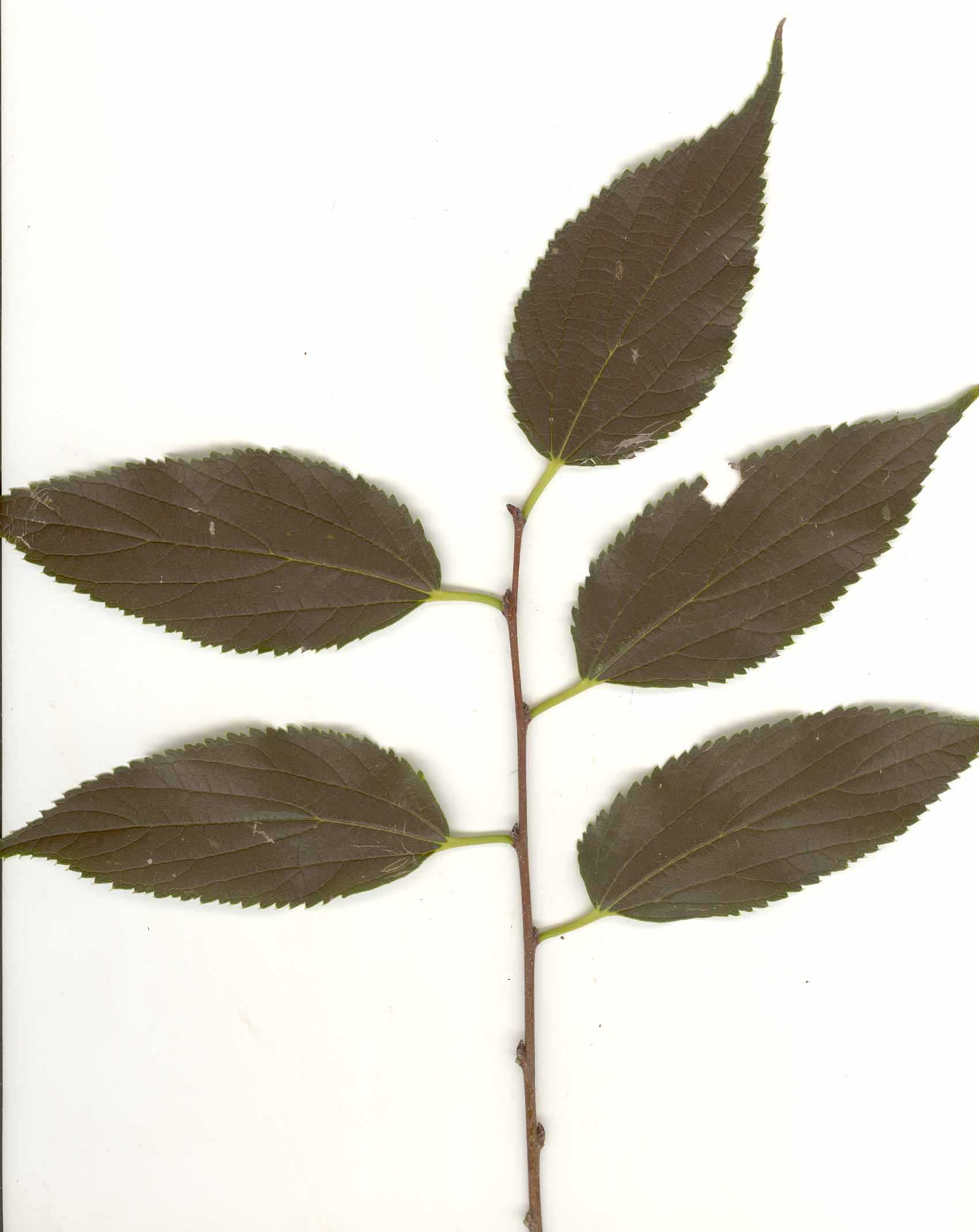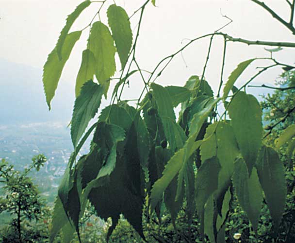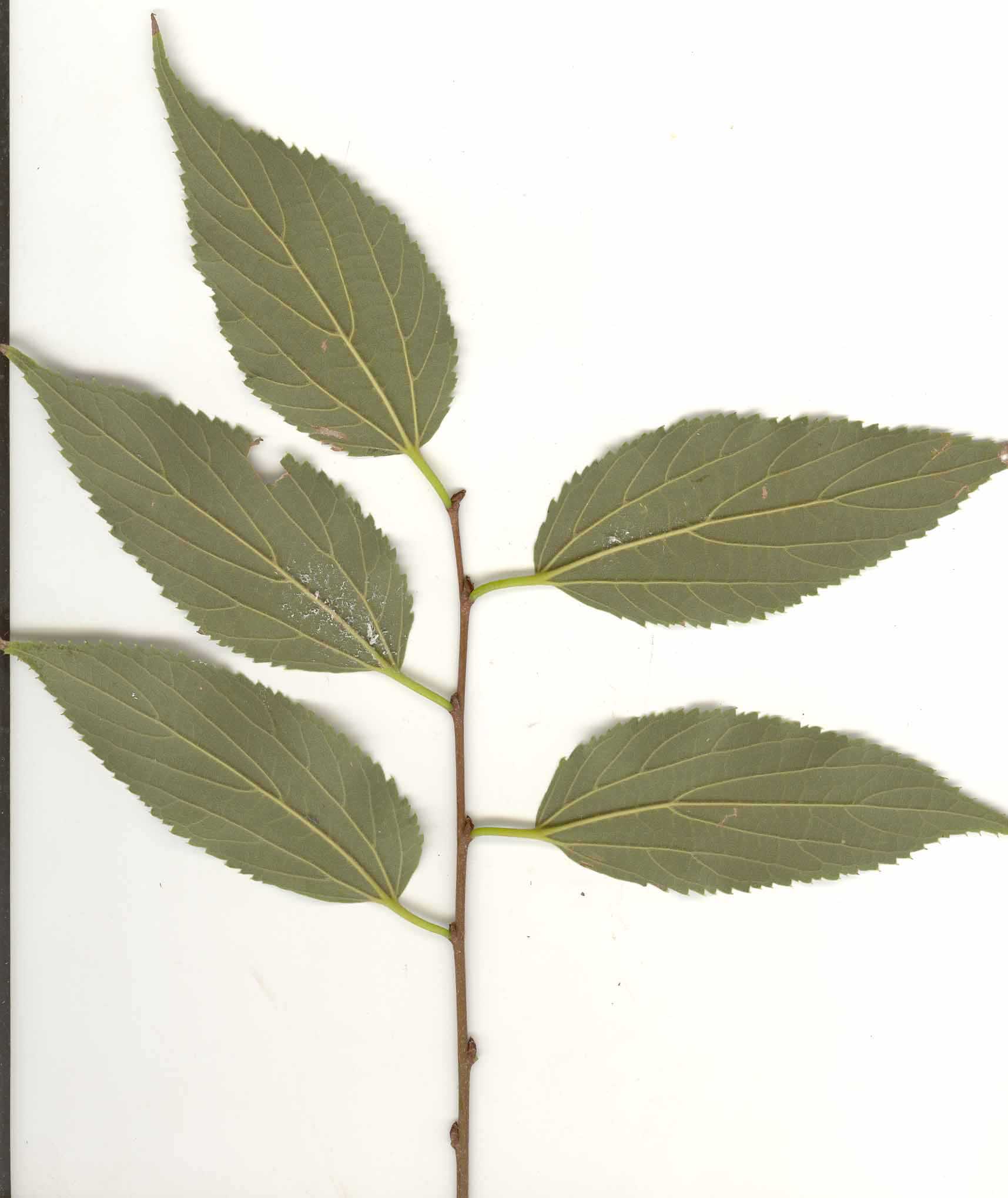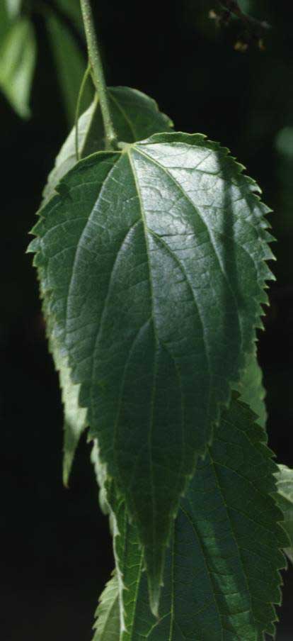 Foglie: le foglie, lunghe fino a 15 cm e larghe 6 cm, decidue, con inserzione alterna mediante un corto picciolo (2 cm) su rametti esili, brunastri e pubescenti su cui si evidenziano delle lenticelle biancastre, sono ovato lanceolate od oblungo lanceolate, acuminate e subcaudate all’apice, cuneate o arrotondate alla base (più o meno asimmetrica, cioè rispetto alla nervatura centrale il lembo è più largo da una parte e più stretto dall’altra), si presentano rugose e verde intenso superiormente, con 3 nervi principali e nervature secondarie fittamente reticolate, verde grigiastre sulla pagina inferiore ricoperta da una fine peluria che le conferisce un aspetto tomentoso. Il margine presenta una doppia dentatura. Le gemme son disposte alternativamente su di un unico piano e sono finemente pubescenti.