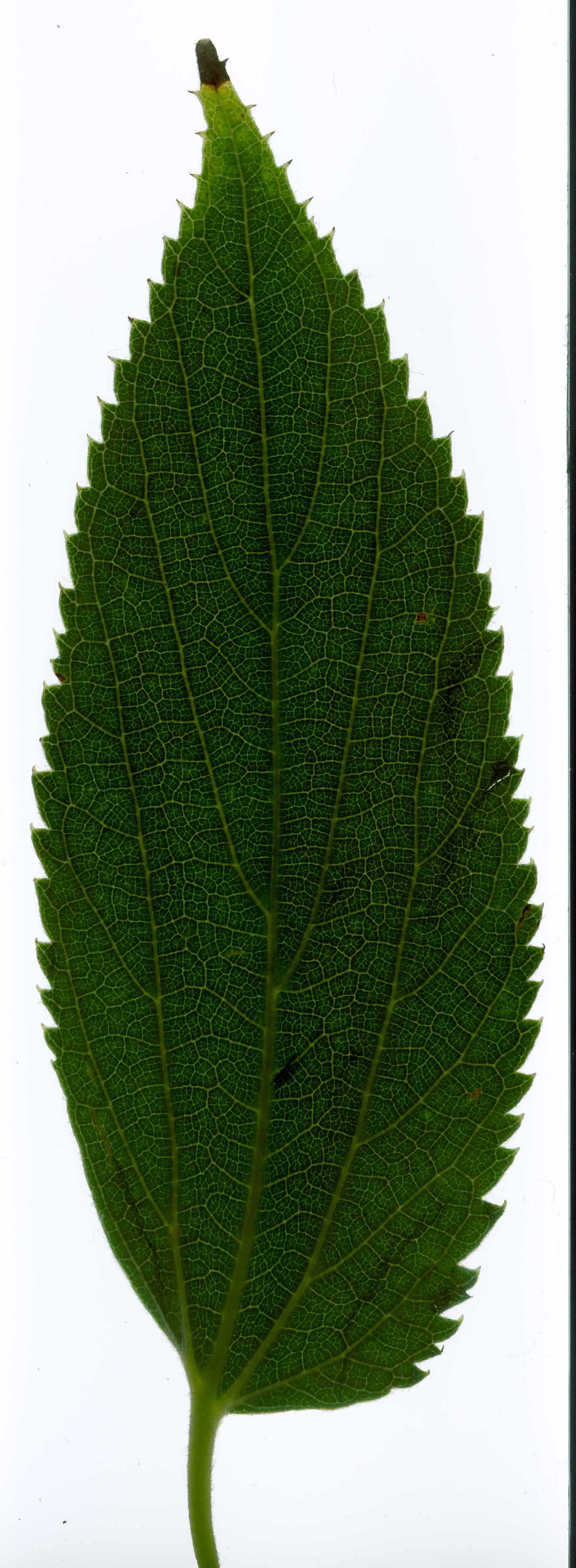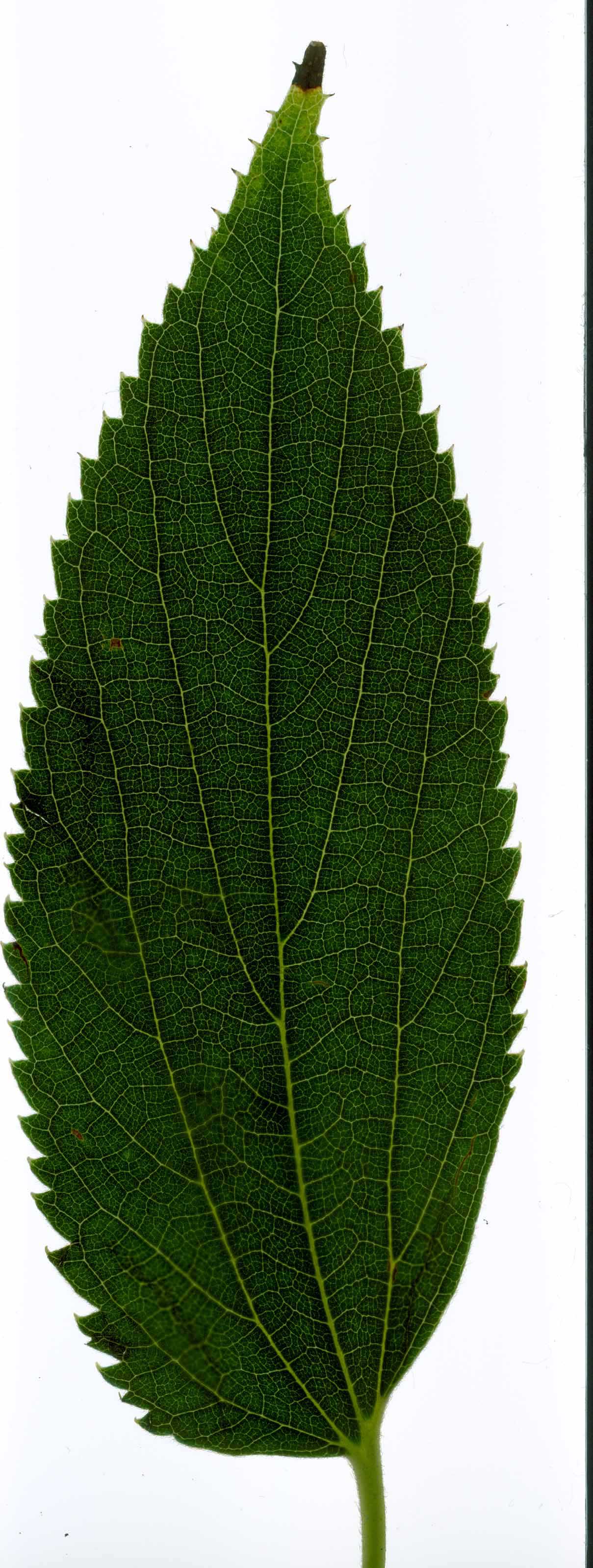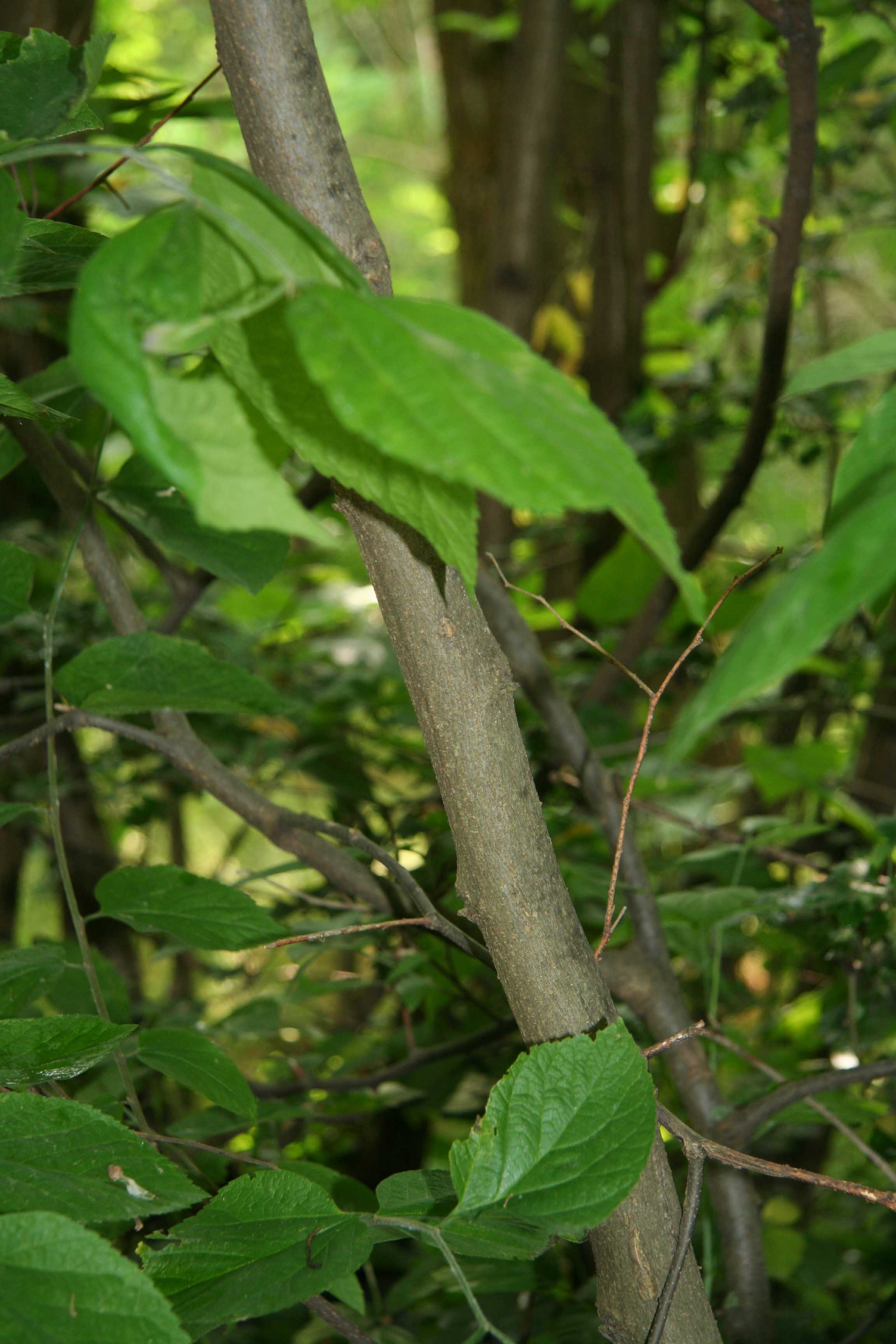 Foglie: le foglie, lunghe fino a 15 cm e larghe 6 cm, decidue, con inserzione alterna mediante un corto picciolo (2 cm) su rametti esili, brunastri e pubescenti su cui si evidenziano delle lenticelle biancastre, sono ovato lanceolate od oblungo lanceolate, acuminate e subcaudate all’apice, cuneate o arrotondate alla base (più o meno asimmetrica, cioè rispetto alla nervatura centrale il lembo è più largo da una parte e più stretto dall’altra), si presentano rugose e verde intenso superiormente, con 3 nervi principali e nervature secondarie fittamente reticolate, verde grigiastre sulla pagina inferiore ricoperta da una fine peluria che le conferisce un aspetto tomentoso. Il margine presenta una doppia dentatura. Le gemme son disposte alternativamente su di un unico piano e sono finemente pubescenti.