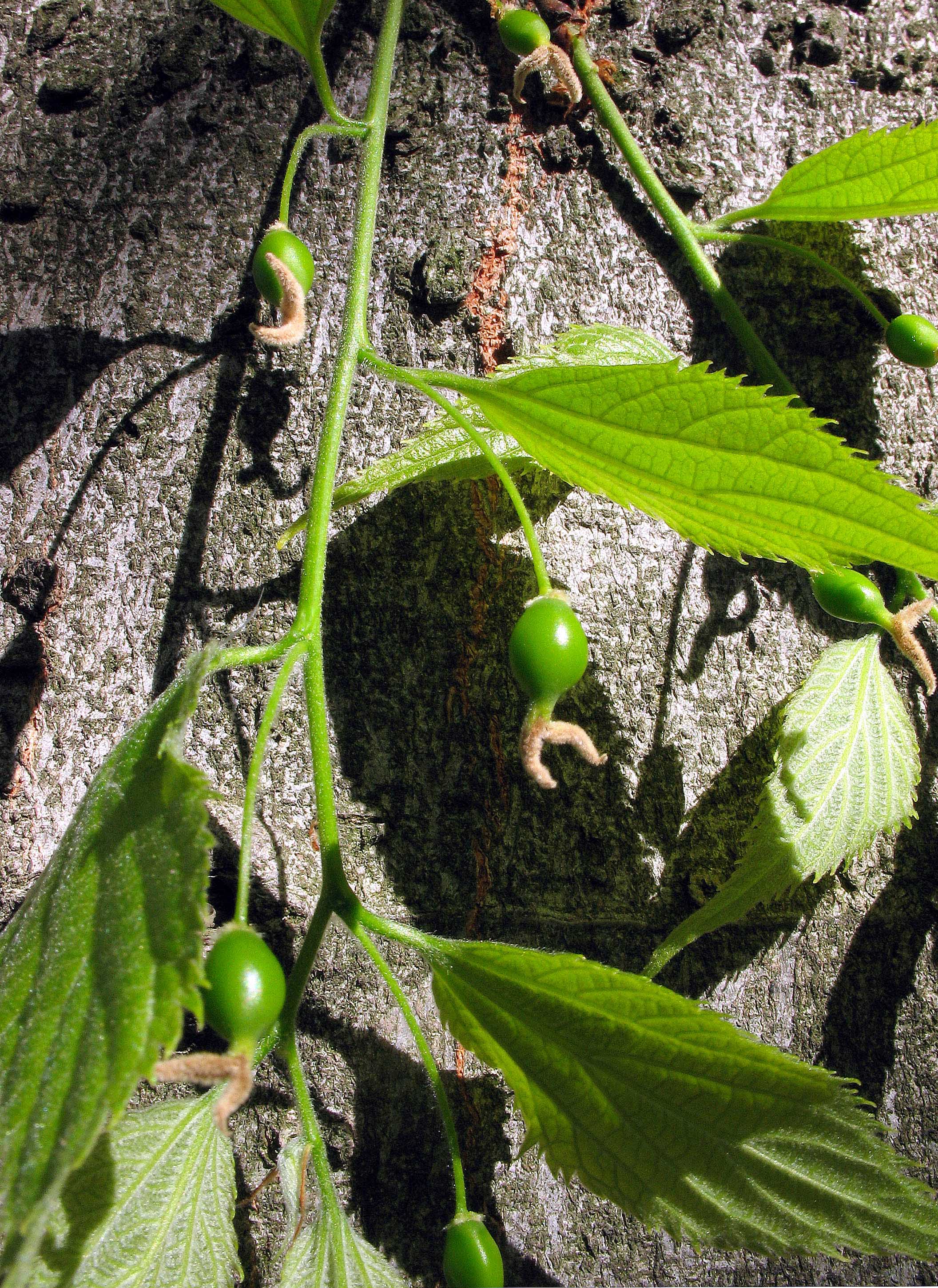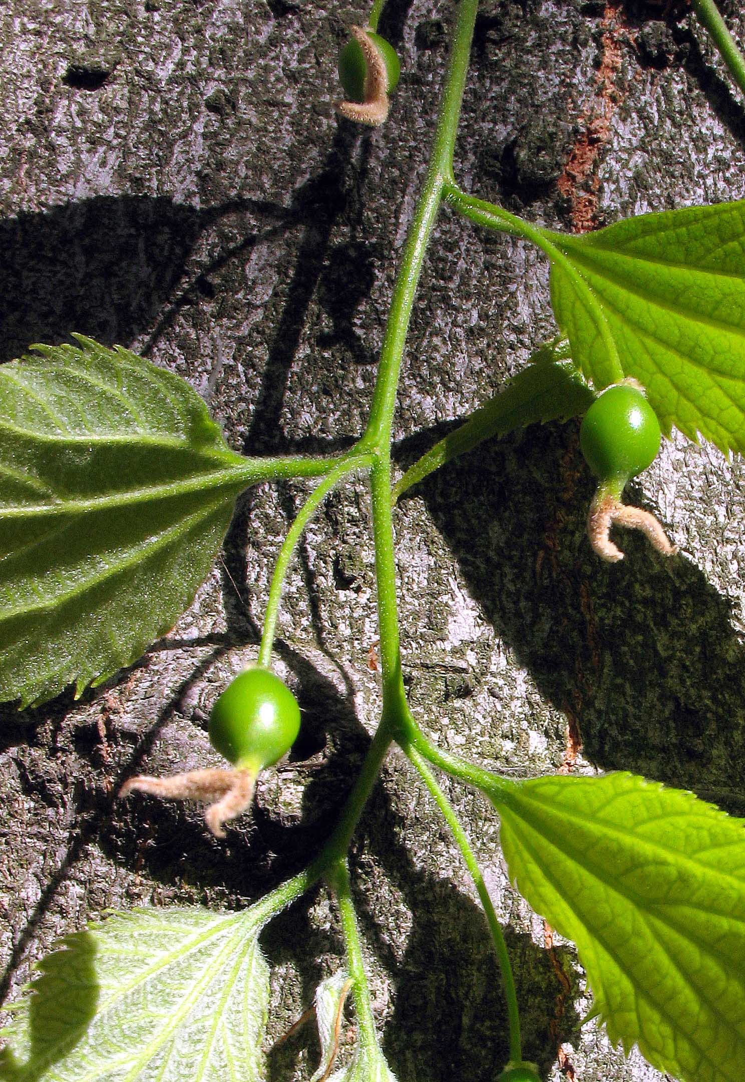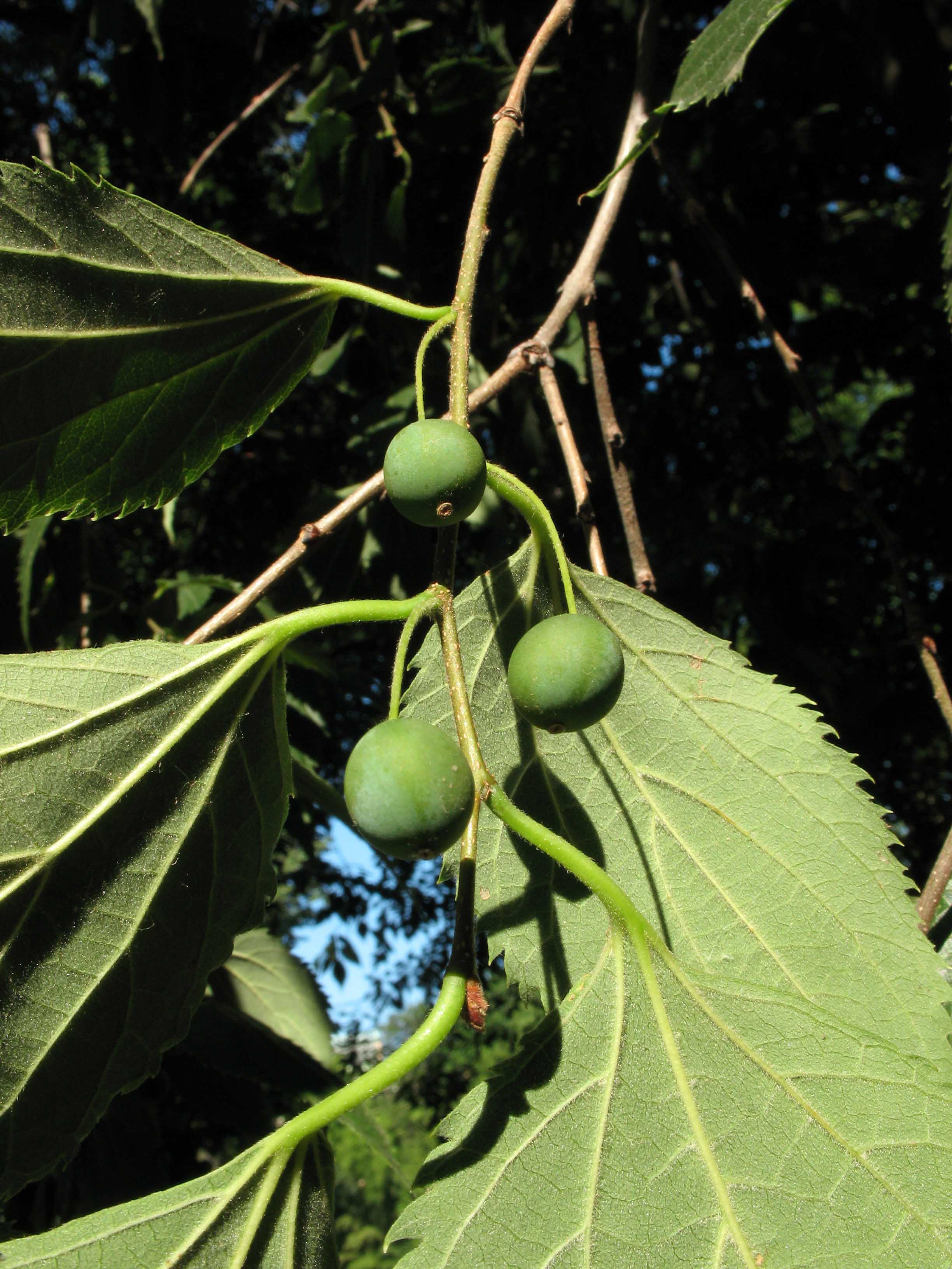 Frutto: drupa ovoidale o sferica, lunga fino a 12 mm, peduncolata, prima verdastra, poi bruno rossastra o nerastra a maturità. Polpa, scarsa, di sapore dolciastro (edule).