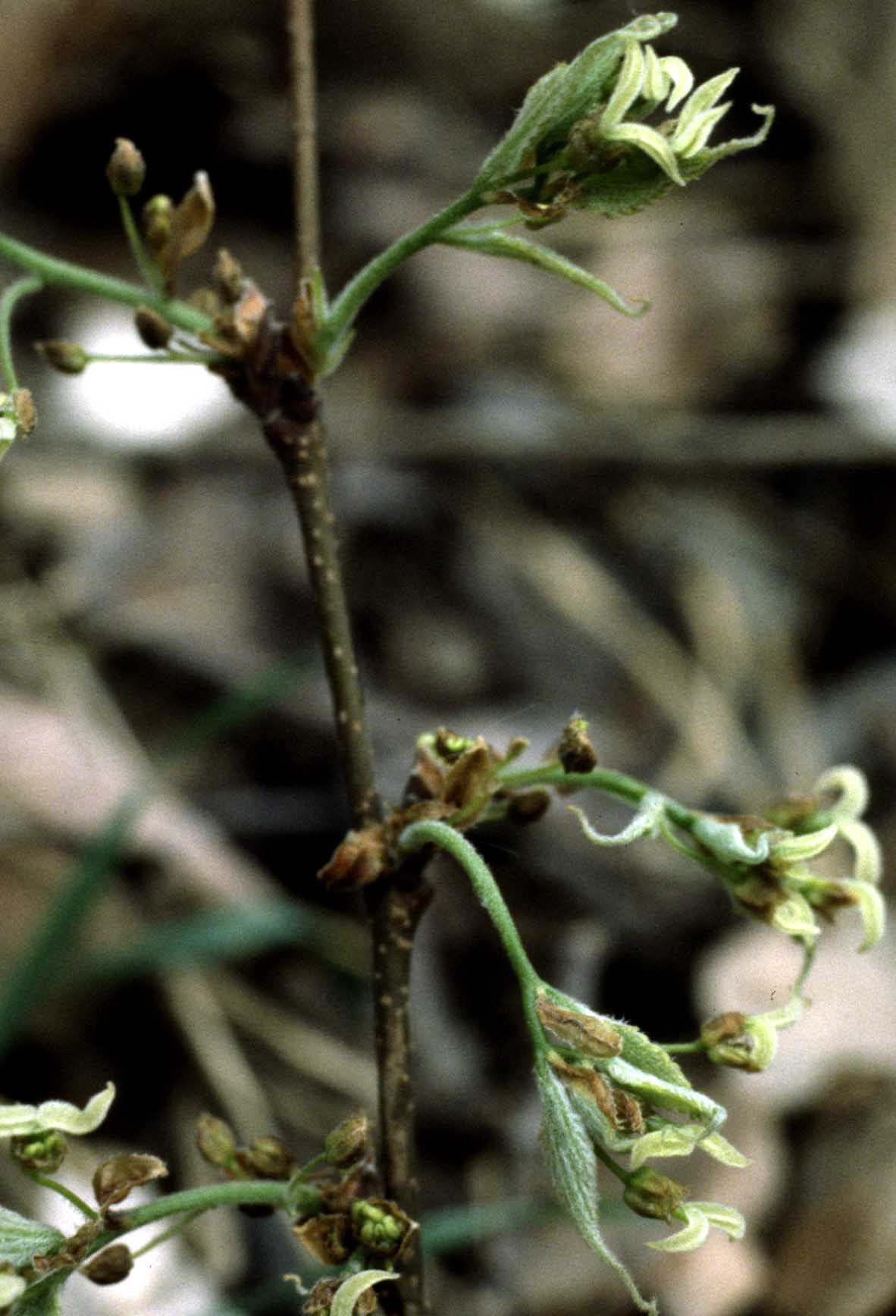 Fiore: i fiori, contemporanei all’emissione delle foglie, possono essere bisessuali e unisessuali sulla stessa pianta, di piccole dimensioni, lungamente peduncolati, sono isolati all’apice dei rametti mentre formano delle piccole infiorescenze alla loro base; presentano perigonio ridotto (divisioni bruno rossastre, lanceolate, dentate al margine, lunghe 2,5 mm) o assente; i fiori ermafroditi hanno colore giallo verdastro e hanno un androceo composto di 5-6 stami con breve filamento e grande antera gialla biloculare, e un gineceo con ovario conico sormontato da due grossi stimmi piumosi che si protendono esternamente come un paio di corna; i fiori maschili sono più giallastri in quanto risalta maggiormente il colore delle antere.