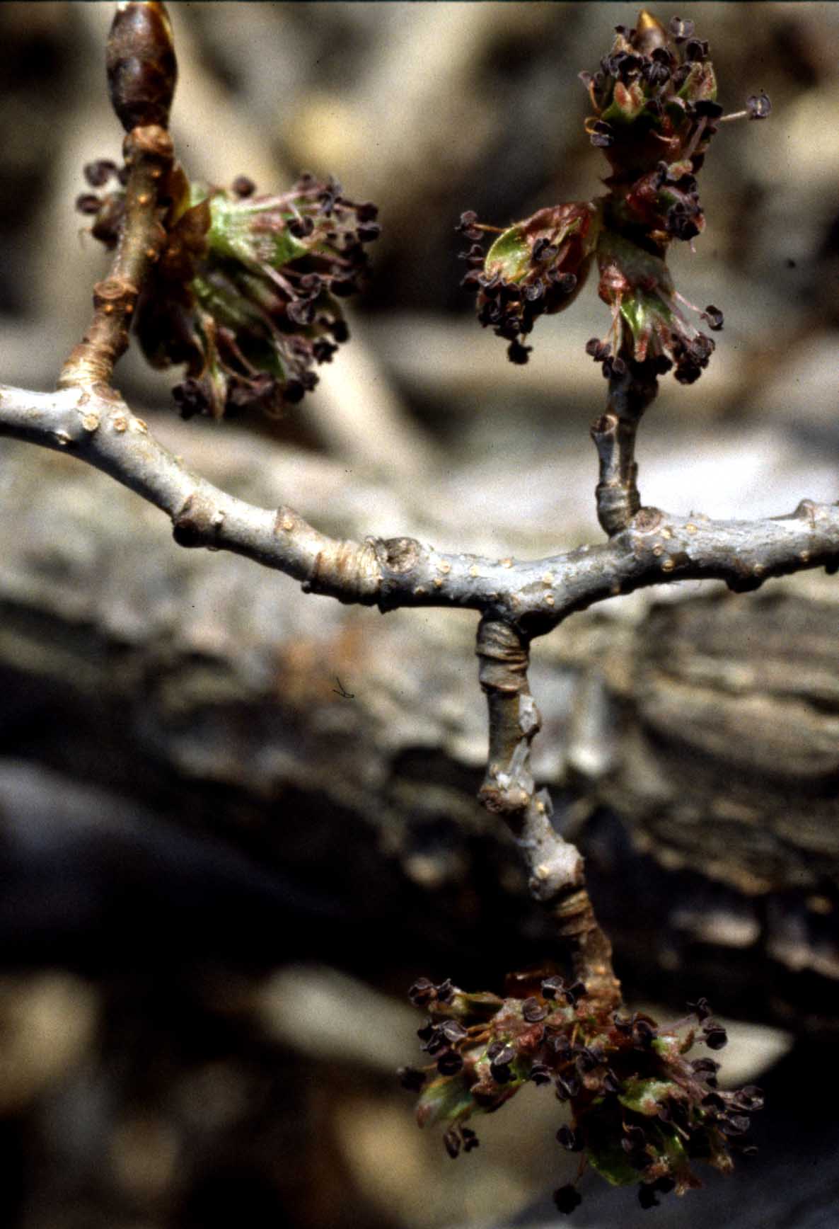 Fiore: i fiori anticipano la comparsa delle foglie, sono bisessuali, piccoli, numerosi, assai brevemente peduncolati e riuniti in ombrellette quasi sessili; possiedono un minuto perigonio campanulato a 5 lobi da cui sporgono gli stimmi biforcuti, piumosi, e i filamenti staminali (da 5 a 6) terminanti in vistose antere rosso violacee.