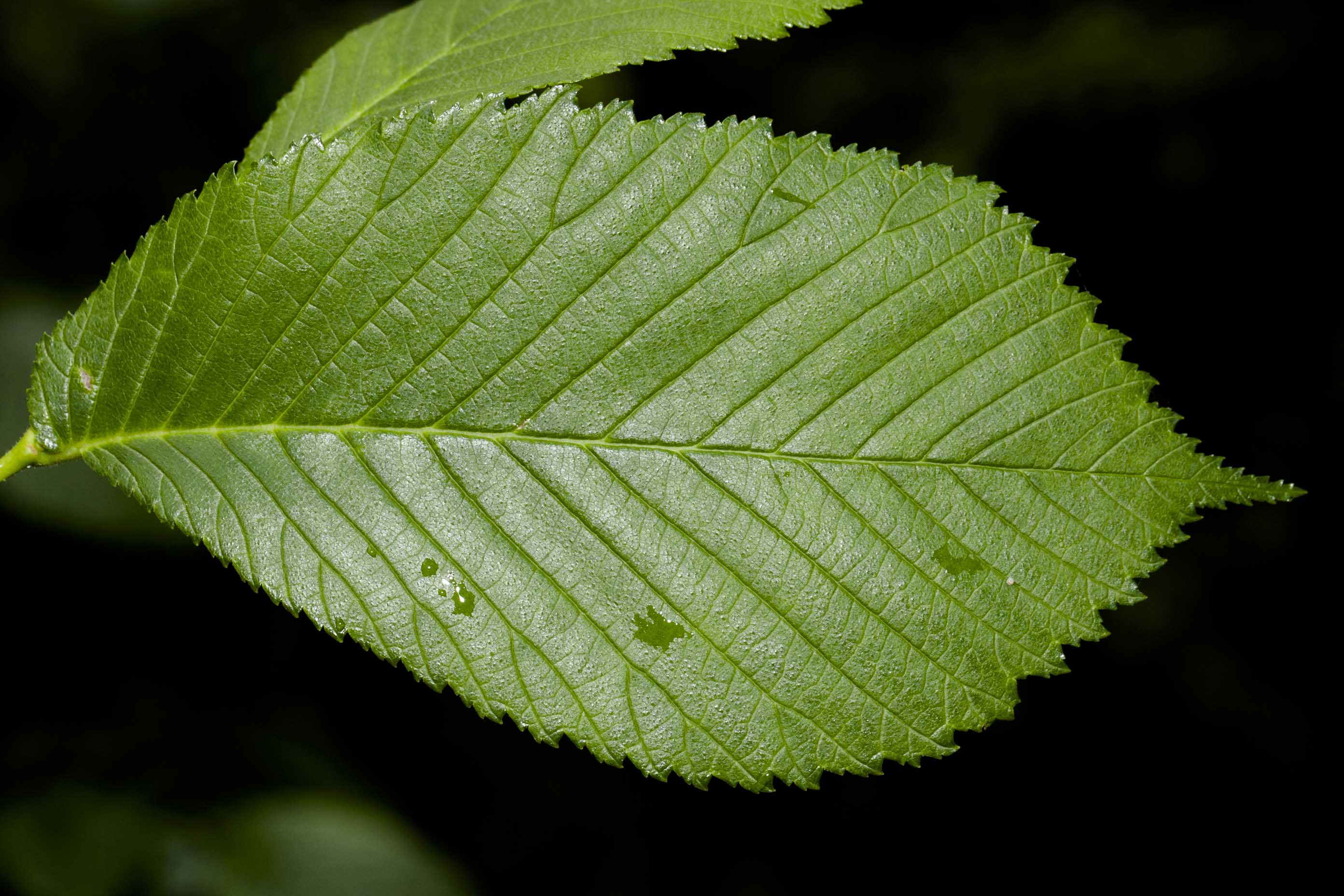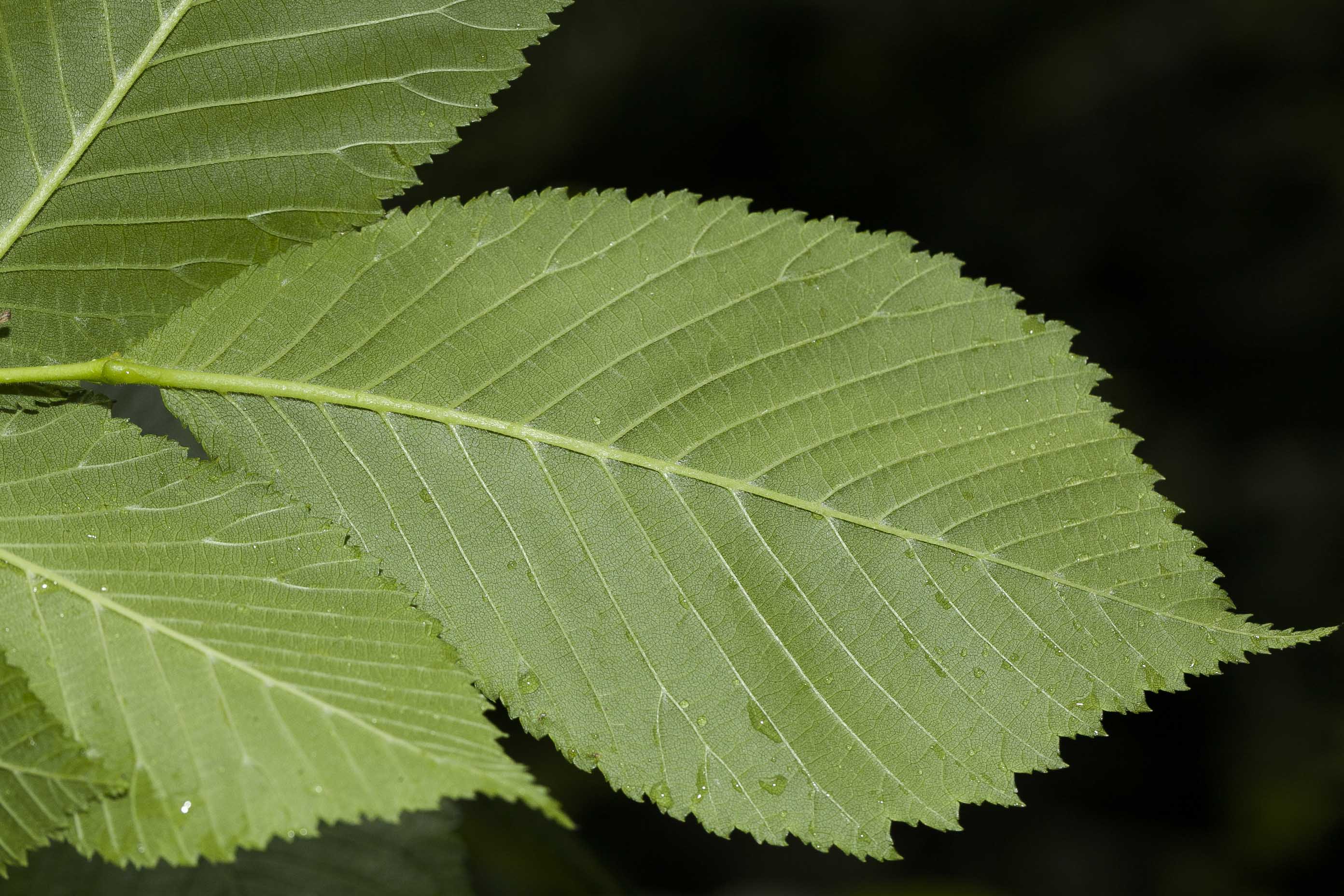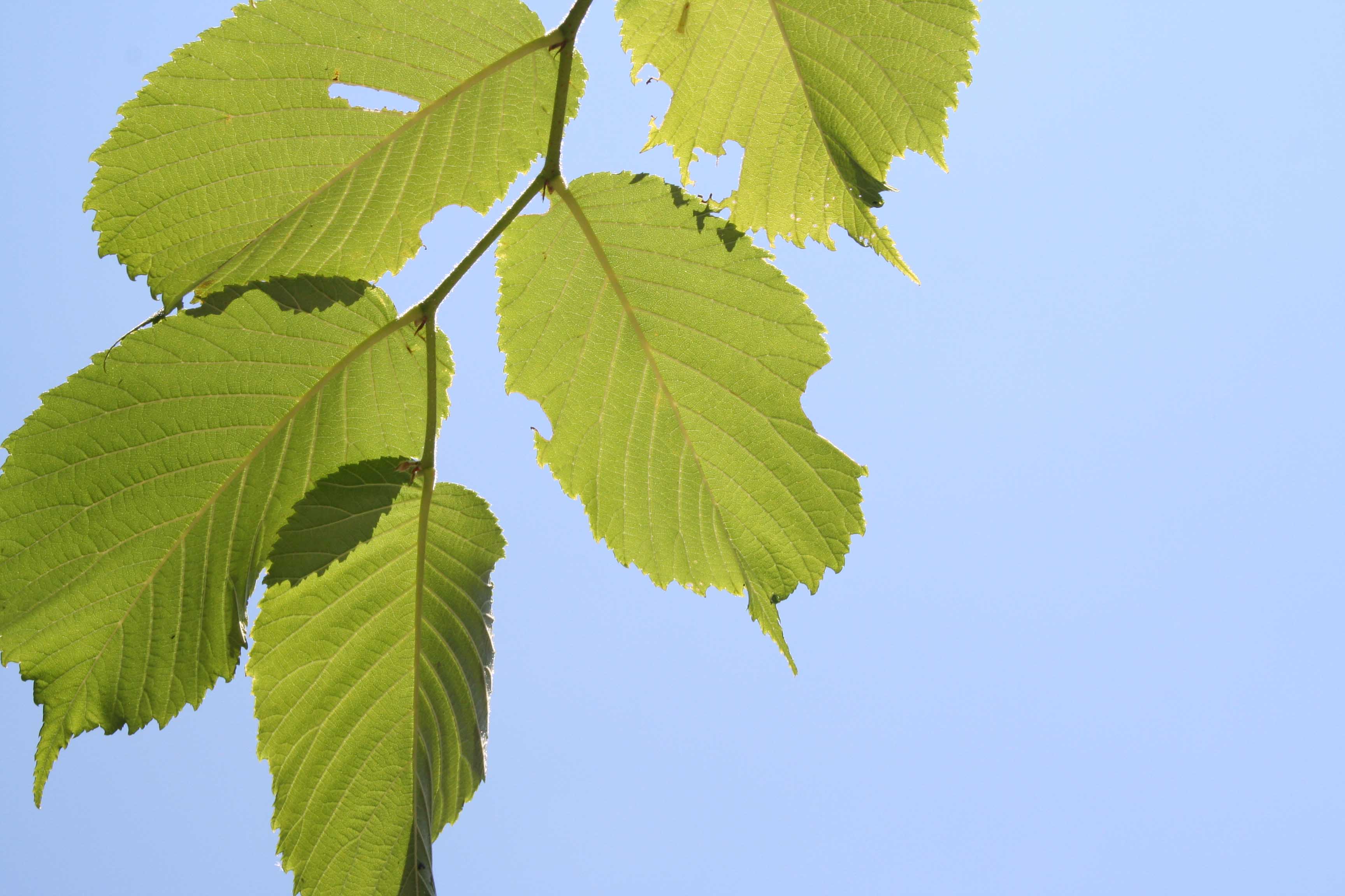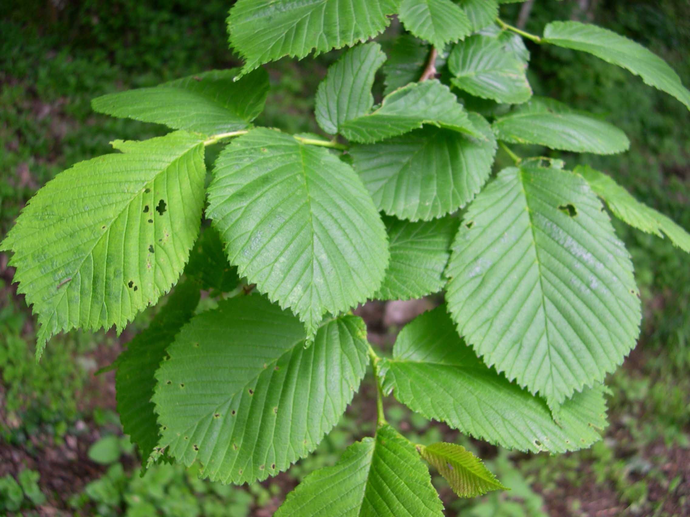 Foglie: le foglie decidue, lunghe 10-15 cm e larghe 5-6 cm, semplici, hanno inserzione alterna che avviene mediante un picciolo molto corto (lungo 5-8 mm, al massimo 1 cm) su rametti inizialmente pelosi ma successivamente lisci e glabri, distribuiti disordinatamente sui rami più grossi; la lamina fogliare è obovato ellittica, più o meno doppiamente dentata al margine, ad apice acuminato (che, nelle foglie dei rami più robusti, spesso è trifido), presenta una base fortemente asimmetrica, con il lato sporgente molto arrotondato e ricoprente il picciolo. Verde chiaro e pelose sulla pagina inferiore e sulle nervature, sono molto ruvide sulla pagina superiore e di colore verde scuro. In autunno assumono un bel colore giallo caratteristico. La nervatura è penninervia, con 12-18 evidenti ramificazioni secondarie per lato.