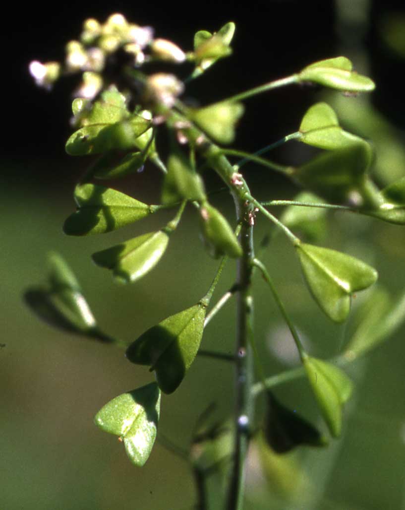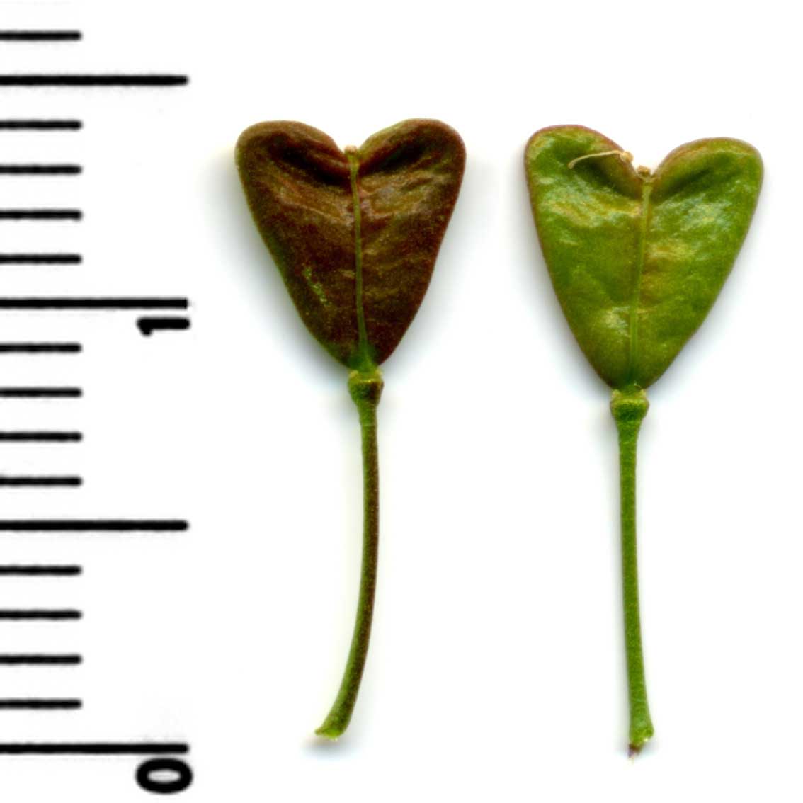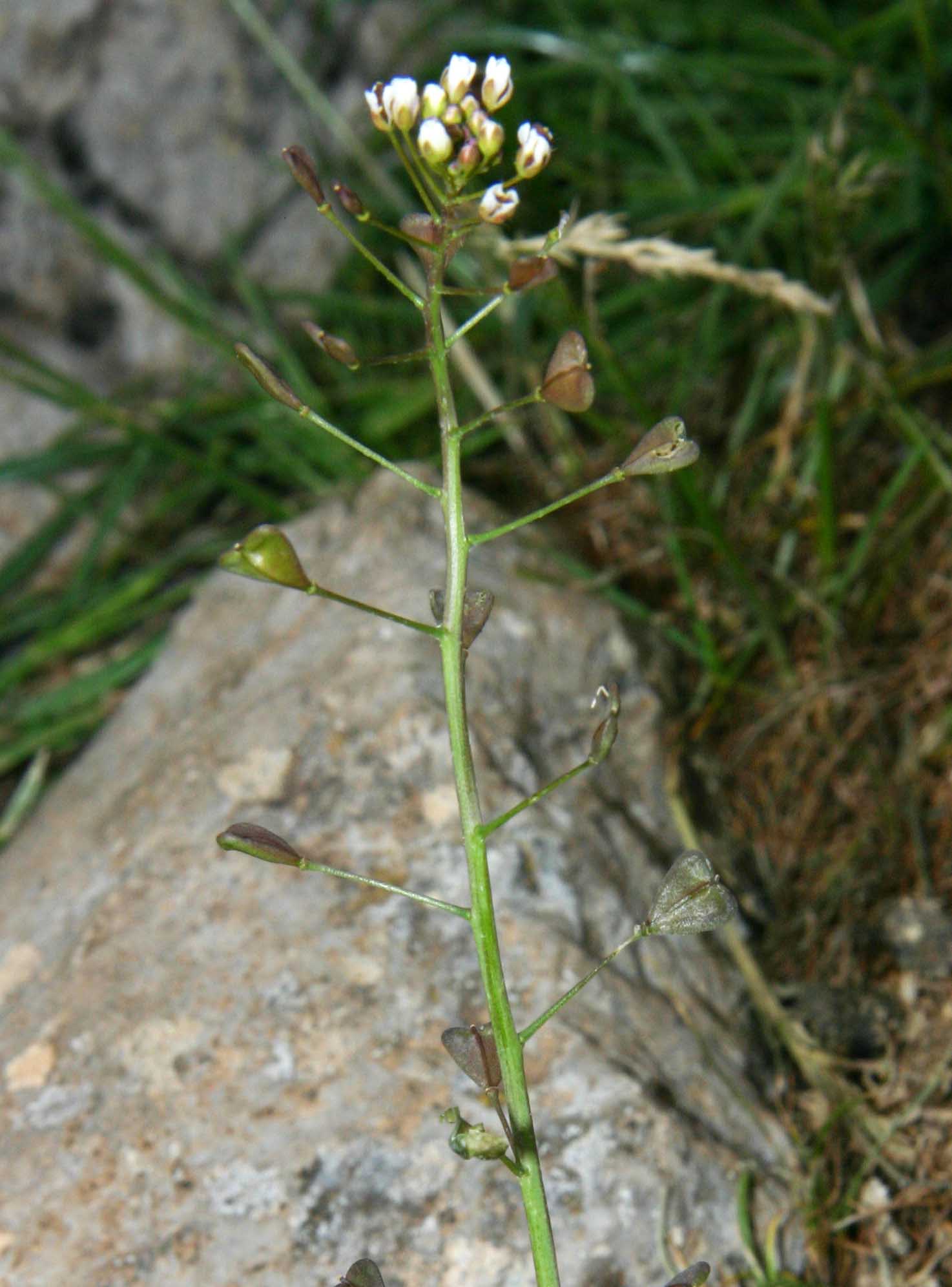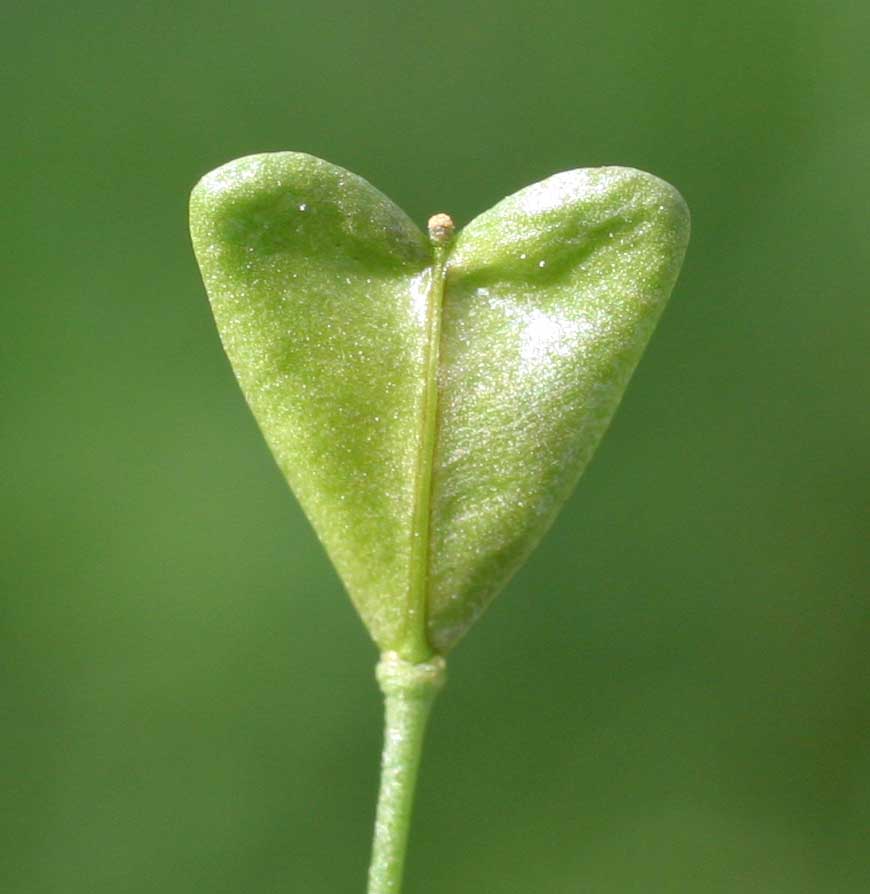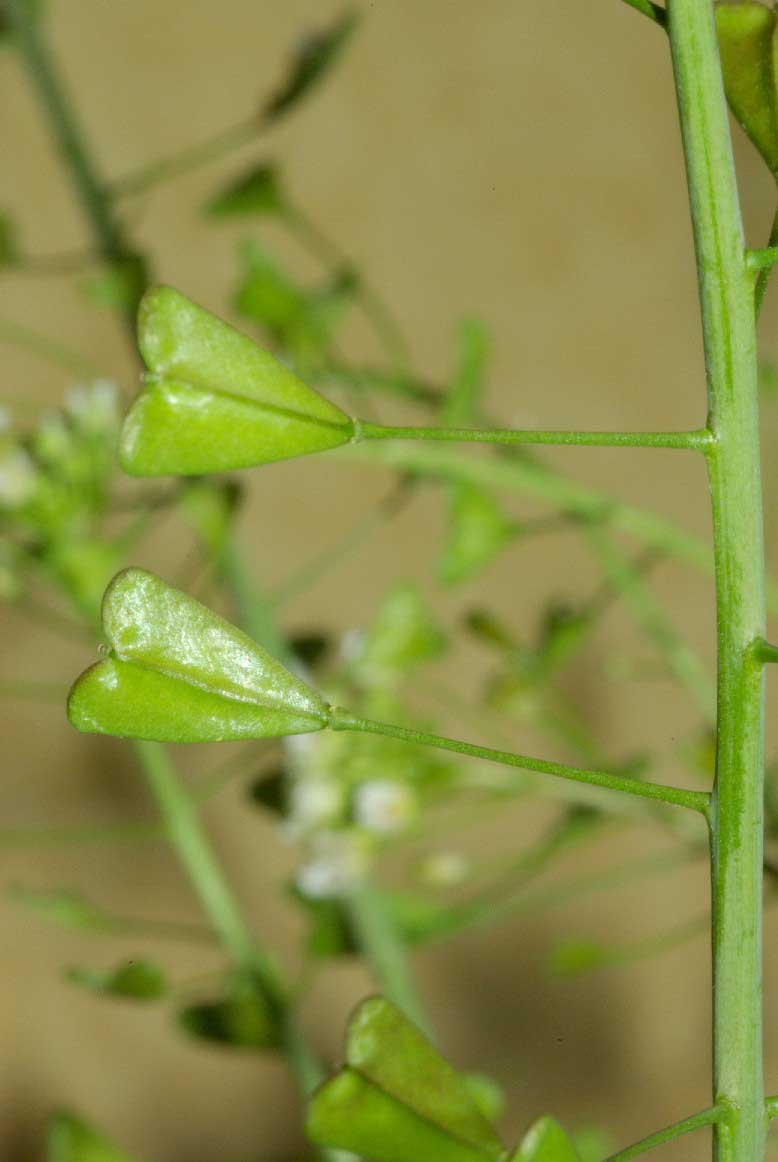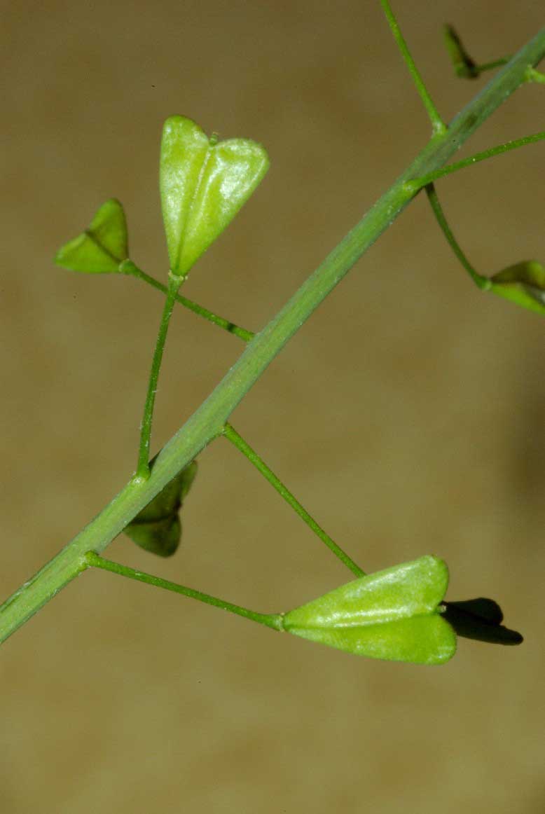 Frutto: siliquetta ovato triangolare, con il vertice rivolto verso il peduncolo, a due logge divise da un tegumento sottile, deiscente per due valve, lunga 4-6 mm.