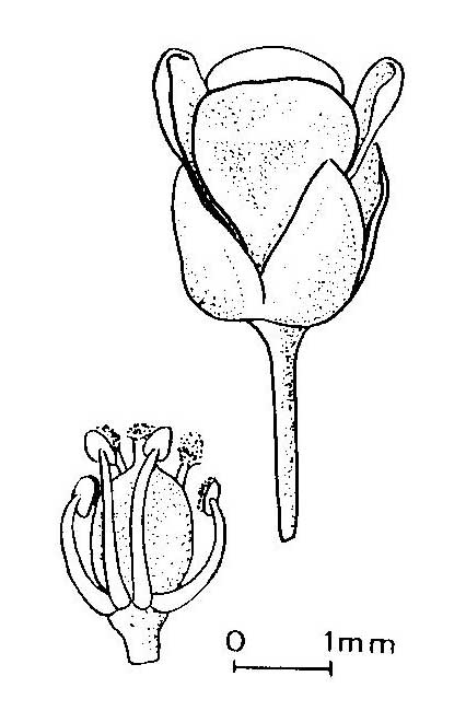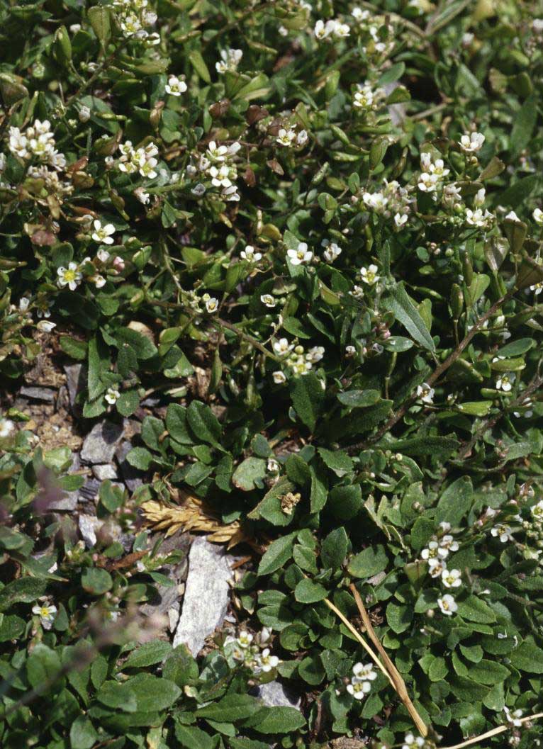 Fiore: i fiori, ermafroditi, tetrameri, dialipetali e attinomorfi, sono piccoli e bianchi, riuniti in lunghi e lassi racemi apicali, molto allungati all’epoca della fruttificazione. Il calice è composto da 4 sepali eretto patenti, a margine bianco membranaceo e dorso rossiccio, caduchi, lunghi 1-2 mm; corolla di 4 petali, obovati, interi e bianchi, lunghi 2-3 mm. Stami 6, dei quali due più brevi, con filamenti liberi ed antere subrotonde; nell’intervallo fra ogni stame breve ed una coppia di lunghi, un piccolo nettario. Ovario ovato subtrigono, con due logge contenenti parecchi ovuli ciascuna e sormontato da uno stilo breve con stimma a bottone.