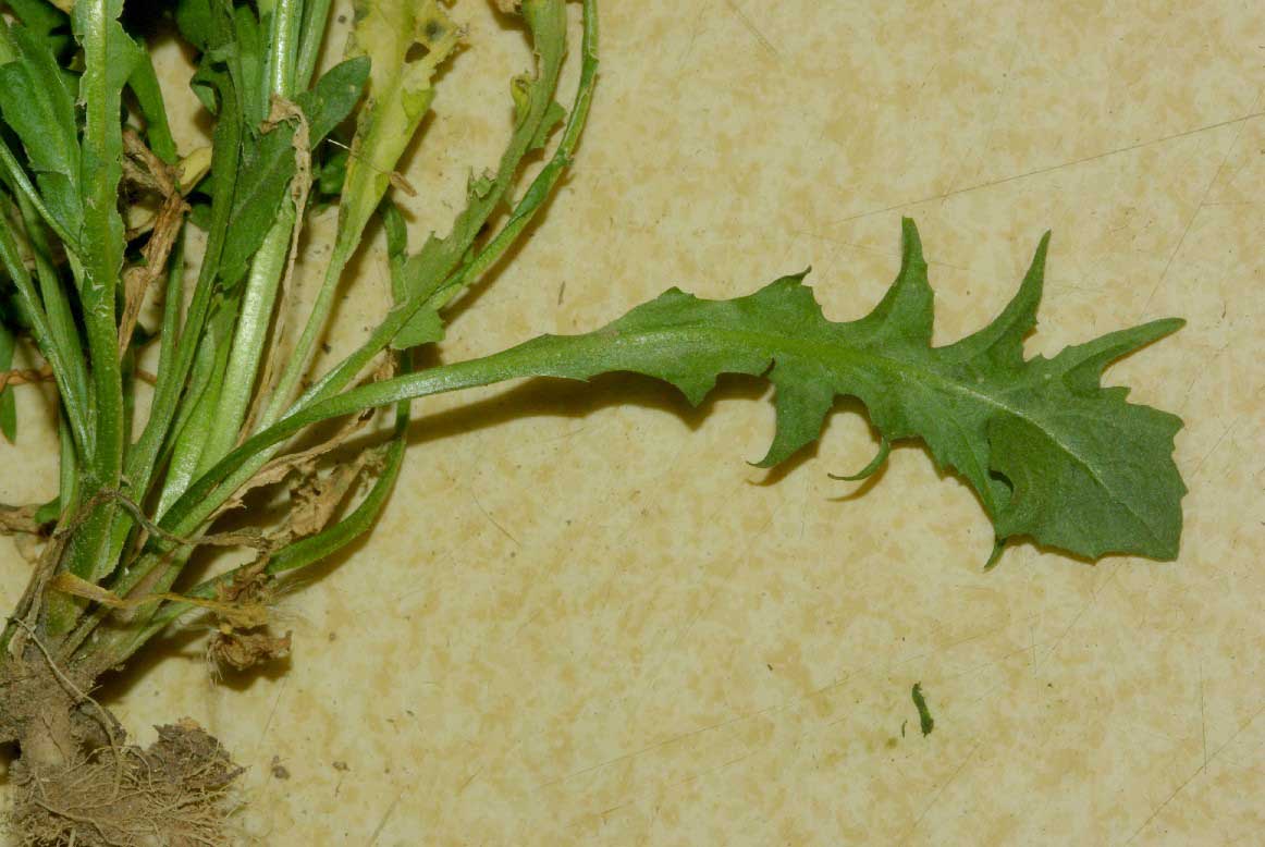 Foglie: le inferiori, riunite in una densa rosetta, hanno la lamina a contorno spatolato, lunga 3-10 cm, larga 0,5-2 cm, più o meno profondamente pennato partita. Le foglie superiori sono sessili, alterne e progressivamente più piccole, a volte con stipole alla base; la lamina è lanceolata con la base amplessicaule-sagittata.