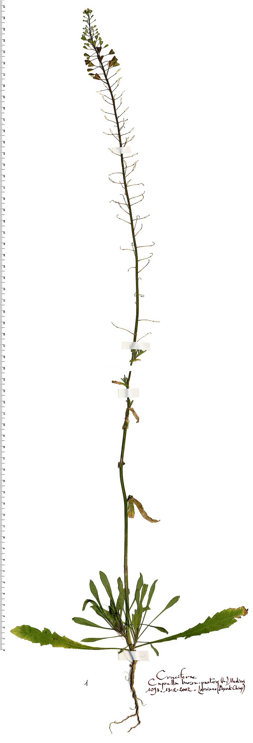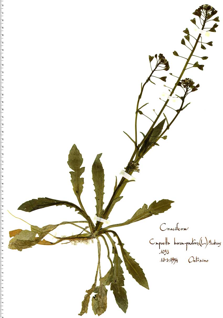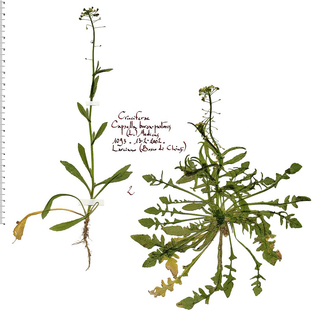 Farmacopea: la composizione chimica di questa pianta è molto controversa. Secondo alcuni autori contiene un glucoside saponinico, tracce di un alcaloide molto instabile (bursina), abbondanti sostanze tanniche, acidi malico, citrico, acetico, tannico, bursico, bursolico, un olio volatile, cera e ceneri nella proporzione del 3,6-9,8% della sostanza secca con fosfati, solfati, cloruri di potassio, sodio, calcio, magnesio, ferro. Secondo altri non esisterebbero nella pianta né glucosidi, né alcaloidi e la sua azione farmacologica dovrebbe essere ascritta esclusivamente all’alto contenuto in potassio; mentre, per altri autori ancora, dipenderebbe dal formarsi di colina e di acetilcolina durante il disseccamento praticato per conservare la droga, o di istamina, tiramina, isoamilamina per decomposizione e fermentazione delle sostanze proteiche della pianta durante il processo di preparazione. Tschirch avrebbe anzi constatato che l’attività della Borsa del pastore aumenterebbe allorché i processi di fermentazione avvengono in presenza di particolari batteri e muffe. E’ stata usata in tempi remoti come emostatico ma recentemente l’uso a questo scopo è stato abbandonato perché la sua azione non è stata ritenuta abbastanza pronta. Ma le ricerche sono state tuttavia riprese e sono tuttora in corso sulla base della convinzione che la ritardata efficacia dipende dalla labilità dei principi attivi nel corso del disseccamento, questa volta però facendo uso della pianta fresca e di preparati concentrati che pare diano risultati molto incoraggianti, sia nei casi di emottisi e di ematuria, sia in quelli di metrorraqgie dipendenti da cause diverse. Il meccanismo farmacologico di questa azione è però tuttora non ben chiarito dato che è ancora in corso fra gli autori la discussione se l’attività della droga sia maggiore allo stato fresco od a quello secco. La droga ha anche efficacia ipotensiva dipendente tanto da una vasodilatazione periferica quanto da azioni centrali e probabilmente anche da una influenza diretta, ma di natura non ancora precisata, sul cuore.