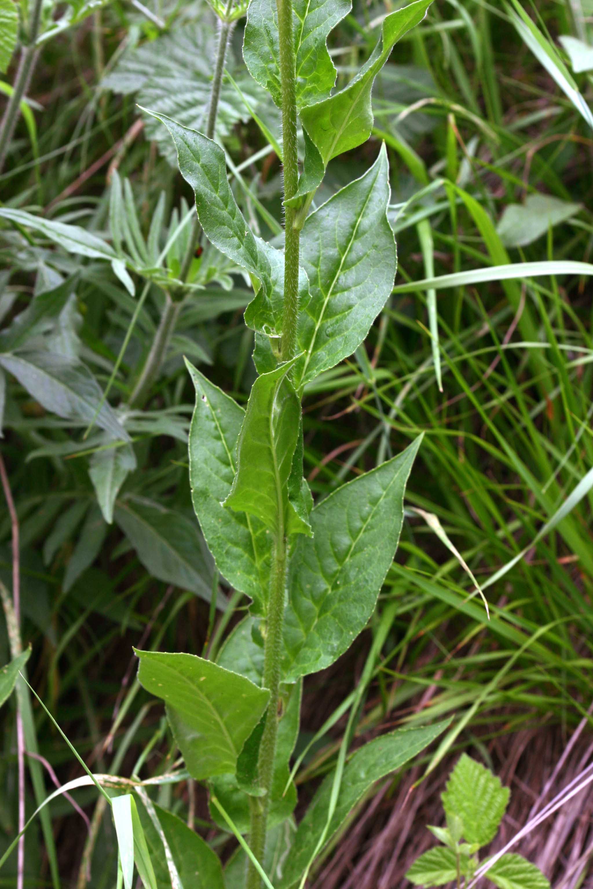 Foglie: le foglie hanno disposizione alterna, brevemente picciolate o sessili, le inferiori, assenti nel periodo della fioritura, sono lunghe 8-16 cm e larghe 4 cm, hanno la lamina oblunga o lanceolata, grossolanamente dentata ai bordi; quelle superiori, numerose, sono ovato lanceolate, seghettate e progressivamente più piccole. Corti peli sia sulla pagina superiore che su quella inferiore conferiscono alla foglia una ruvidezza al tatto.