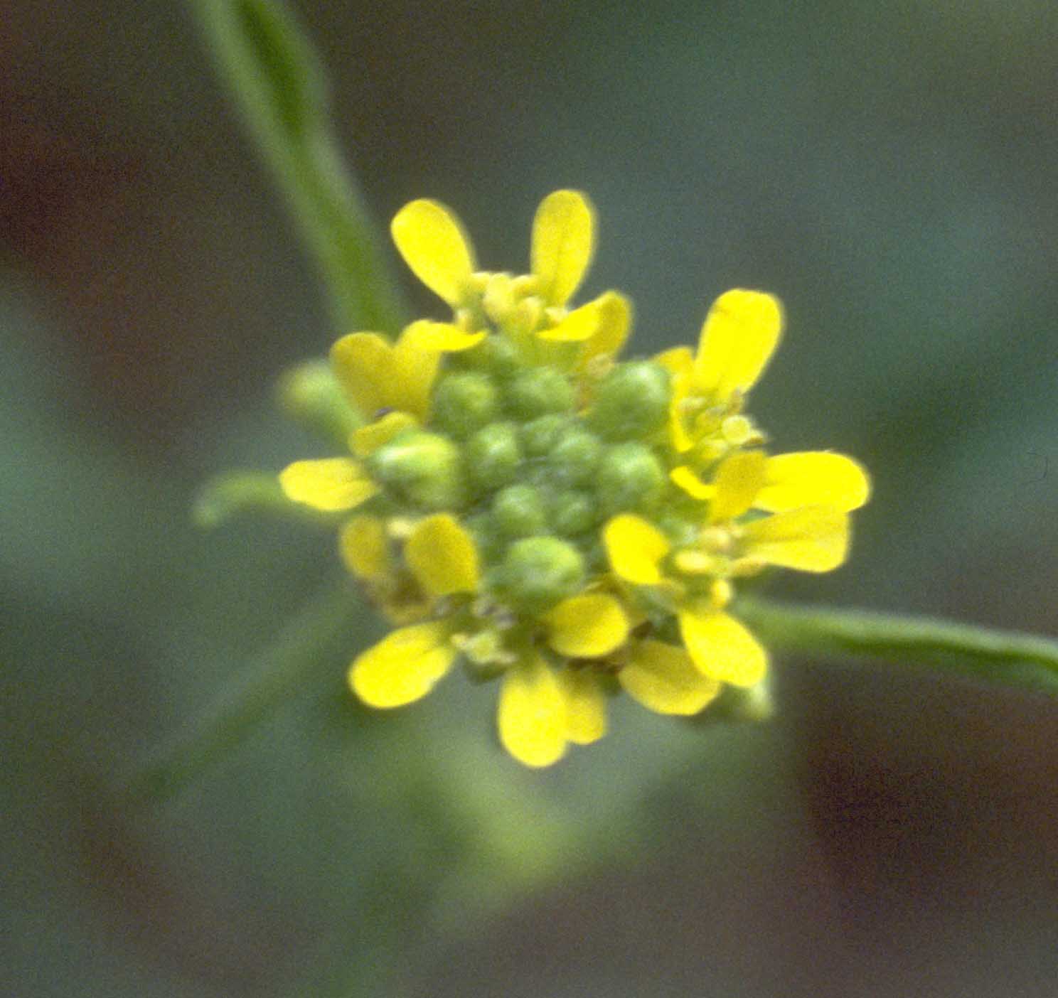 Fiore: piccoli, tetrameri, regolari, raccolti (in numero da 30 a 60) in infiorescenze nude più o meno allungate e terminali del fusto e dei rami. Calice di 4 sepali uguali fra di loro e più brevi dei petali; corolla cruciforme di colore giallo pallido, con petali lunghi 3-4 mm; androceo di 6 stami, di cui 4 più lunghi (0,5-0,8 mm), a filamenti subulati ed antere oblungo cordate e con 4 ghiandole tubercoliformi inserite fra gli stami brevi e quelli lunghi ad essi vicini; gineceo con ovario esile ed allungato, biloculare, pluriovulato, sormontato da un breve stilo con stimma a bottone.
