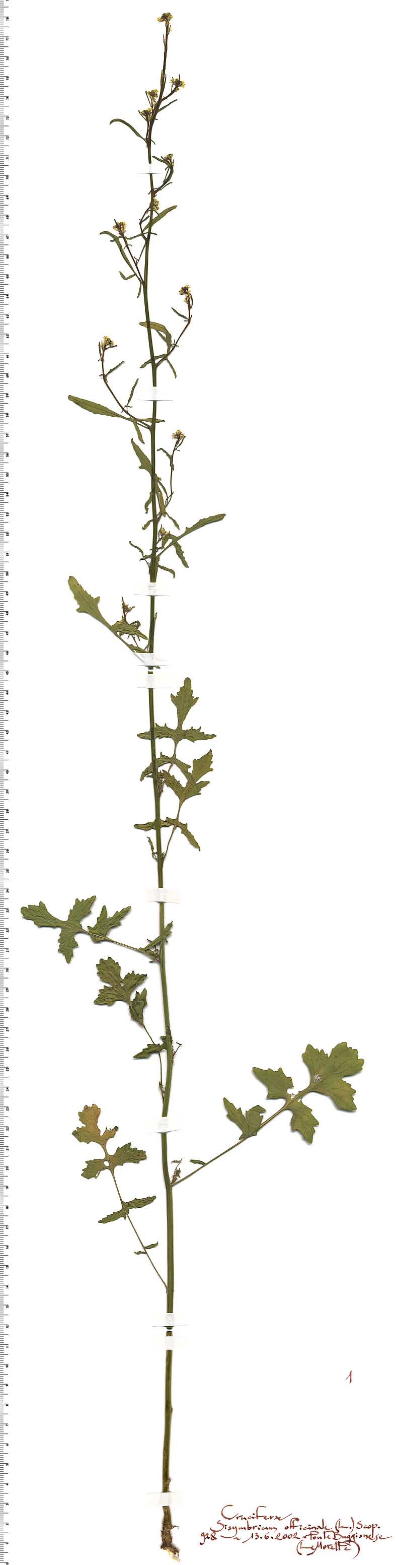 Etimologia: l’epiteto del genere sysimbrium = “sisimbrio” è quello già usato dai latini per indicare la pianta odorosa sacra a Venere [Varrone, Ovidio et al.]. L’epiteto specifico officinalis (dal latino opificina, opifex) = “laboratorio, fabbrica, officina” (allusione al trattamento che viene eseguito in laboratorio per estrarre componenti e principi attivi dalla pianta per uso utilitaristico o medicinale).