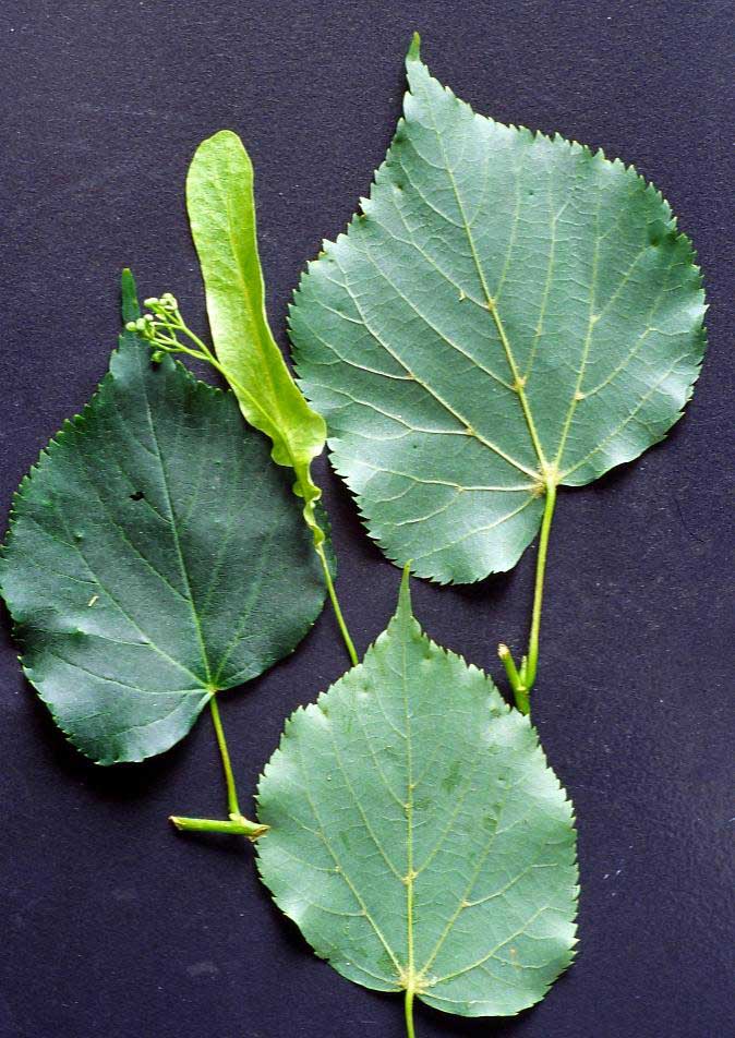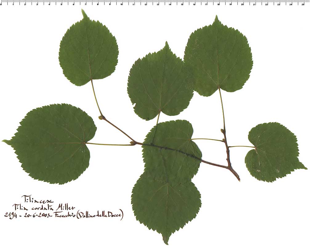 Caratteri distintivi: sul nostro territorio vegetano, allo stato spontaneo, solo due specie di Tigli: Tilia cordata Miller (Tiglio selvatico) e Tilia platyphyllos Scop (Tiglio nostrano), oltre all’ibrido naturale (Tiglio ibrido) cui essi danno origine (Tilia x vulgaris Hayne). La distinzione fra le due specie è abbastanza agevole se si osservano le piante con attenzione potendo basarsi su questi elementi: la dimensione delle foglie, che in Tilia cordata raggiungono al massimo la lunghezza di 8 cm e in Tilia platyphyllos 15 cm (tuttavia nei ricacci emessi a seguito di potature o ceduazioni, le foglie di entrambe le specie possono essere molto più grandi); la pagina inferiore delle foglie: entrambe le specie presentano ciuffi di peli all'ascella delle nervature, ma questi sono di color mattone in Tilia cordata e biancastri in Tilia platyphyllos; il frutto: quello di Tilia cordata è piccolo, con un diametro massimo di 8 mm, con costolature poco o per nulla evidenti e che, schiacciato fra le dita, si rompe facilmente, mentre quello di Tilia platyphyllos è più grosso, con 5 costole pronunciate e molto più resistente alla pressione; le gemme: in Tilia cordata sono visibili due scaglie (perule), in Tilia platyphyllos se ne osservano tre; i giovani rametti di Tilia cordata sono glabri mentre quelli di Tilia platyphyllos sono coperti da una sottile peluria, ossia cioè pubescenti.