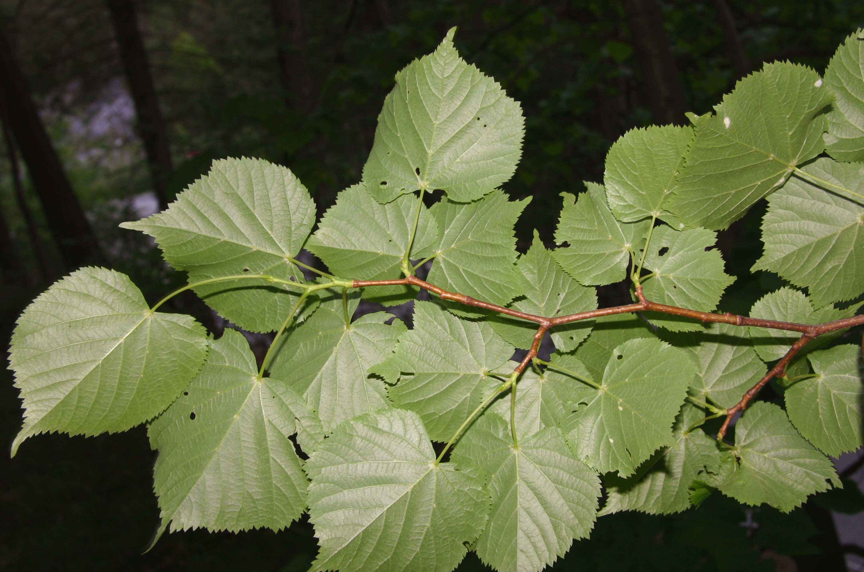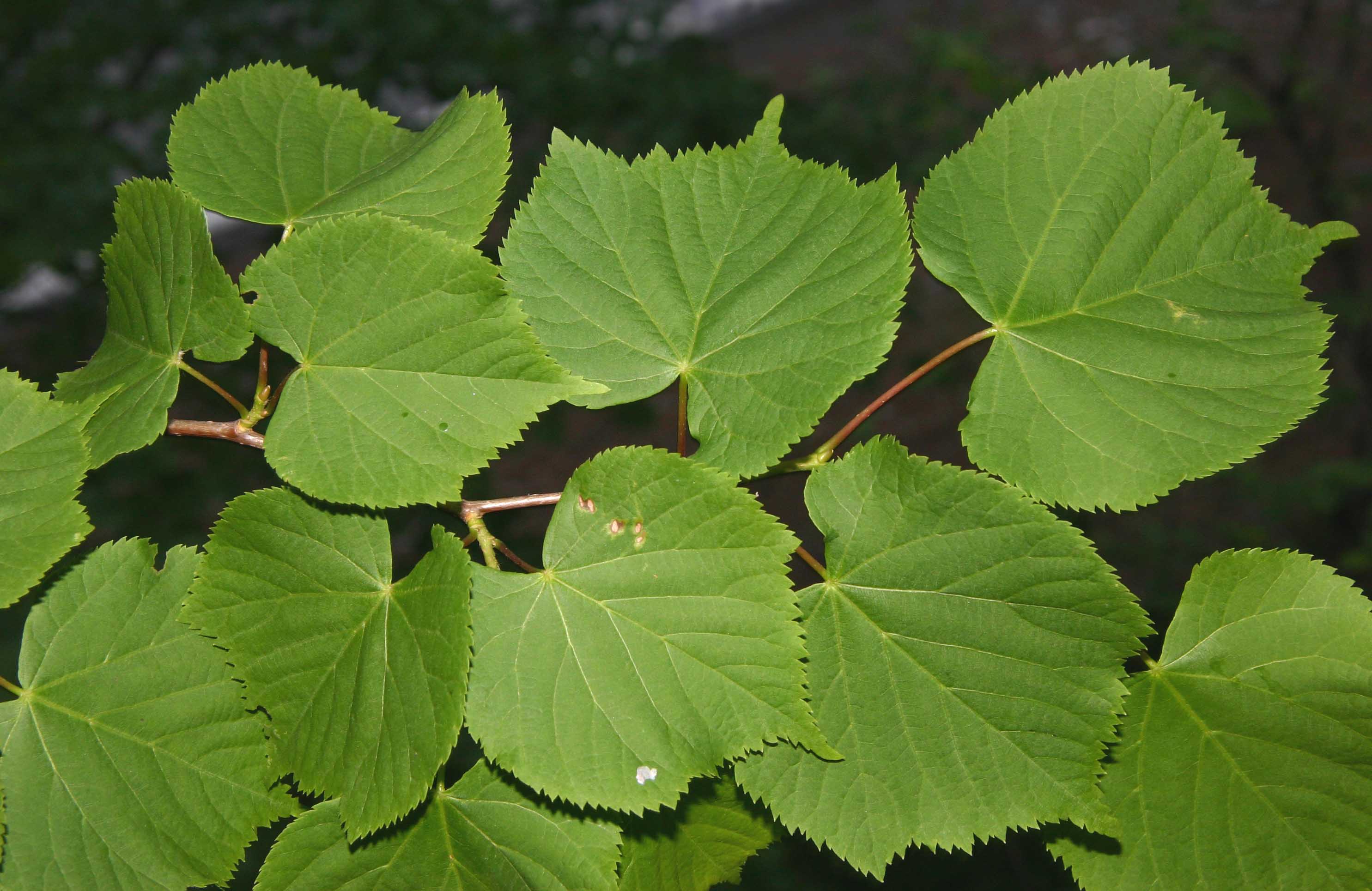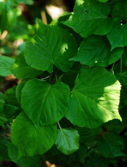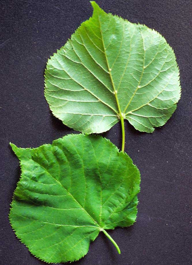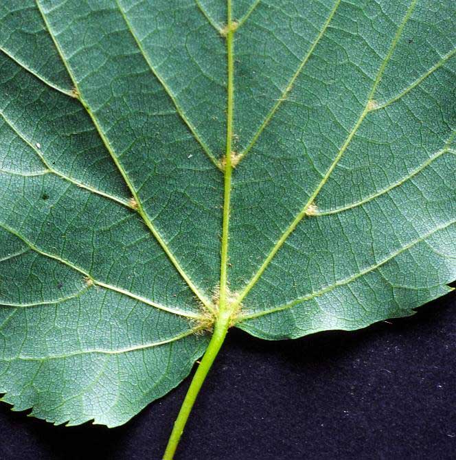 Foglie: caduche, alterne, portate da un picciolo lungo fino a 5-6 cm, relativamente piccole (lunghe 3-8 cm), con lamina subcordata ad apice acuminato e base asimmetricamente cuoriforme; il margine è acutamente e finemente seghettato. Verde scuro e un po’ lucide sulla pagina superiore, presentano la pagina inferiore glaucescente, glabra, salvo alle ascelle delle nervature (nervatura penninervia con asse centrale fortemente marcato), dove spiccano ciuffetti di peli cotonosi bruno rossicci o fulvastri.