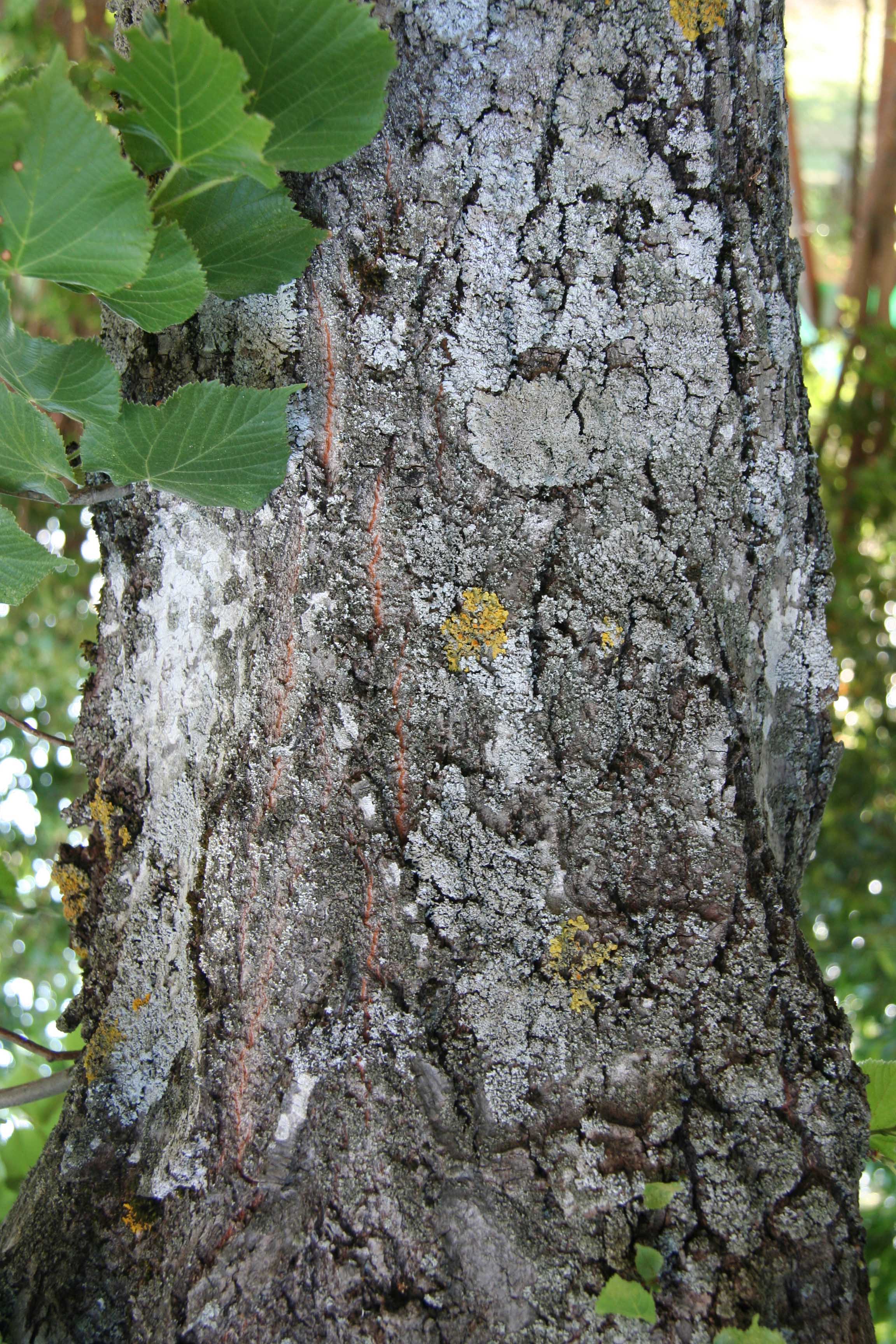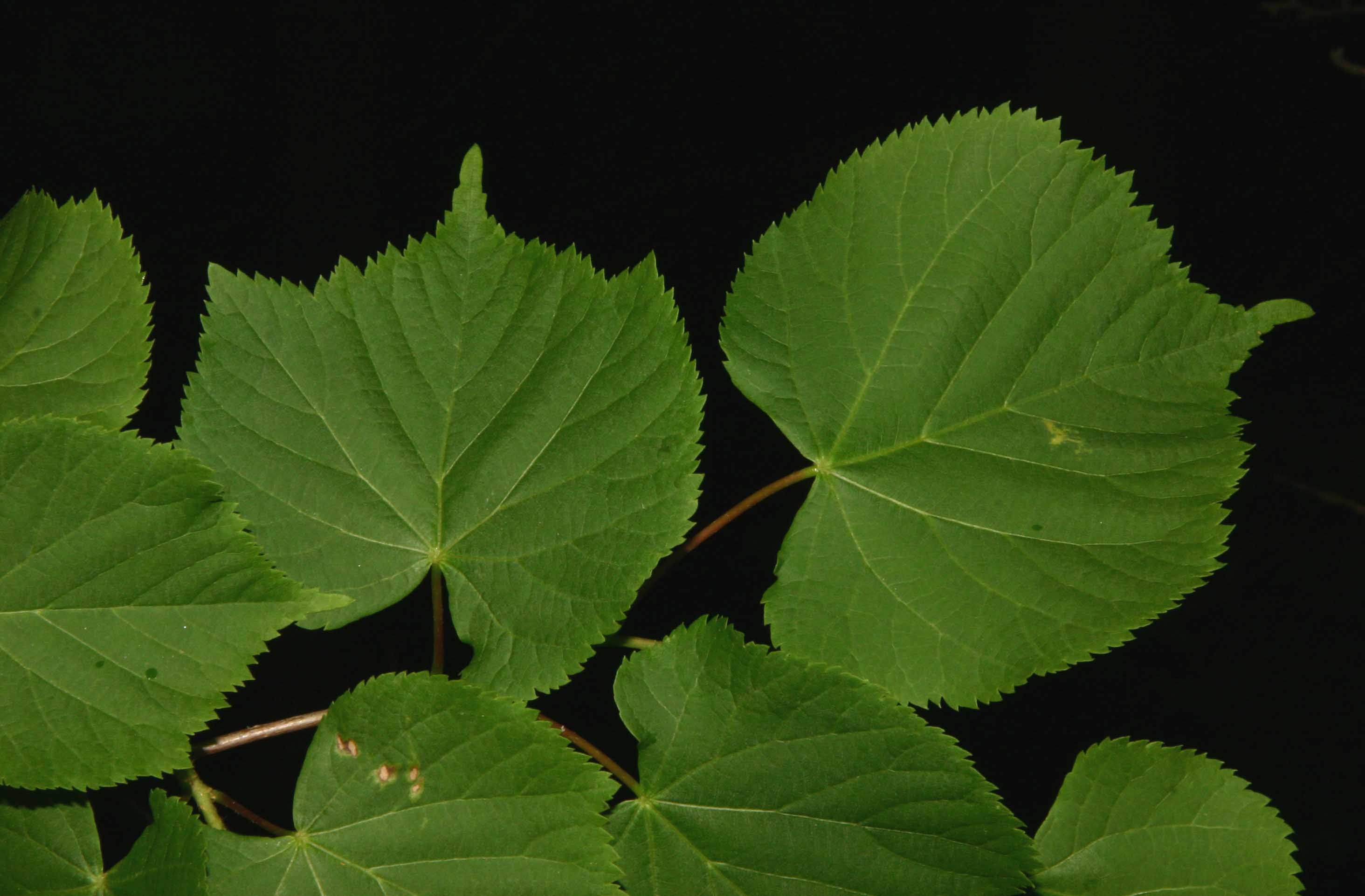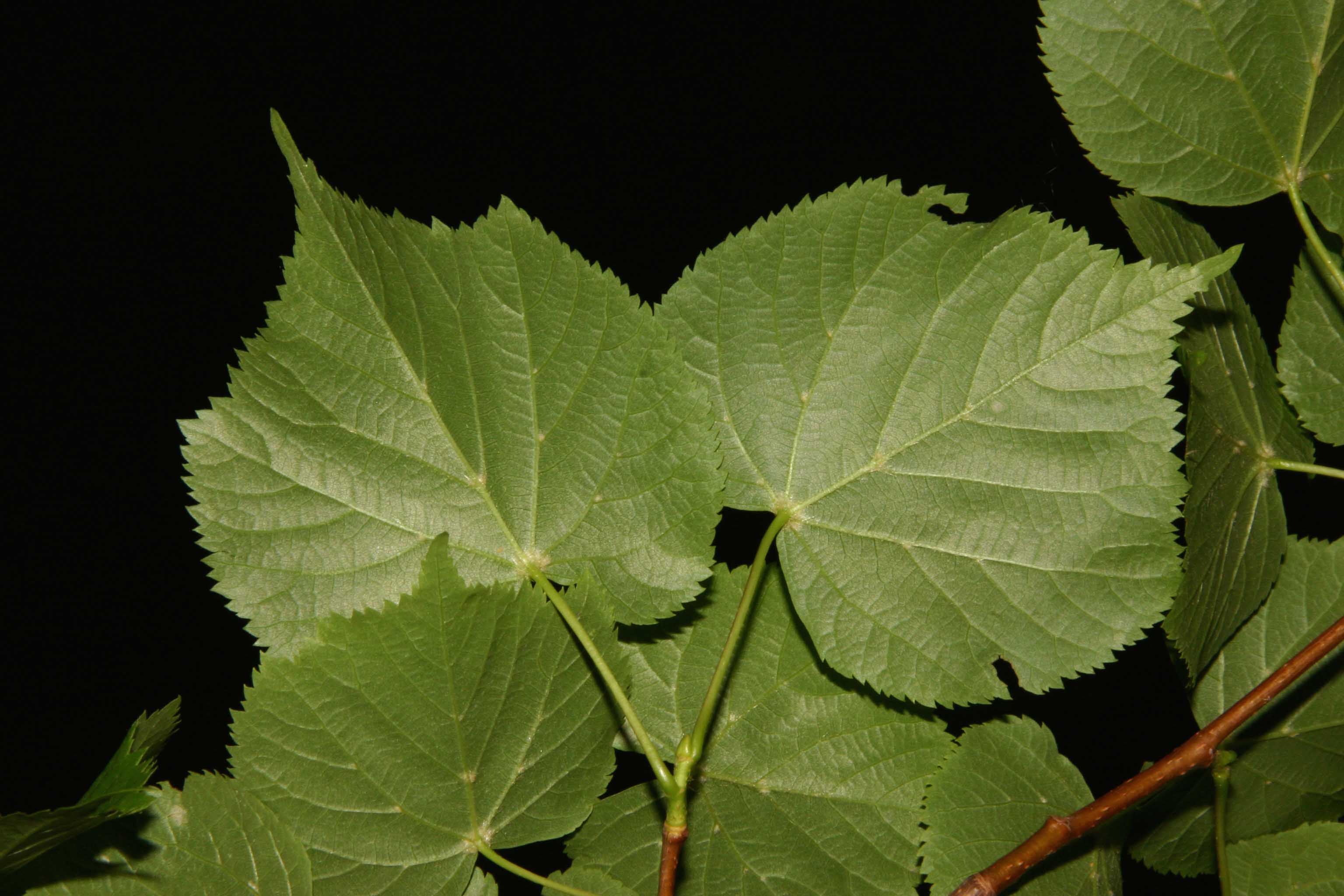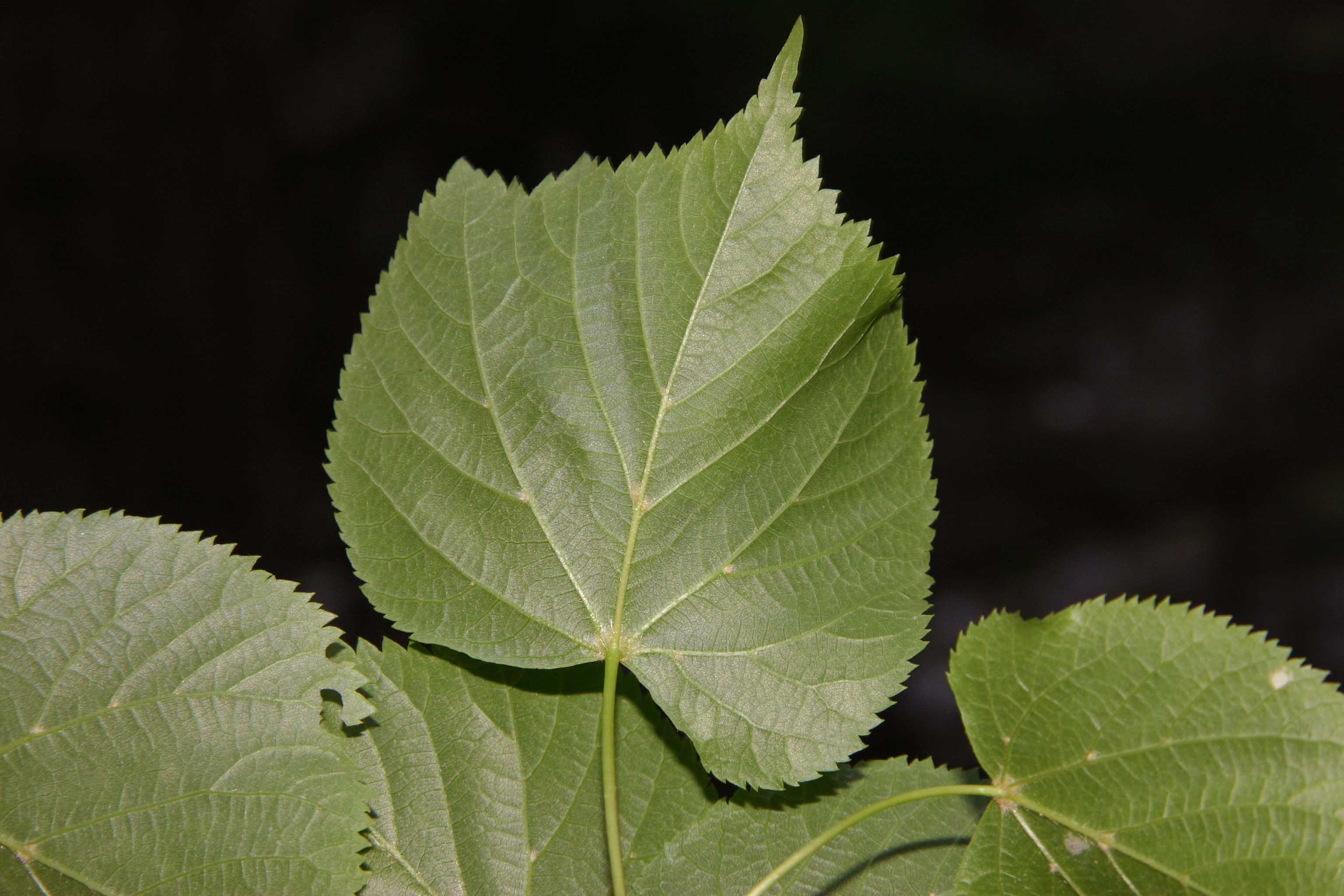 Foglie: caduche, alterne, portate da un picciolo lungo fino a 5-6 cm, relativamente piccole (lunghe 3-8 cm), con lamina subcordata ad apice acuminato e base asimmetricamente cuoriforme; il margine è acutamente e finemente seghettato. Verde scuro e un po’ lucide sulla pagina superiore, presentano la pagina inferiore glaucescente, glabra, salvo alle ascelle delle nervature (nervatura penninervia con asse centrale fortemente marcato), dove spiccano ciuffetti di peli cotonosi bruno rossicci o fulvastri.