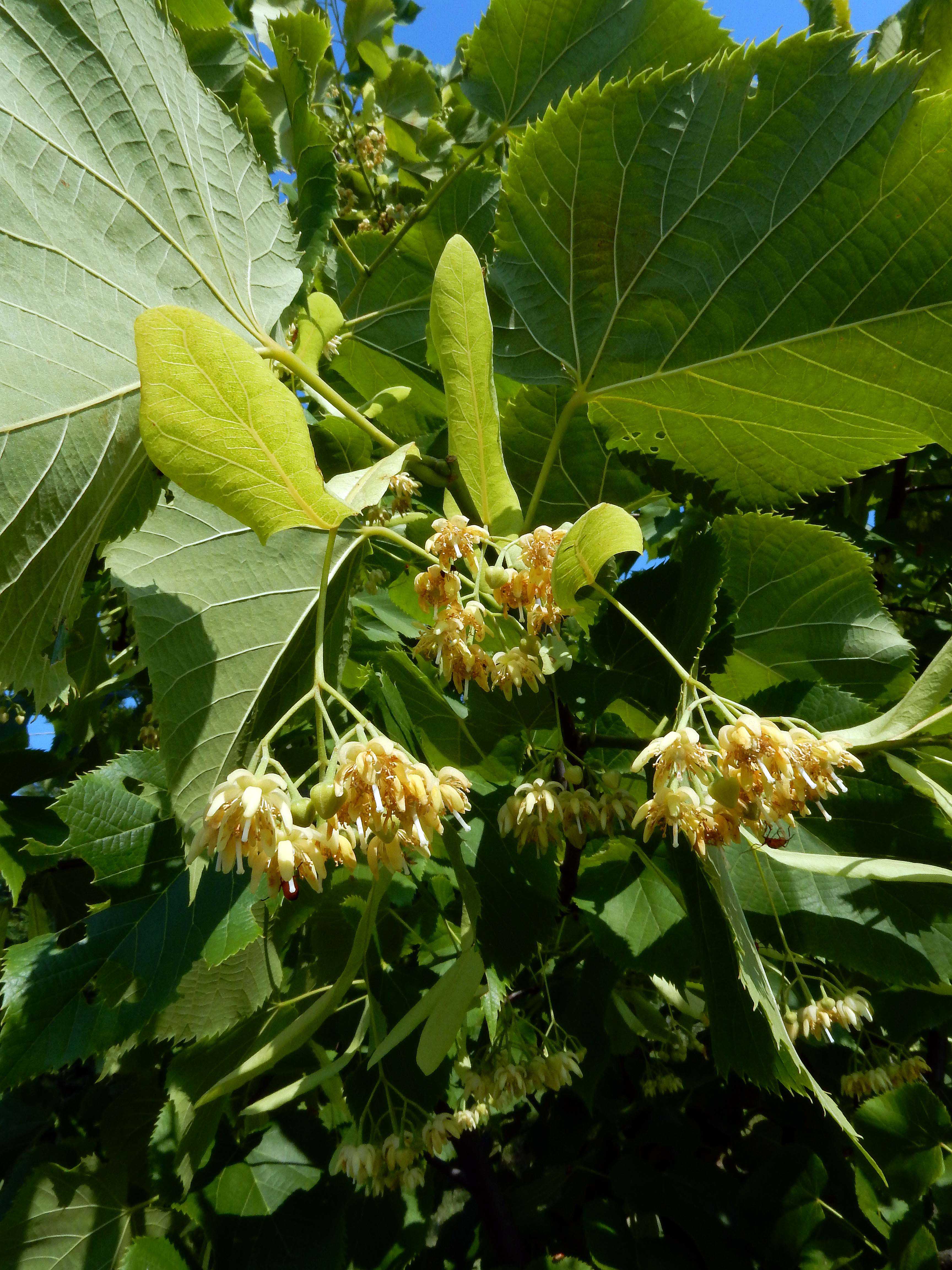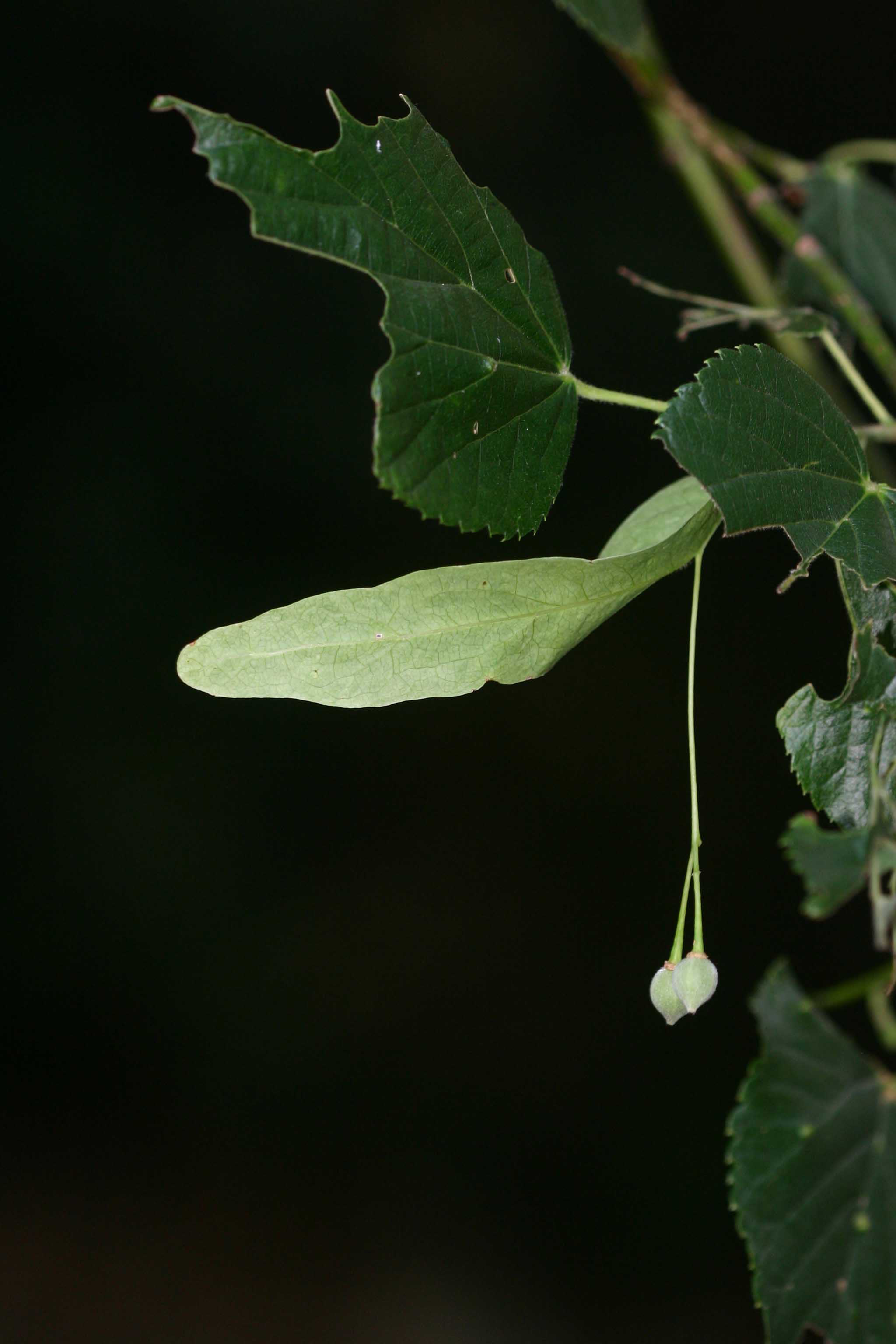 Fiore: i fiori, ermafroditi, attinomorfi, dialipetali, leggermente profumati, hanno un calice di 5 sepali lunghi 3 mm e una corolla con 5 petali, lunghi 3-8 mm, di colore giallognolo, stami numerosi (fino a 30), saldati alla base a formare numerosi ciuffetti apparentemente spiralati, sormontati da antere gialle; staminoidi assenti; il pistillo è unico con ovario supero pentaloculare, tomentoso; sono riuniti a gruppi di 3-10(-12) in infiorescenze non proprio pendule ma oblique dai lunghi peduncoli dette antele (infiorescenze in cui i peduncoli fiorali laterali sono più lunghi di quelli centrali). Le infiorescenze sono protette da una brattea fogliacea ovoidale di colore verde-pallido, che non raggiunge la base del peduncolo e che rimane nell'infruttescenza agendo come un'ala per il trasporto a distanza dei frutti.