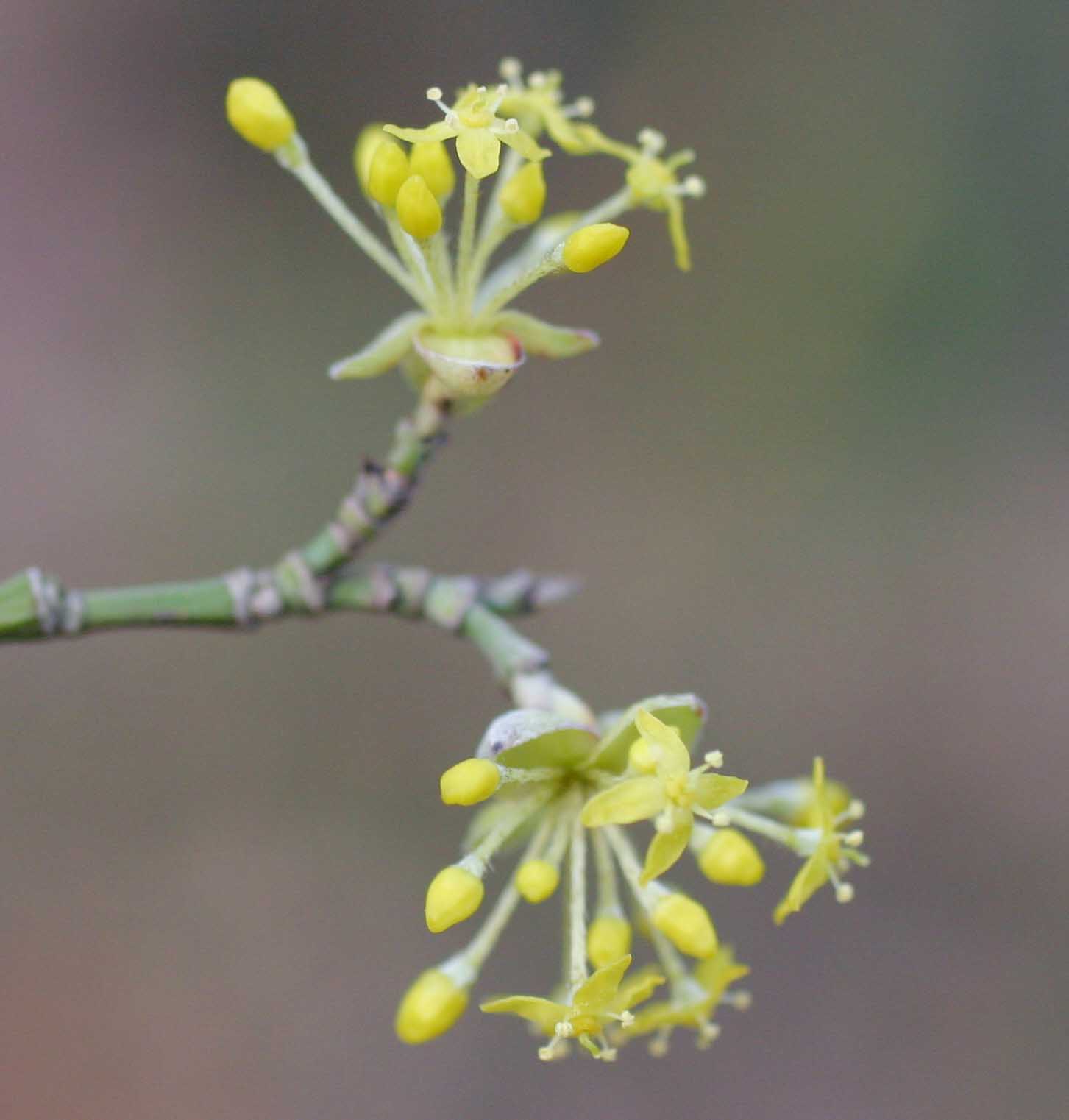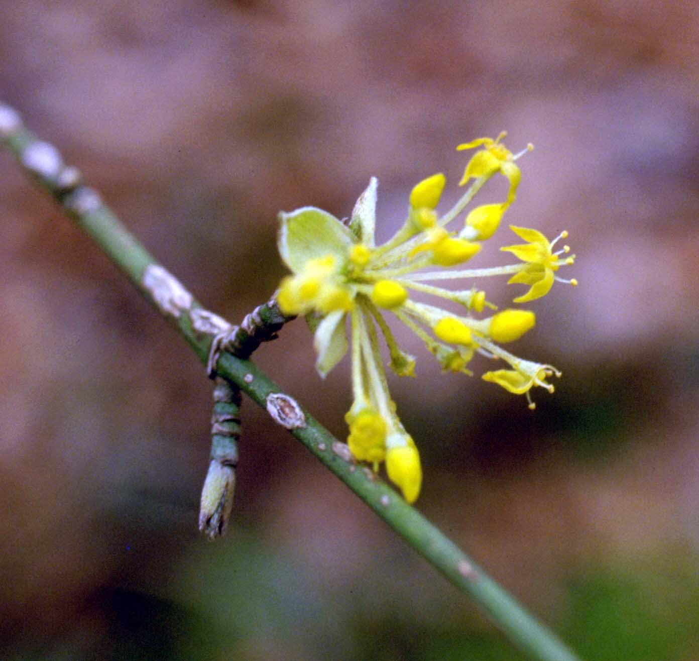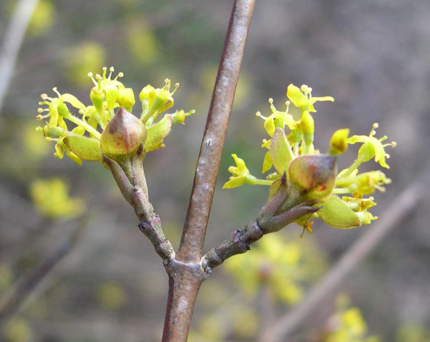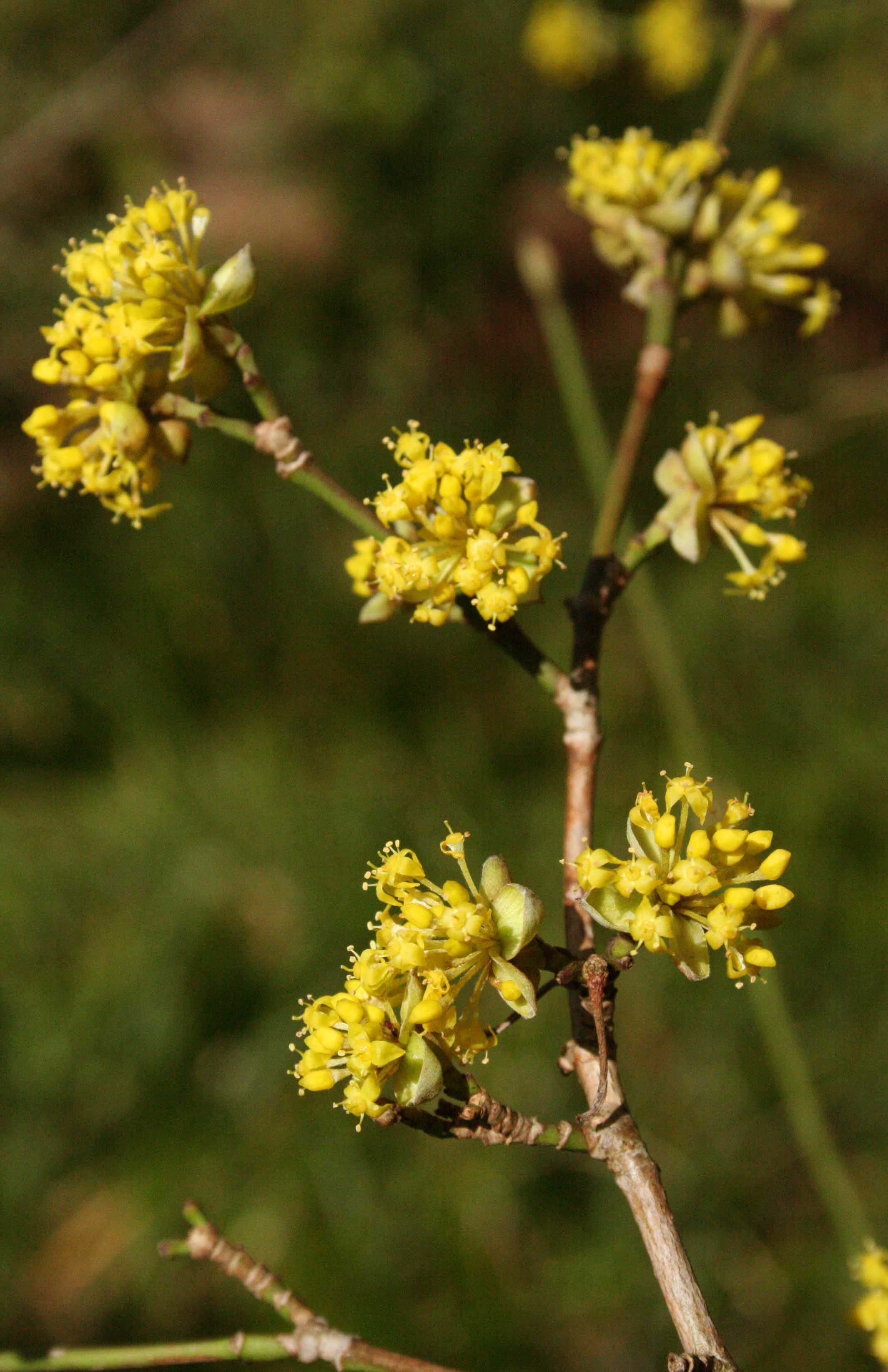 Fiore: i fiori precedono la foliazione: ermafroditi, compaiono in febbraio-marzo in piccole ombrelle di 10-25 fiori, larghe 2-3 cm, semplici, sessili, sono inserite a coppia (opposte) lungo i rami nudi dell’anno precedente; hanno un piccolo calice composto di quattro denti giallo verdastro e quattro petali gialli lanceolato acuminati, lunghi 2-3 mm, stami alterni con i petali inseriti attorno ad un disco nettarifero epigino; ovario infero, loculare, con un solo ovulo per loggia; stilo con stimma bottonifero.