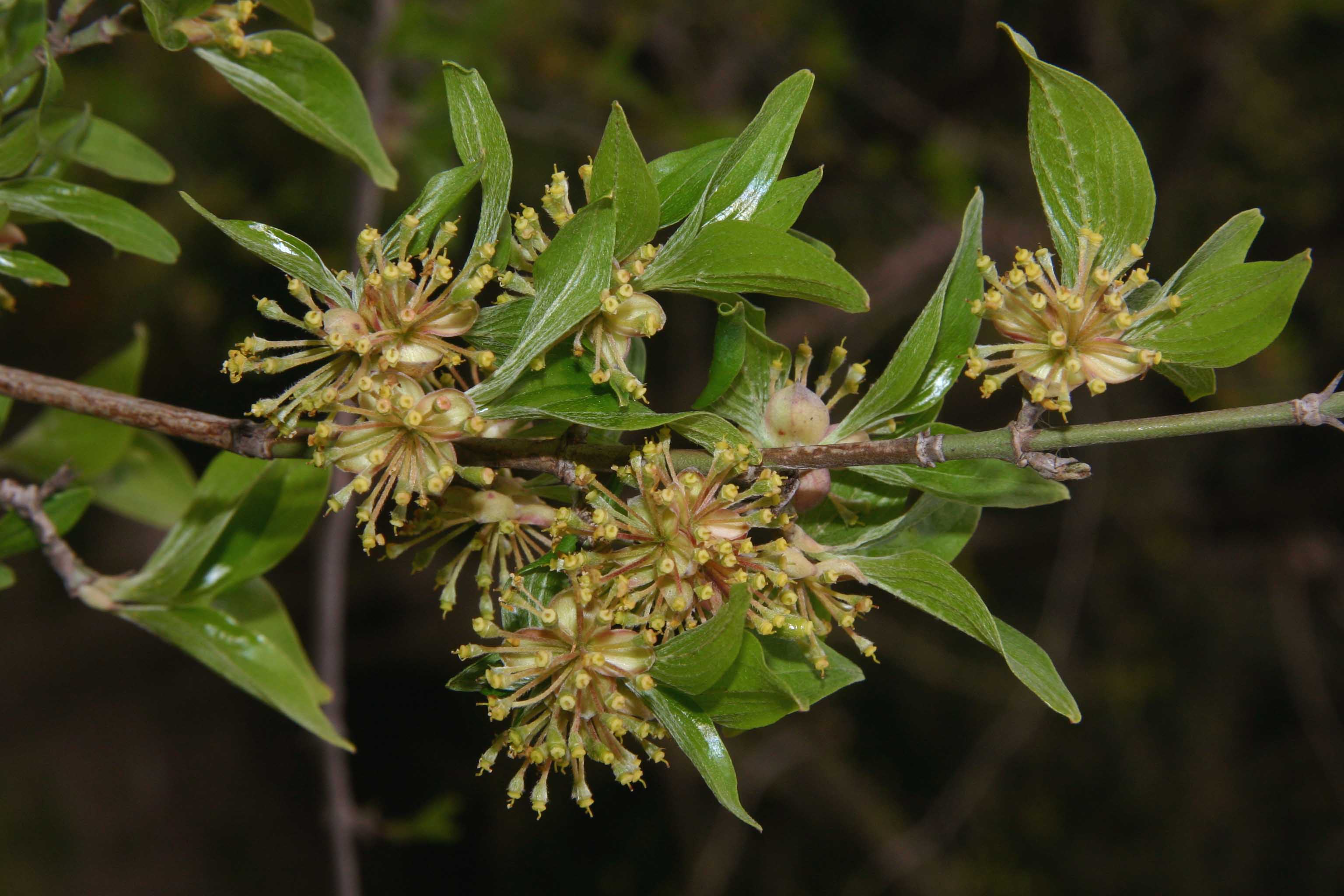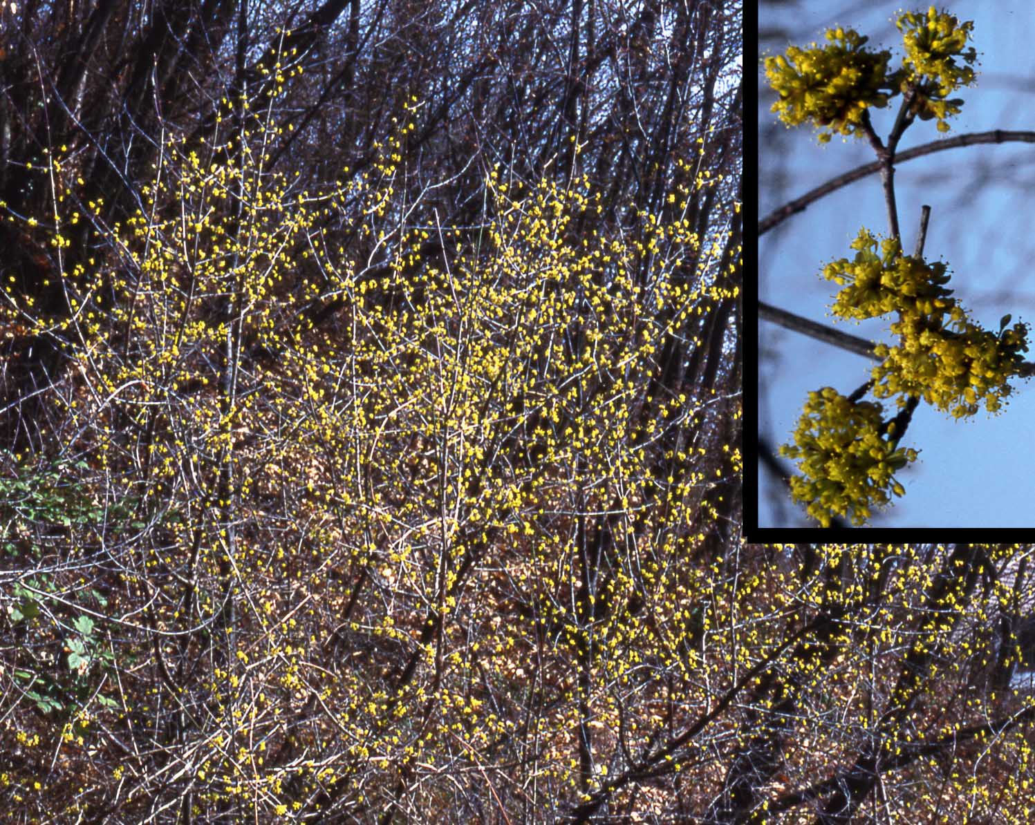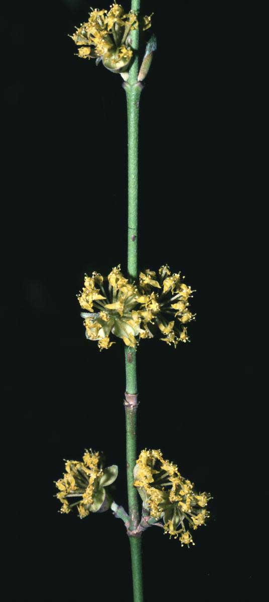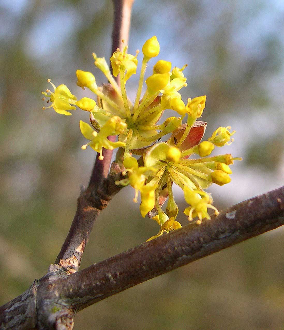 Fiore: i fiori precedono la foliazione: ermafroditi, compaiono in febbraio-marzo in piccole ombrelle di 10-25 fiori, larghe 2-3 cm, semplici, sessili, sono inserite a coppia (opposte) lungo i rami nudi dell’anno precedente; hanno un piccolo calice composto di quattro denti giallo verdastro e quattro petali gialli lanceolato acuminati, lunghi 2-3 mm, stami alterni con i petali inseriti attorno ad un disco nettarifero epigino; ovario infero, loculare, con un solo ovulo per loggia; stilo con stimma bottonifero.