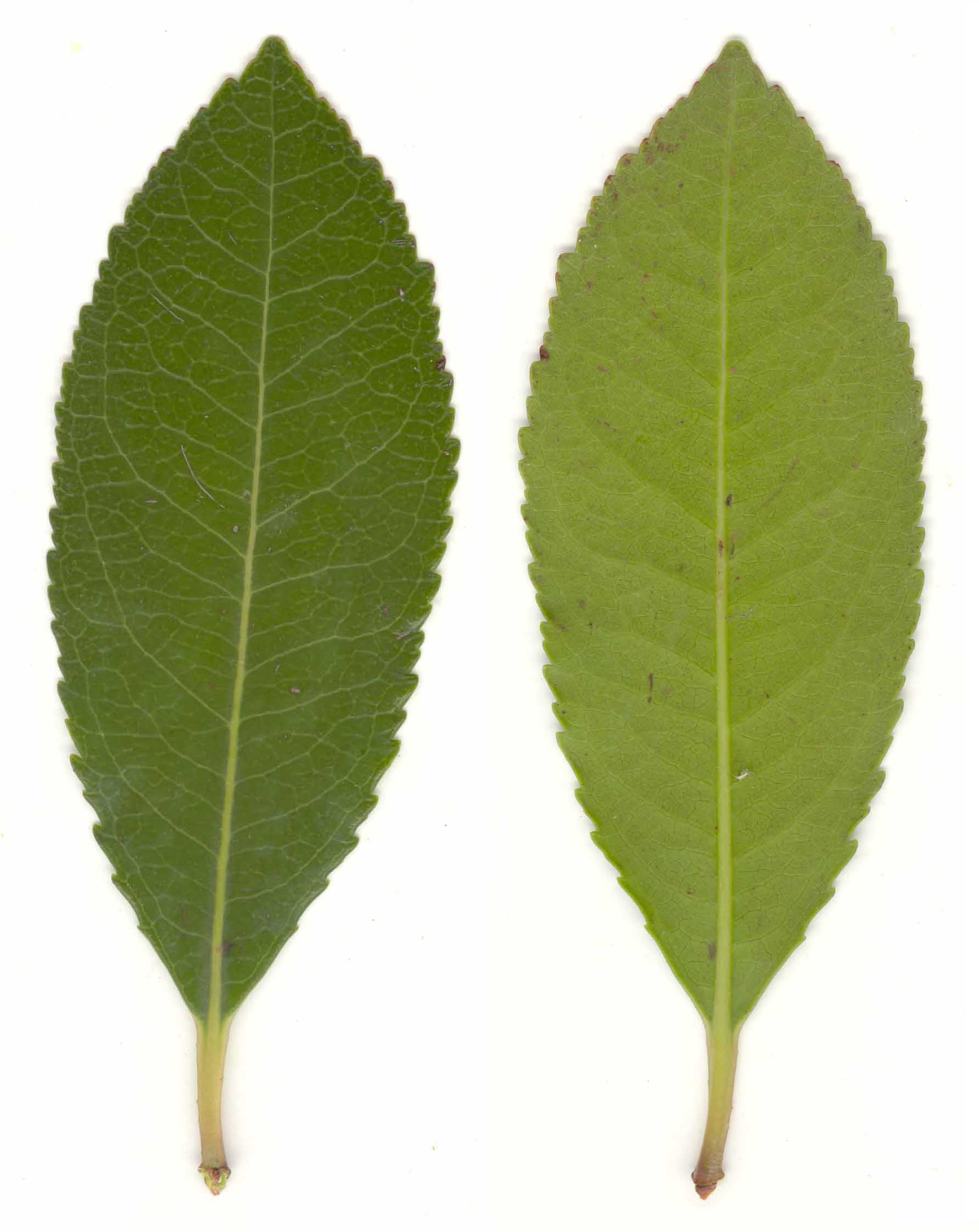 Foglie: le foglie, lunghe 7-12 cm, semplici, verde scuro e lucide sulla pagina superiore, più chiaro sulla pagina inferiore, sono sparse sui rametti con inserzione spiralato alterna, lamina oblunga e lanceolata, acuminata alle estremità, portate da un corto picciolo rosato, tomentoso; il margine è seghettato e presenta dei piccoli denti acuti; la consistenza è coriacea con nervature prominenti nella superficie inferiore.