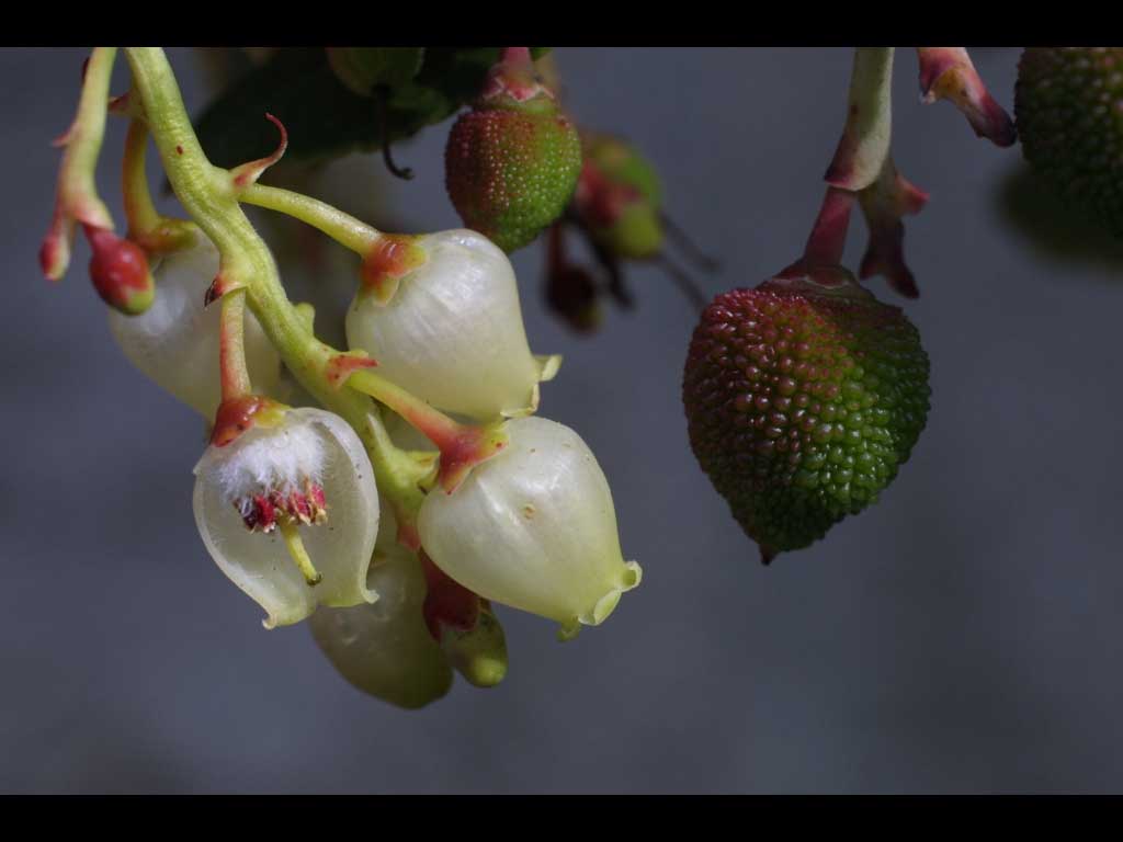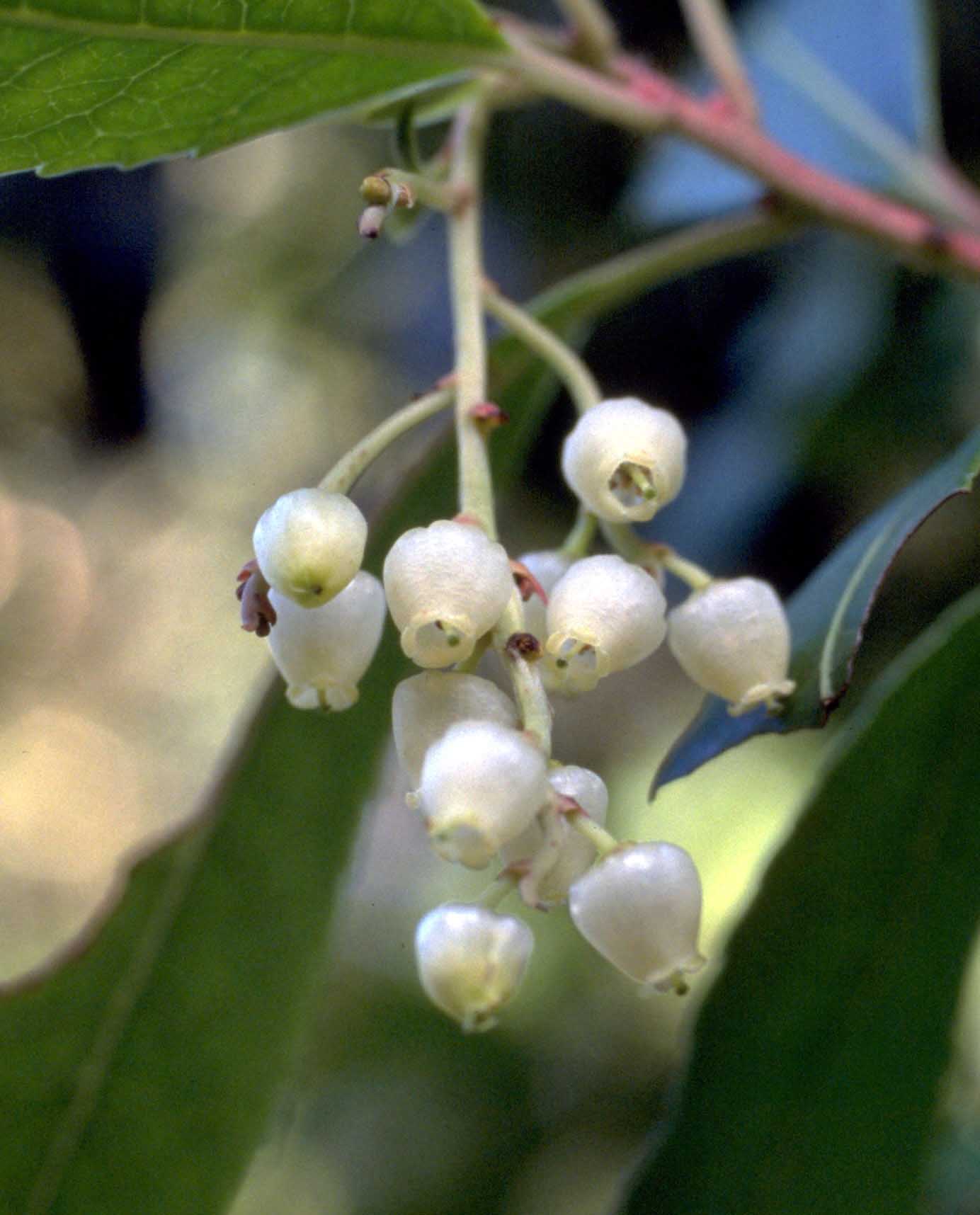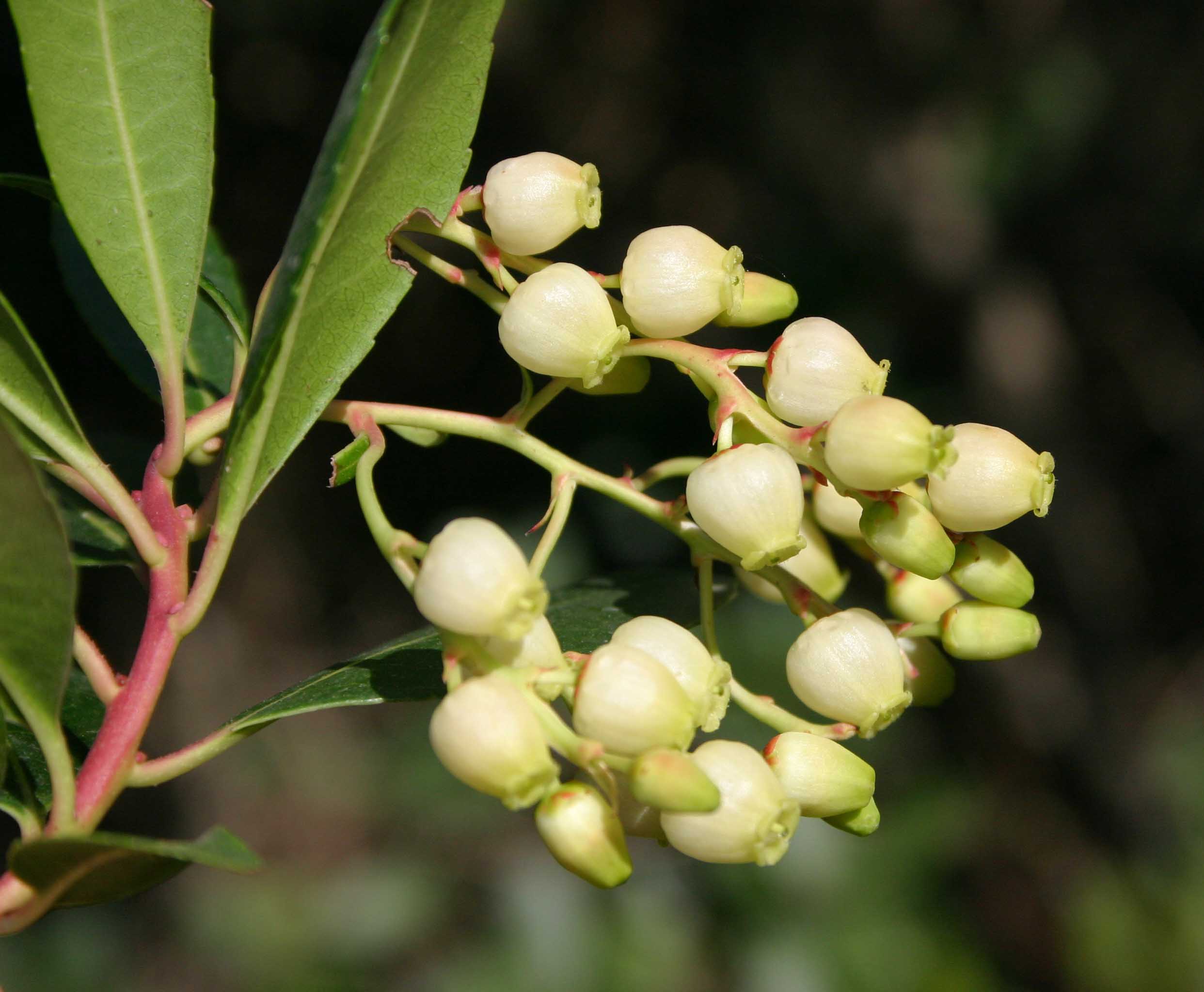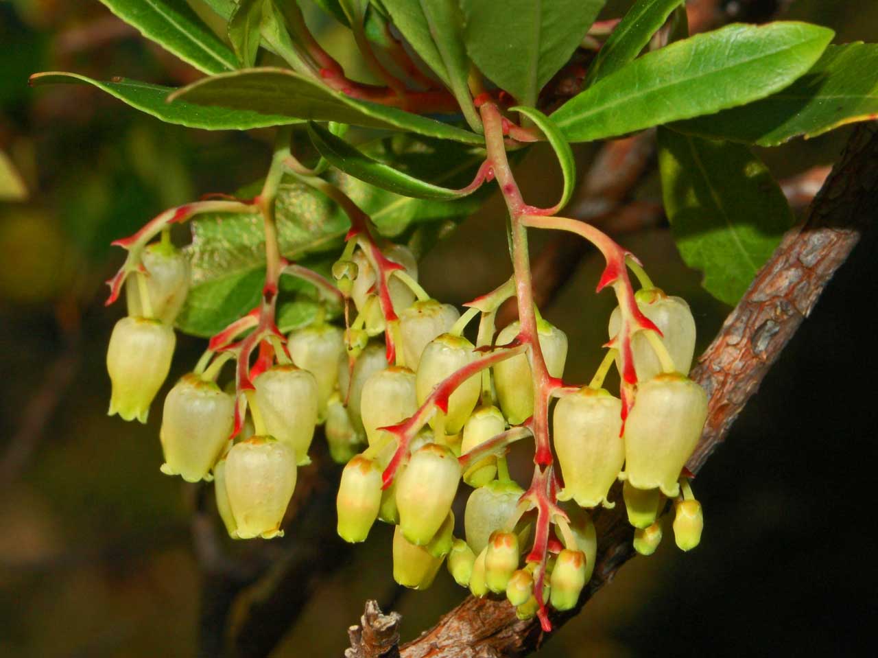 Fiore: fiori ermafroditi, riuniti in infiorescenze terminali a pannocchia pendula lunga 6-10 cm; il rachide dell’infiorescenza è arrossato e porta piccole brattee ovali e acute, anch’esse arrossate, all’ascella di ciascuna ramificazione e, di norma, anche all’ascella del peduncolo di ciascun fiore. I singoli fiori sono bianco giallastri, con calice gamosepalo, bruno, piccolissimo a 5 lobi arrotondati. La corolla è gamopetala, urceolata (campanula chiusa con apice aperto a corona), glabra nella superficie esterna, tomentosa in quella interna, terminata alla fauce da 5 piccoli denti volti verso l’esterno; larghi 6-10 mm e lunghi 8 mm, tipicamente peduncolati (i peduncoli e, a volte i fiori, presentano sfumature rosate più o meno intense). Androceo di 10 stami, inclusi, ancorati alla base della corolla e inseriti circolarmente attorno al gineceo, con filamenti clavati e con pelosità eretto patente, biancastri; antere brunastre oblungo lanceolate, bilobate, con ciascun lobo provvisto di una appendice biancastra a forma di tentacolo; gineceo con ovario supero, pentacarpellare; stilo eretto, biancastro, leggermente più corto dell’ampolla corollina; stimma giallo verdastro, leggermente suddiviso in 5 lobi radiali. Fioriscono in autunno (soprattutto ottobre e novembre), ma questo periodo può prolungarsi fino a marzo dell’anno successivo.