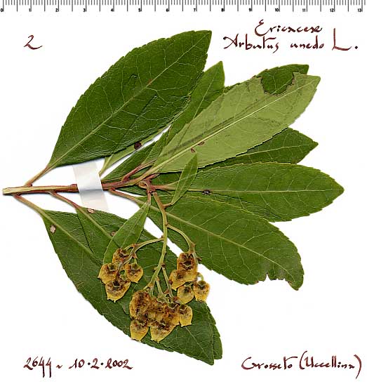 Etimologia: sia l’epiteto del genere che quello specifico erano nomi con i quali i Latini indicavano questa specie. L’epiteto del genere è il nome arbutus, -i, f. = “corbezzolo” [Virgilio et al.] con il quale veniva indicata la sola pianta mentre con arbutum, -i, n., si indicava sia la pianta che il frutto. L’epiteto del genere unedo, -onis ha sia il significato di “corbezzolo” (pianta) [Plinio], sia di “corbezzola” (frutto del corbezzolo) [Plinio et al.] e deriverebbe dalla contrazione del periodo unum edo = “ne mangio uno (soltanto)” con allusione al sapore delle bacche che, pur essendo dolci, non sono universalmente gradite.