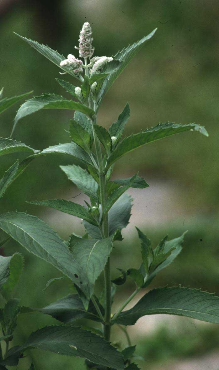 Foglie: le foglie, opposte, verdi, sono molto variabili sia nella forma che nelle dimensioni: vanno da ovali a lanceolate, acuminate all’apice, lunghe 4-10 cm; sono normalmente sessili o hanno un brevissimo picciolo; il margine è dentato con denti acuti rivolti in avanti; sulla pagina inferiore sono ben visibili la nervatura principale e quelle secondarie più o meno parallele tra loro. Le foglie hanno peli sparsi sulla pagina superiore e sono bianco tomentose sulla pagina inferiore.