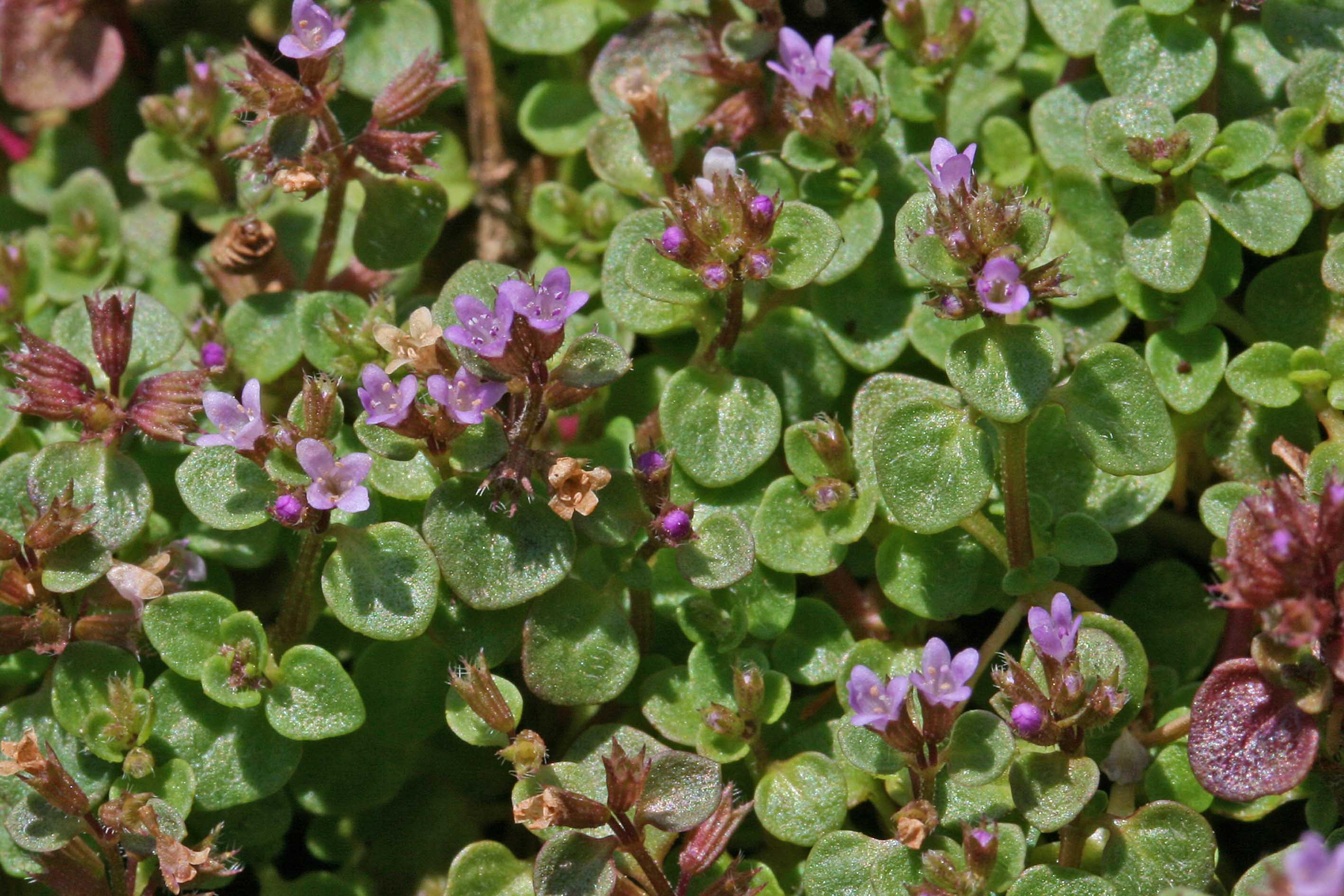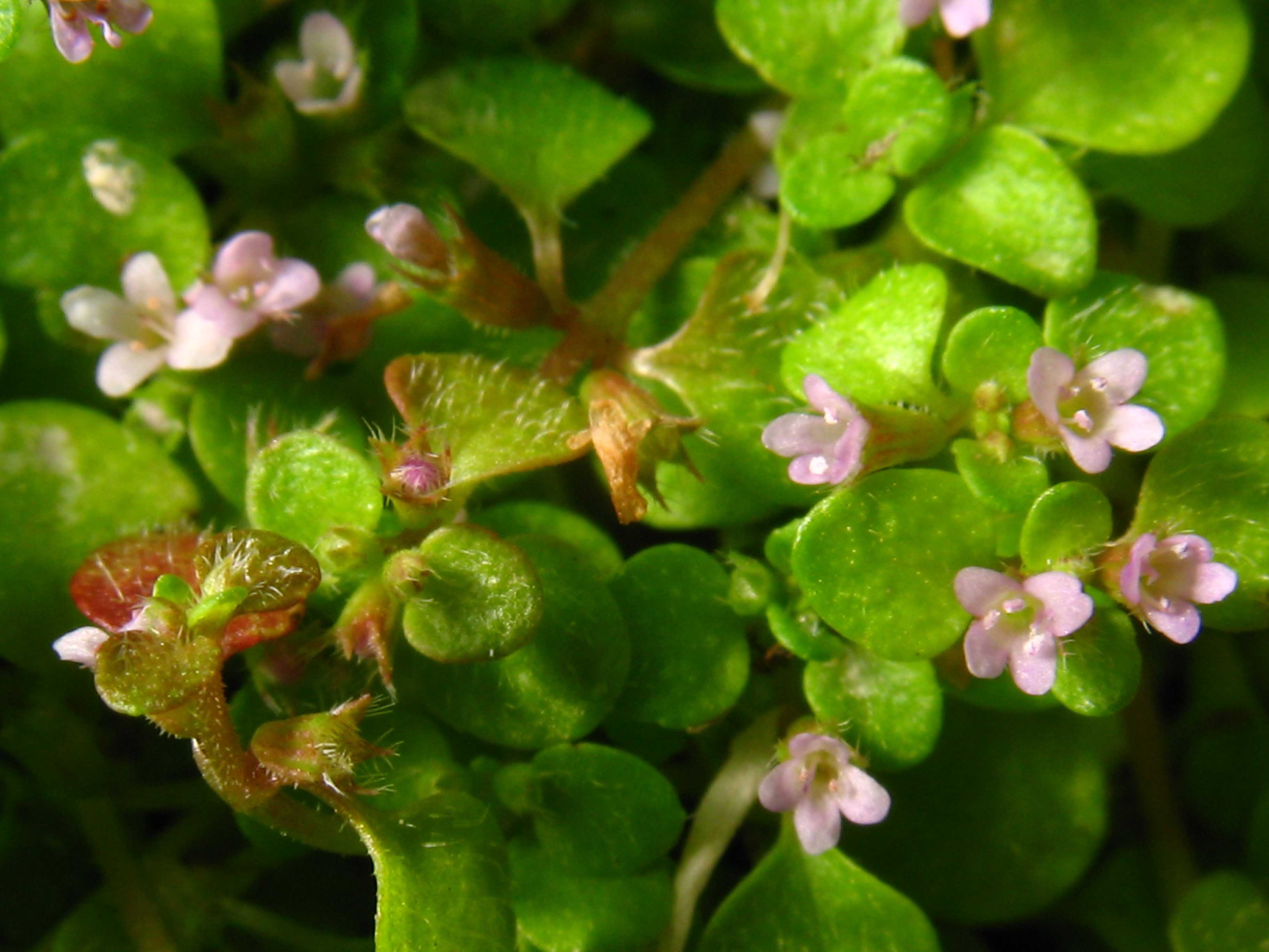 Fiore: uno tre in verticillastri terminali all'ascella di foglie simili a quelle dei rami sterili, distintamente pedicellati e spesso riuniti su di un peduncolo unico con due bratteole lineari acuminate. Calice tubuloso-campanulato, normalmente barbato alla fauce, rigonfio alla fruttificazione (1,5-1,8 x 0,8-1 mm), con 10 nervi longitudinali, peloso-irto, subbilabiato con 3 denti superiori triangolari acuti e i due inferiori più stretti e lunghi, acuminato-subulati, tutti ciliati al margine. Corolla piccola (circa 2 mm di diametro), roseo-lilacina, regolare con 3-4 lobi subeguali, ovato-rotondati, interi o talvolta il superiore retuso, con gli altri 3 ravvicinati costituendo una corolla bilabiata. Stami 4, raram. 3-2, epicorollini inseriti alla base delle digitazioni dei lobi, antere subrotonde, biloculari, introrse, violacee da immature, polline bianco. Stigma poco più in basso delle antere, bifido, con lacinie quasi uguali divergenti e ricurve a maturità.