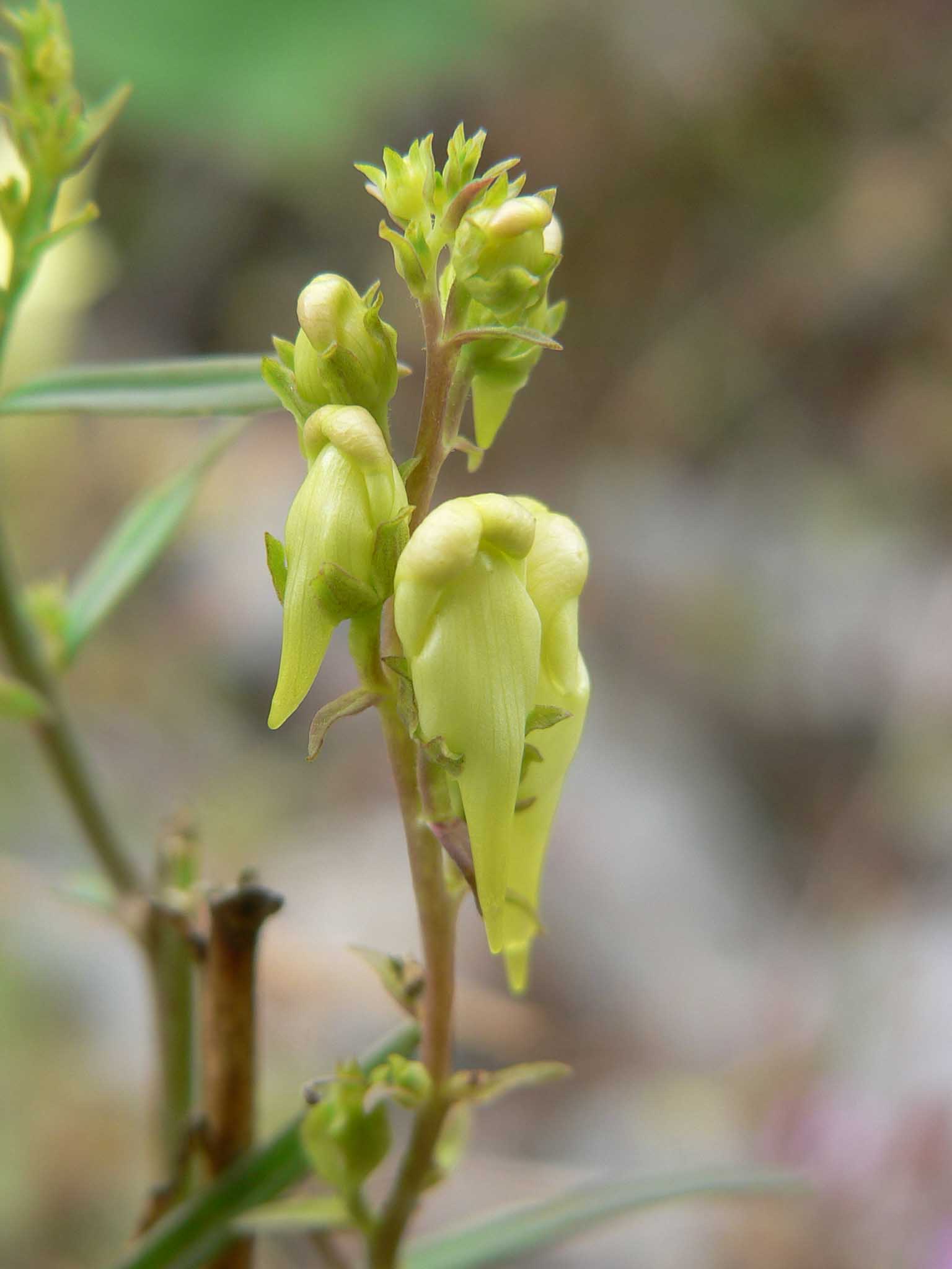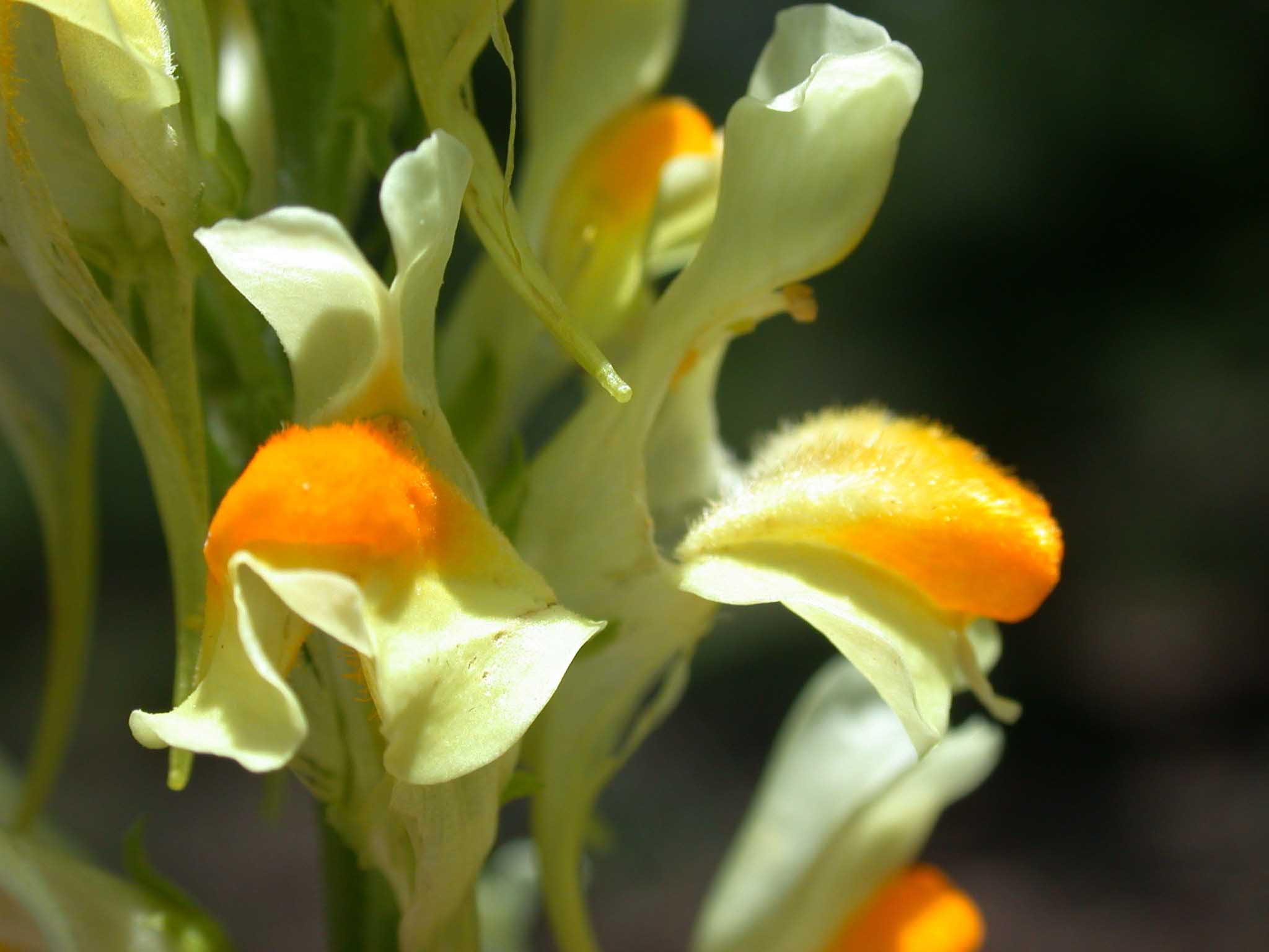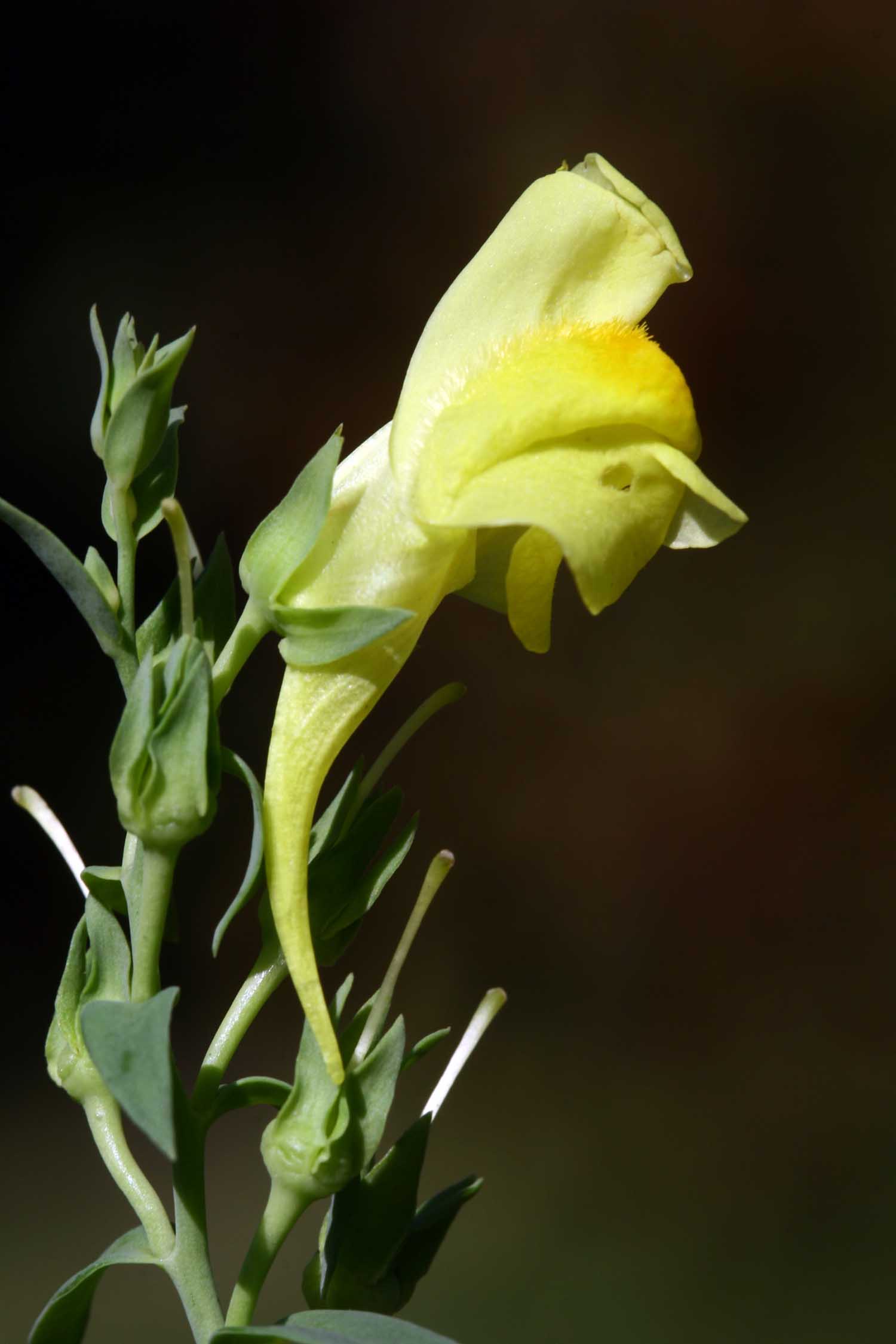 Fiore: i fiori, zigomorfi gamopetali, tetrameri, disposti all’ascella delle foglie superiori, peduncolati, accompagnati da brattee lineari, sono riuniti in racemi allungati. Tutta l’infiorescenza è pelosa con ghiandole frammiste ai peli. Il calice, lungo 2-3 mm, campanulato, è glabro e quasi completamente diviso in lacinie lanceolate. La corolla, gialla, lunga 2,5-3 cm, è tubulare, divisa alla fauce in due labbra: il superiore è rivolto verso l’alto e diviso in due lacinie, l’inferiore è trilobato e ingrossato alla base in una protuberanza arancione (palato) che chiude la fauce; il tubo è prolungato in uno sperone di forma conica, quasi diritto, lungo circa un centimetro. Androceo di 4 stami inseriti sul tubo corollino; gineceo con ovario supero sincarpellare.