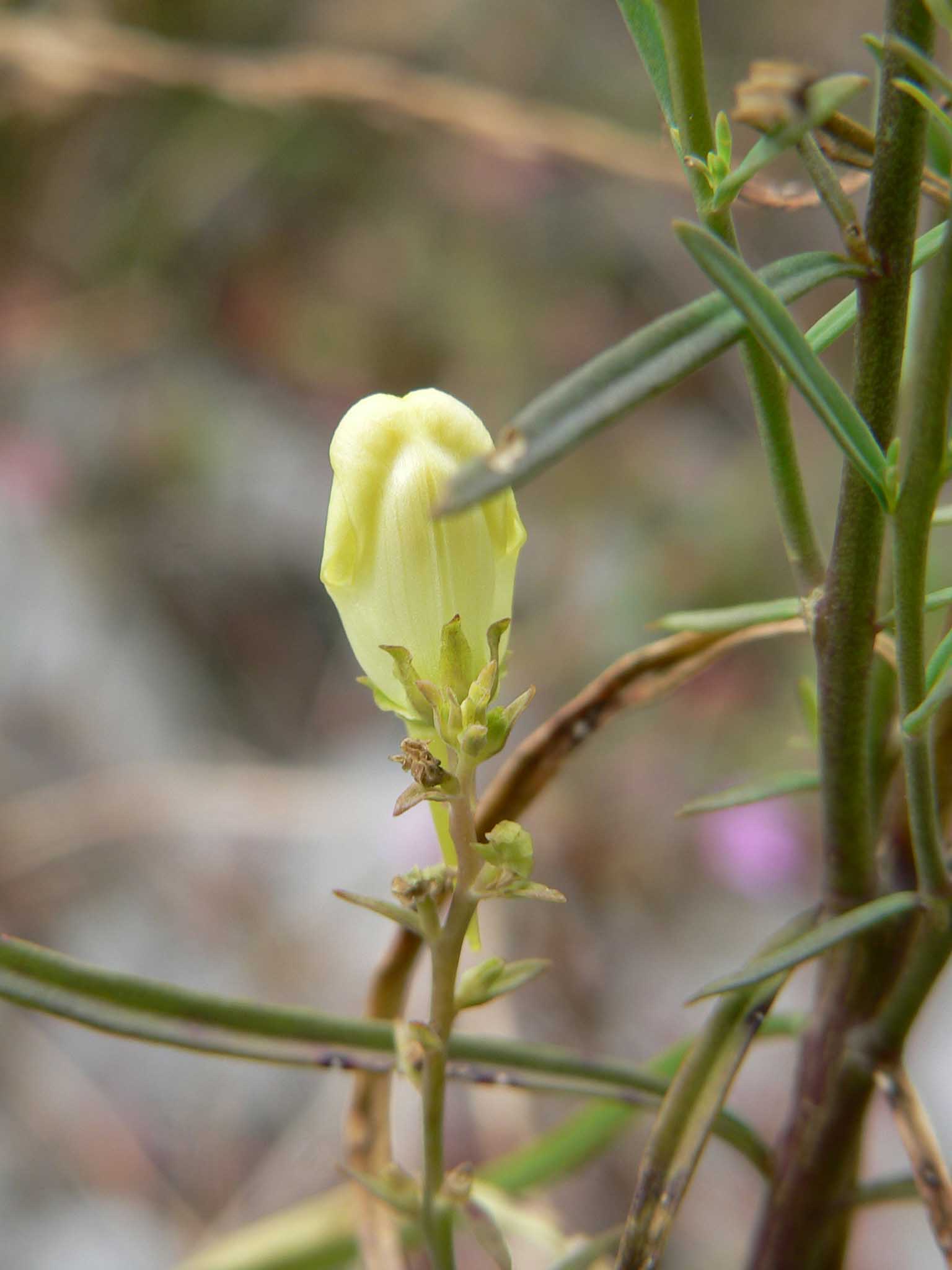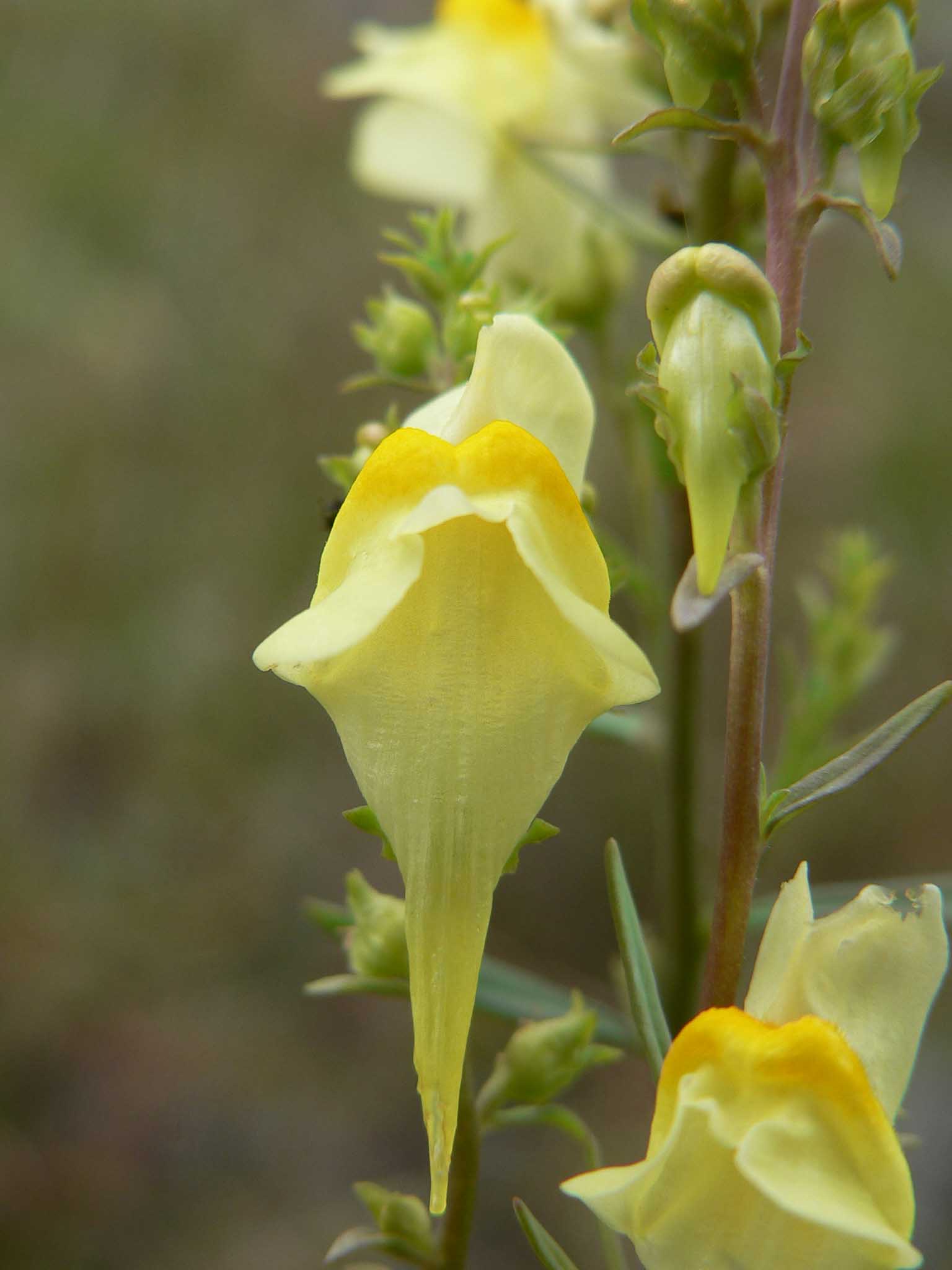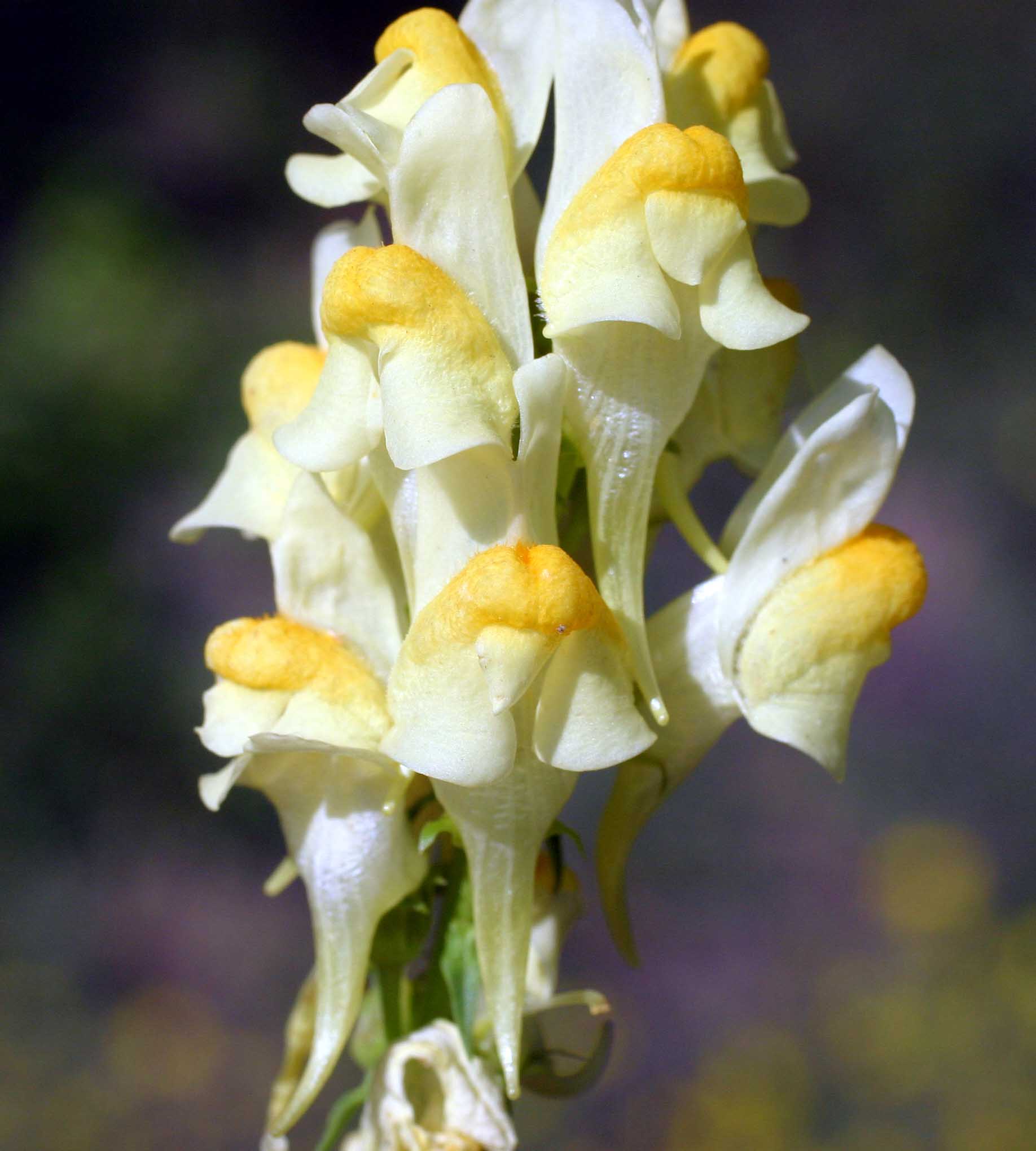 Fiore: i fiori, zigomorfi gamopetali, tetrameri, disposti all’ascella delle foglie superiori, peduncolati, accompagnati da brattee lineari, sono riuniti in racemi allungati. Tutta l’infiorescenza è pelosa con ghiandole frammiste ai peli. Il calice, lungo 2-3 mm, campanulato, è glabro e quasi completamente diviso in lacinie lanceolate. La corolla, gialla, lunga 2,5-3 cm, è tubulare, divisa alla fauce in due labbra: il superiore è rivolto verso l’alto e diviso in due lacinie, l’inferiore è trilobato e ingrossato alla base in una protuberanza arancione (palato) che chiude la fauce; il tubo è prolungato in uno sperone di forma conica, quasi diritto, lungo circa un centimetro. Androceo di 4 stami inseriti sul tubo corollino; gineceo con ovario supero sincarpellare.