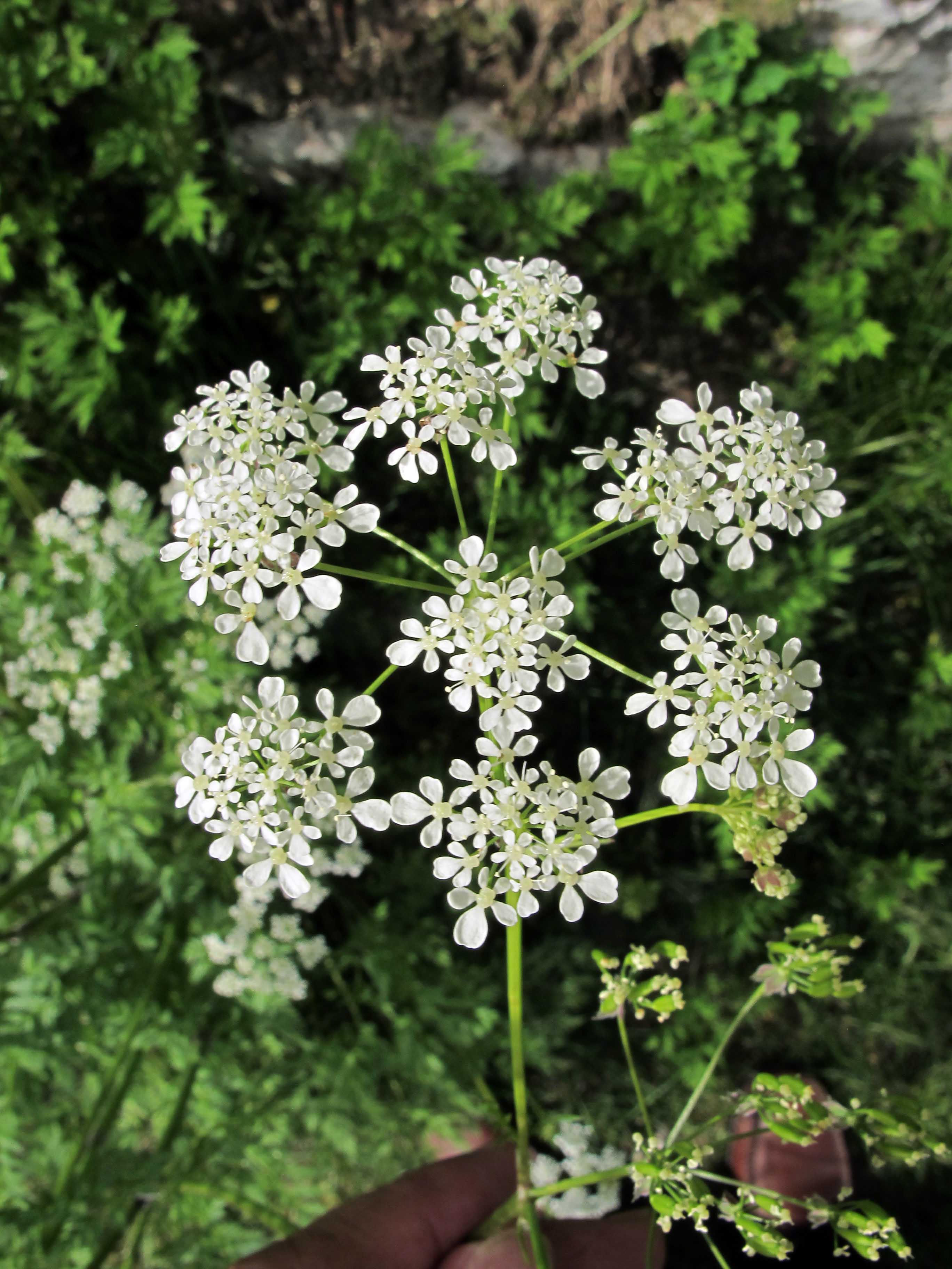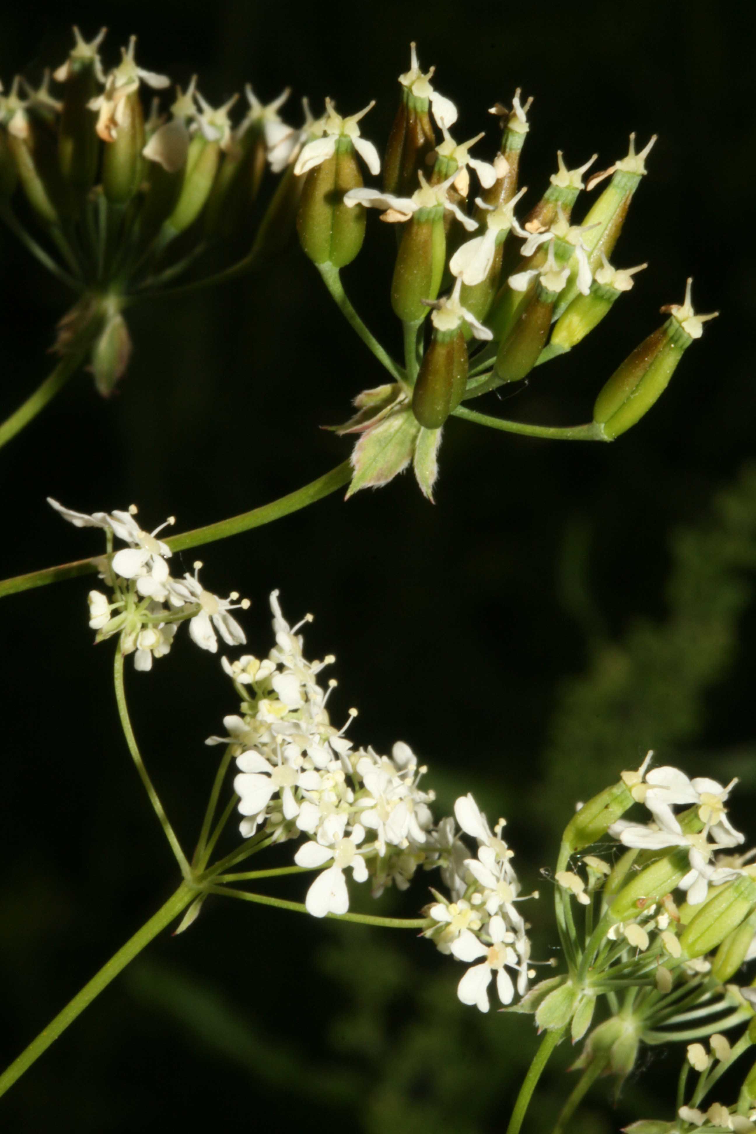 Fiore: I piccoli fiori, attinomorfi, dialipetali, sono riuniti in un'ombrella larga 5-7 cm, a 8-16 raggi glabri, con involucro nullo; l'ombrella è a sua volta composta di ombrellette circondate da un involucro di 5 bratteole membranacee in parte caduche, largamente lanceolate, acuminate, con bordi cigliati che hanno fiori maschili al centro circondati da fiori ermafroditi. Le ombrelle secondarie o terziarie portano di solito fiori esclusivamente maschili che raggiungono o sorpassano l'ombrella terminale. Corolla larga 3-4 mm, con 5 petali bianchi, non cigliati; i fiori più esterni nelle infiorescenze, hanno petali di dimensioni diverse. Androceo di 5 stami con filamenti assottigliati all'apice, bianco verdastri, con antere biloculari gialle. Gineceo con ovario infero, bicarpellare.