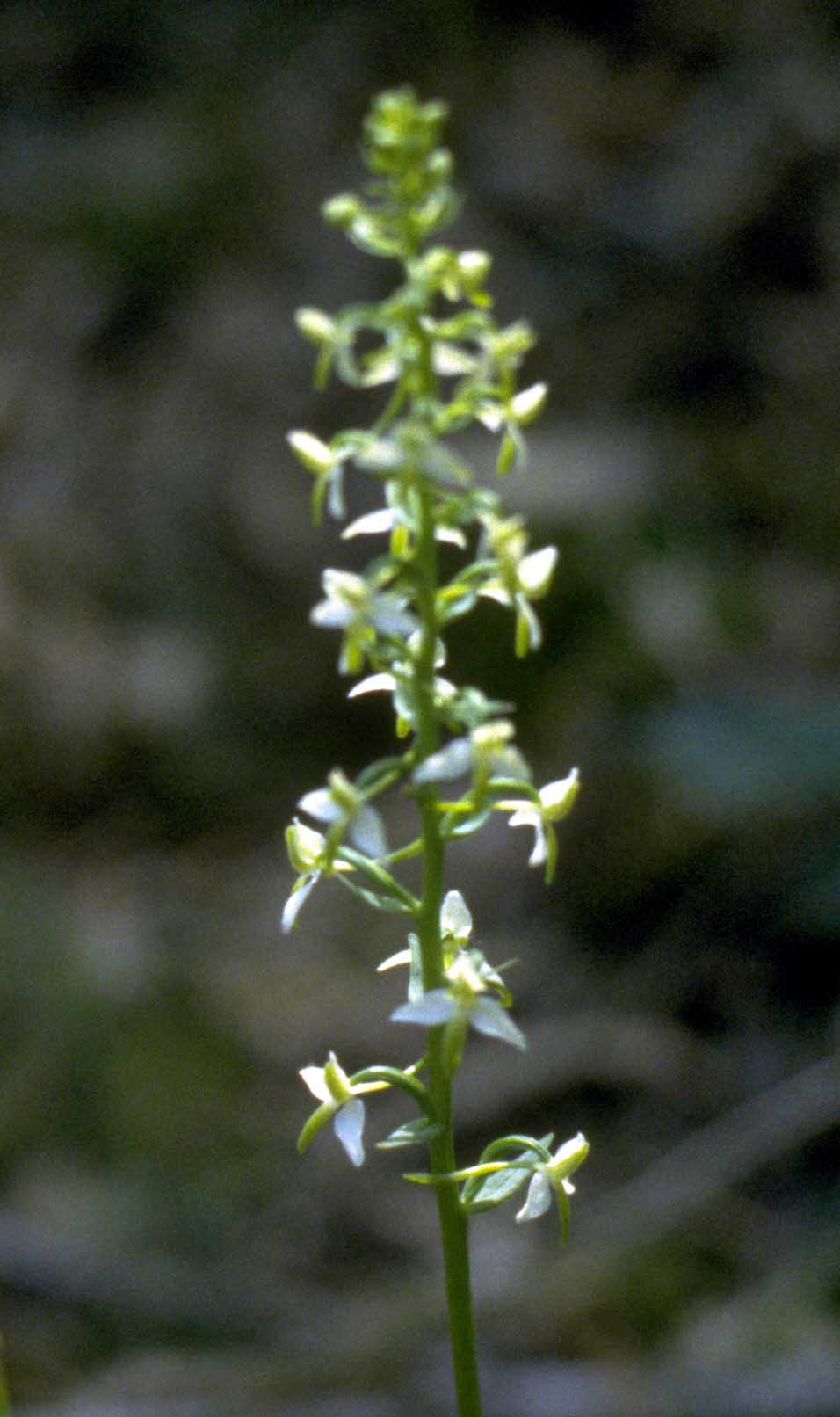 Fiore: l’infiorescenza è una spiga cilindrica, lassa e allungata (fino a 27 cm), con 12-25(-45) fiori, profumati soprattutto di notte, biancastri a volte un po’ verdastri, accompagnati da piccole brattee fogliacee, l’inferiore un po’ più corta del fiore. Sepali laterali espansi, da strettamente ovali a un po’ falciformi, lunghi 9-12 mm, larghi 5-6 mm; sepalo dorsale largamente cordiforme, lungo e largo 6,5-10 mm, connivente in casco con i petali strettamente falciformi, lunghi 6,5-10 mm, larghi 2-3 mm; labello strettamente linguiforme, in genere pendulo, lungo 9-18 mm, largo 2,3-4,2 mm, con la sommità giallo verdastra; sperone lungo e sottile, ottuso alla sommità, lungo 20-41 mm, nettamente più lungo dell’ovario, un po’ curvo a S con la metà superiore più verde; logge polliniche ravvicinate alla base (distanza 0,5-1 mm), ciò che ne fa un carattere distintivo assoluto nei confronti della congenere Platantera verdastra (Platanthera chlorantha (Custer) Rchb) in cui le logge polliniche sono piuttosto divergenti alla base (distanza 2-3 mm).